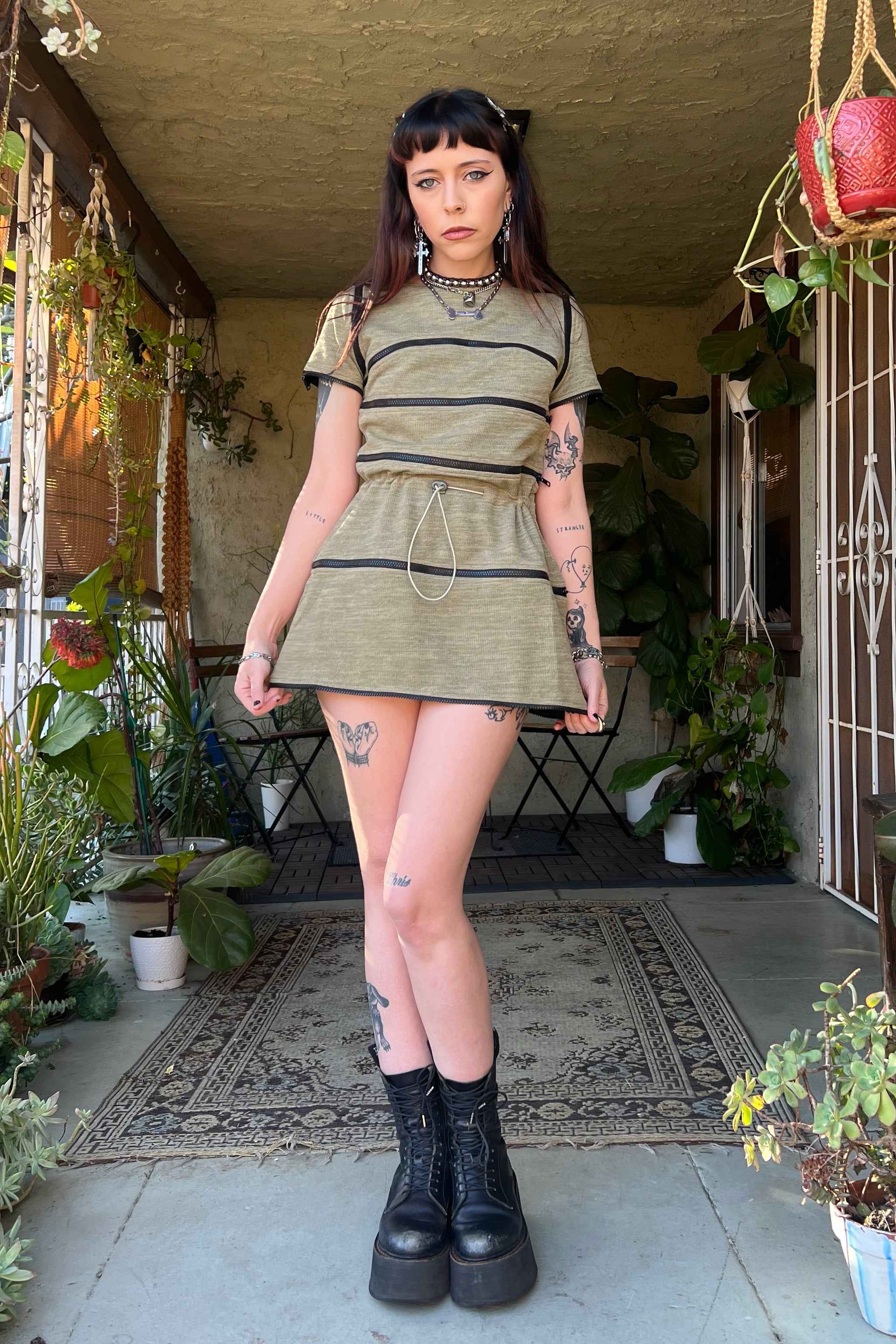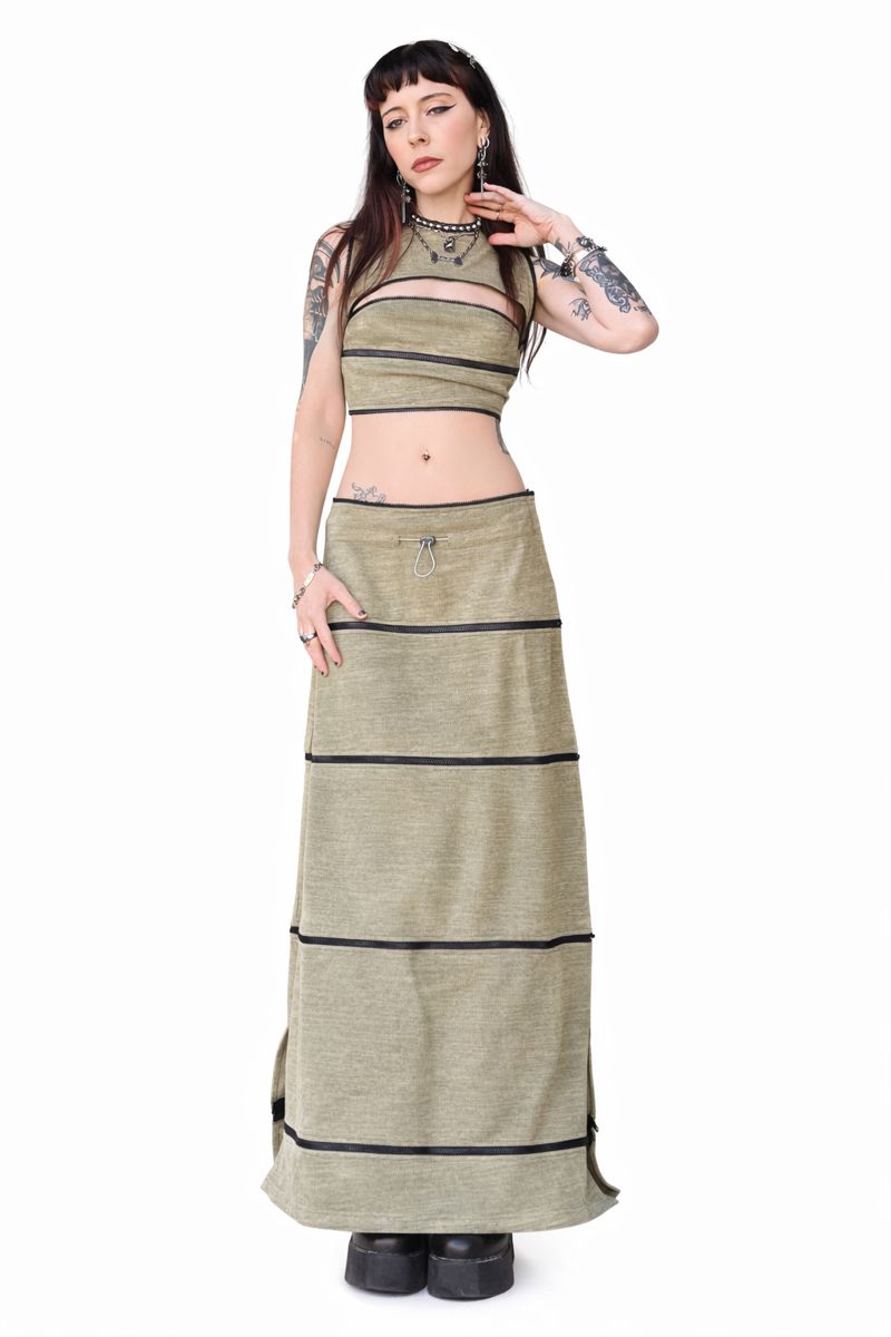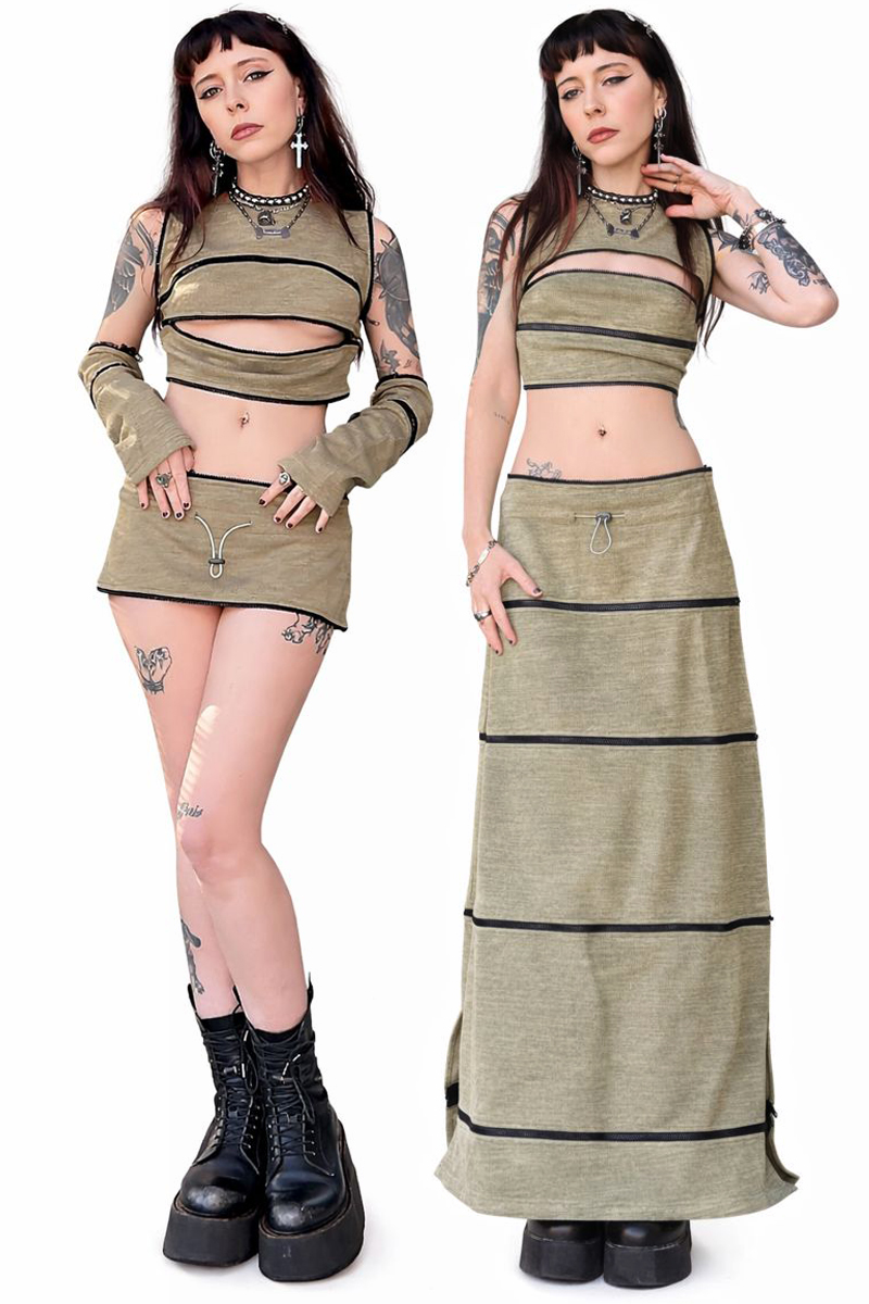 Olive green rib knit maxi dress with convertible zip off panels -- the only garment you'll ever need! Can be worn as: