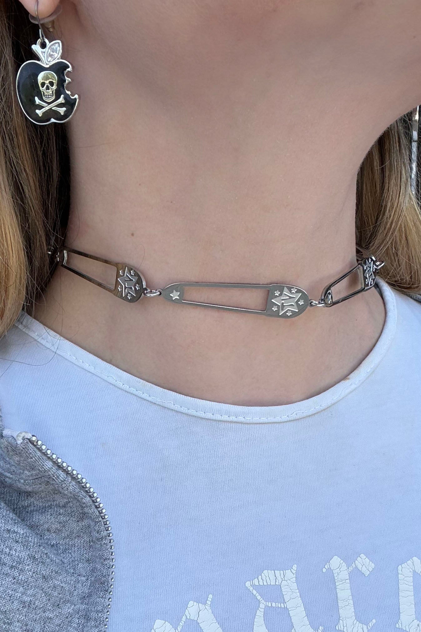 Stainless steel choker with abstract safety pin charms all around!