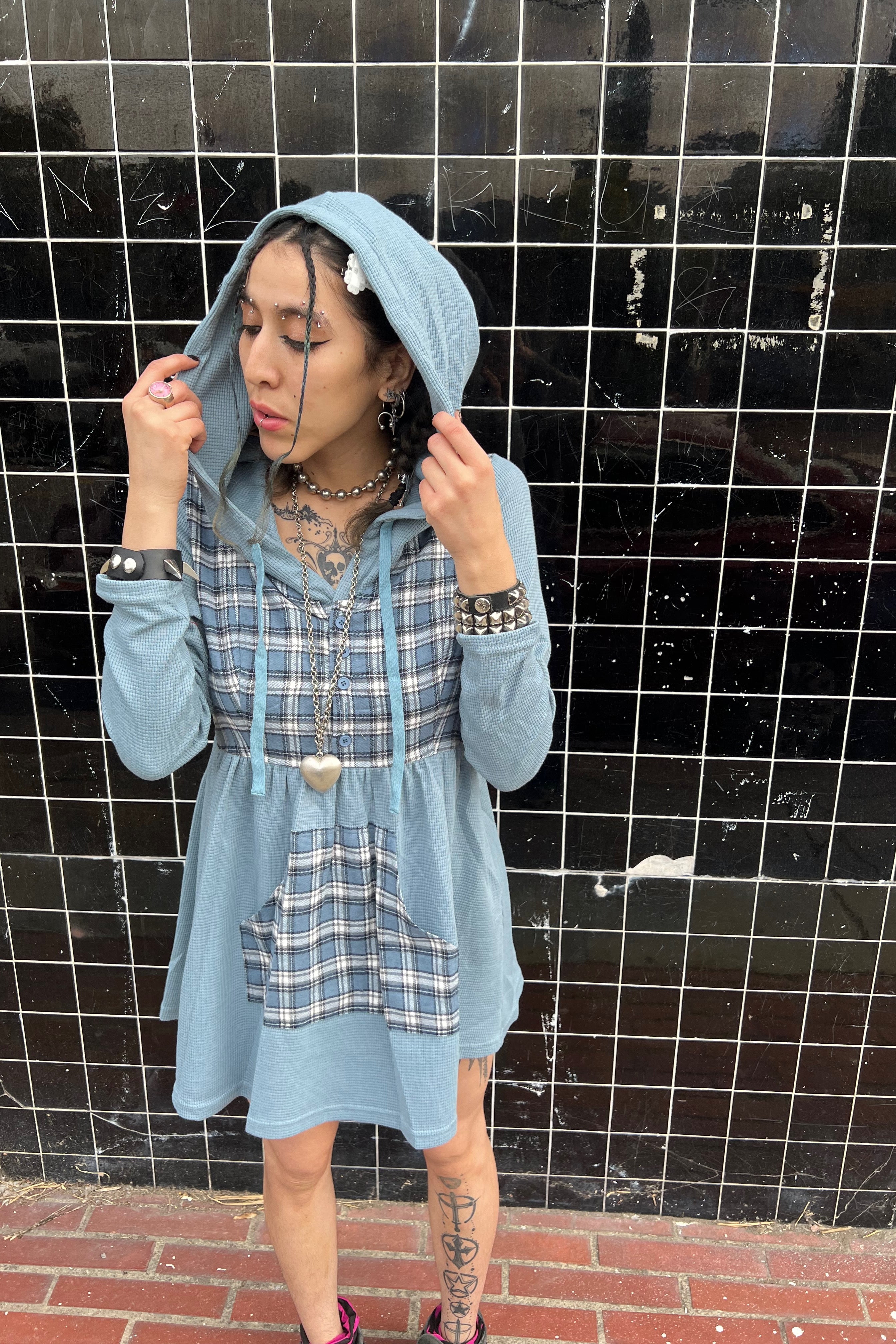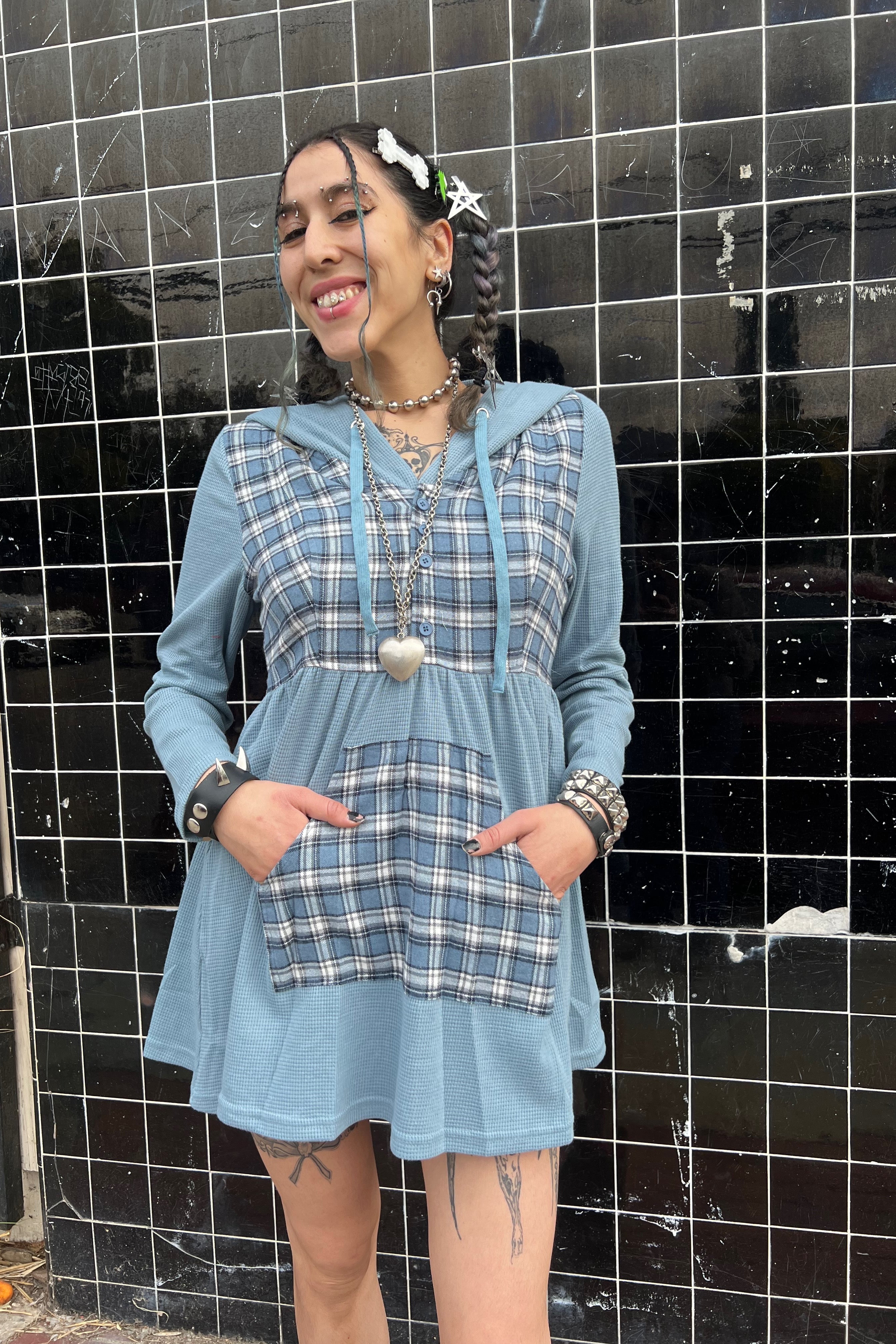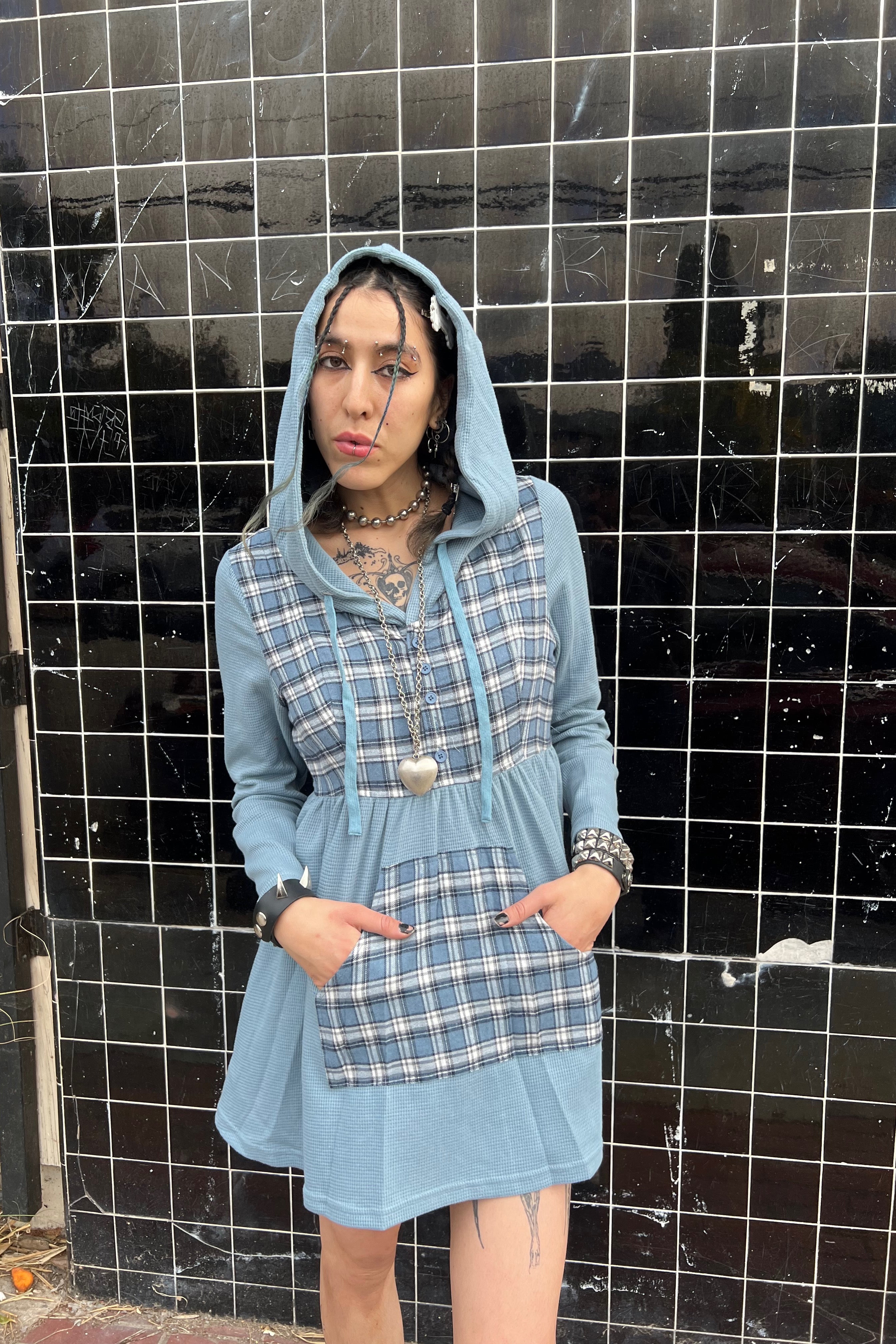 Color block mini dress with hood, front pocket in baby blue and plaid!
