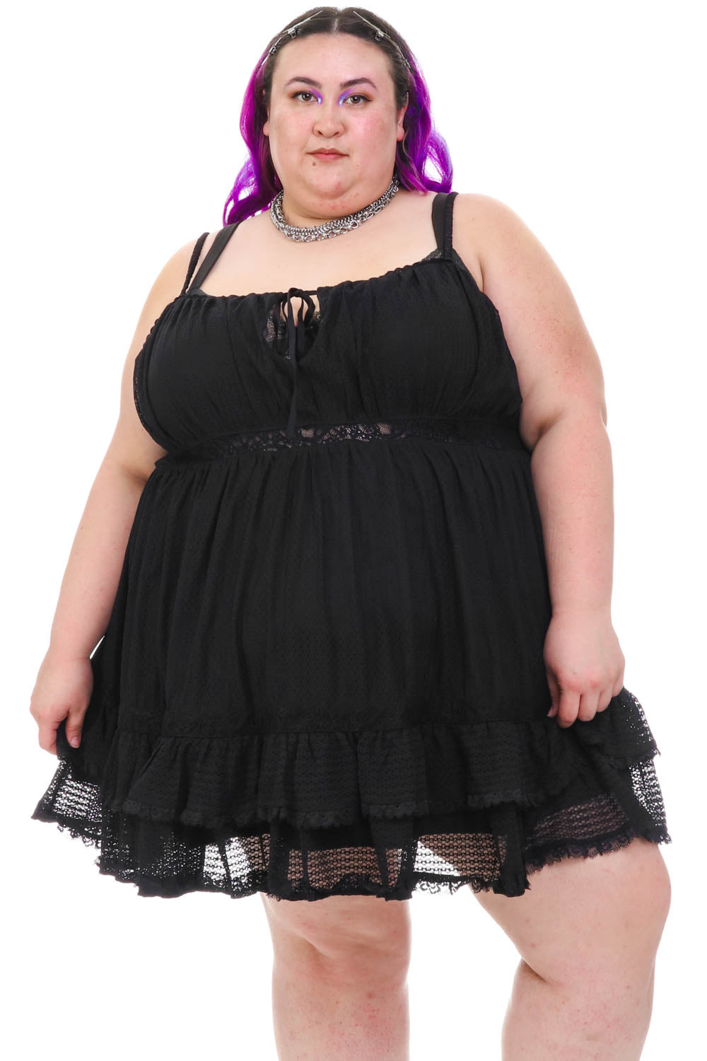 Mini dress with keyhole bust and empire waist in black mesh and lined fabric with lace trim! Adjustable straps!