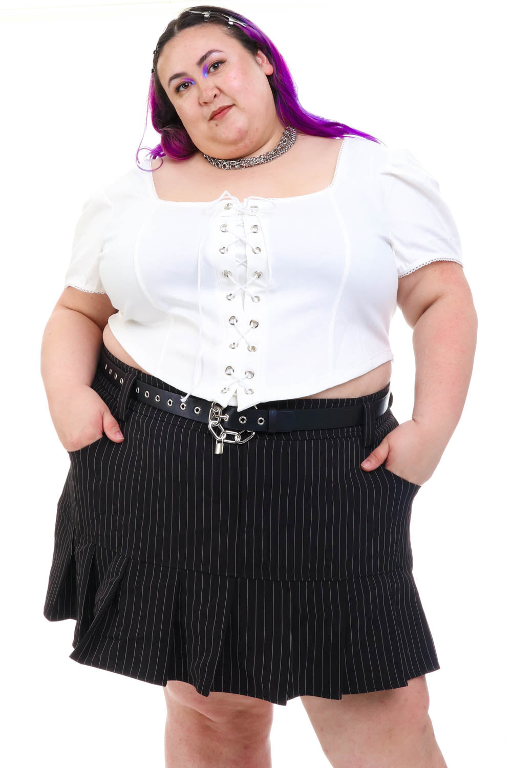 Stretch top with princess puff sleeves and corset lacing up front! Zipper closure at side.