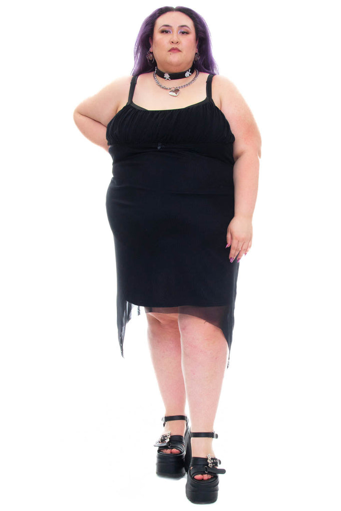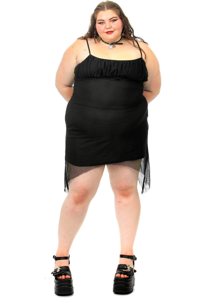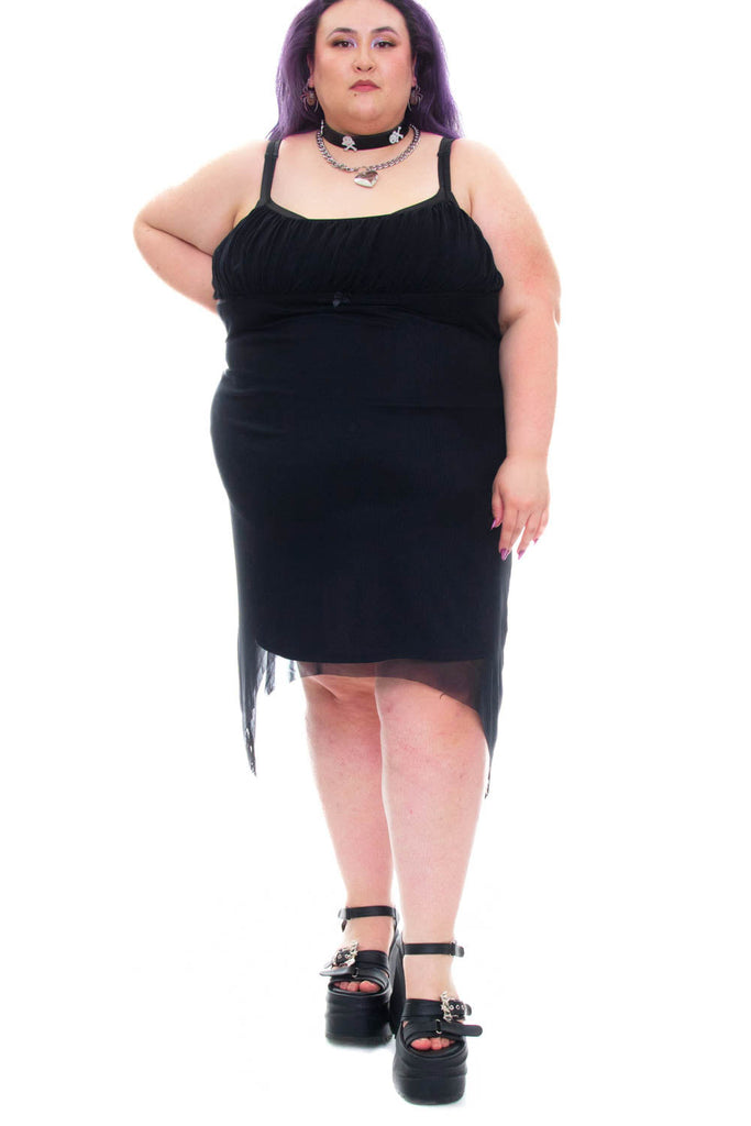 Empire-waist dress with ruched bust and ribbon and bow tie accent at front! Asymmetric hem, plus attached lining and adjustable lingerie straps.