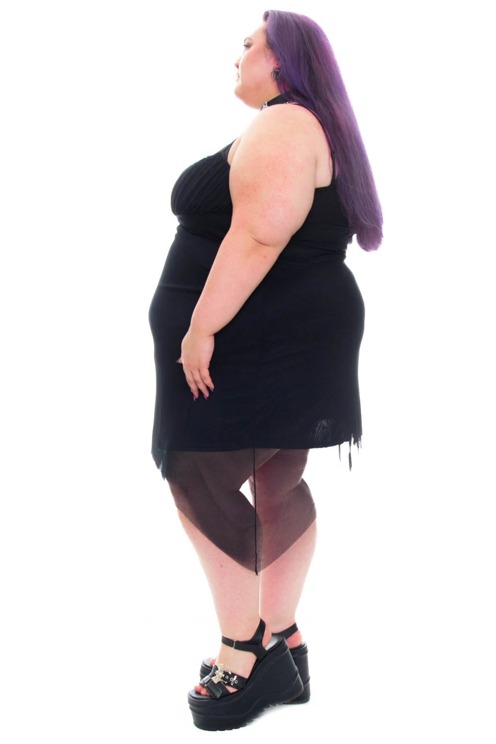 Our model Abbey is 5'6" with 52" chest, 47" waist, and 59" hips; she usually wears size 4X and is pictured in a size 4X.