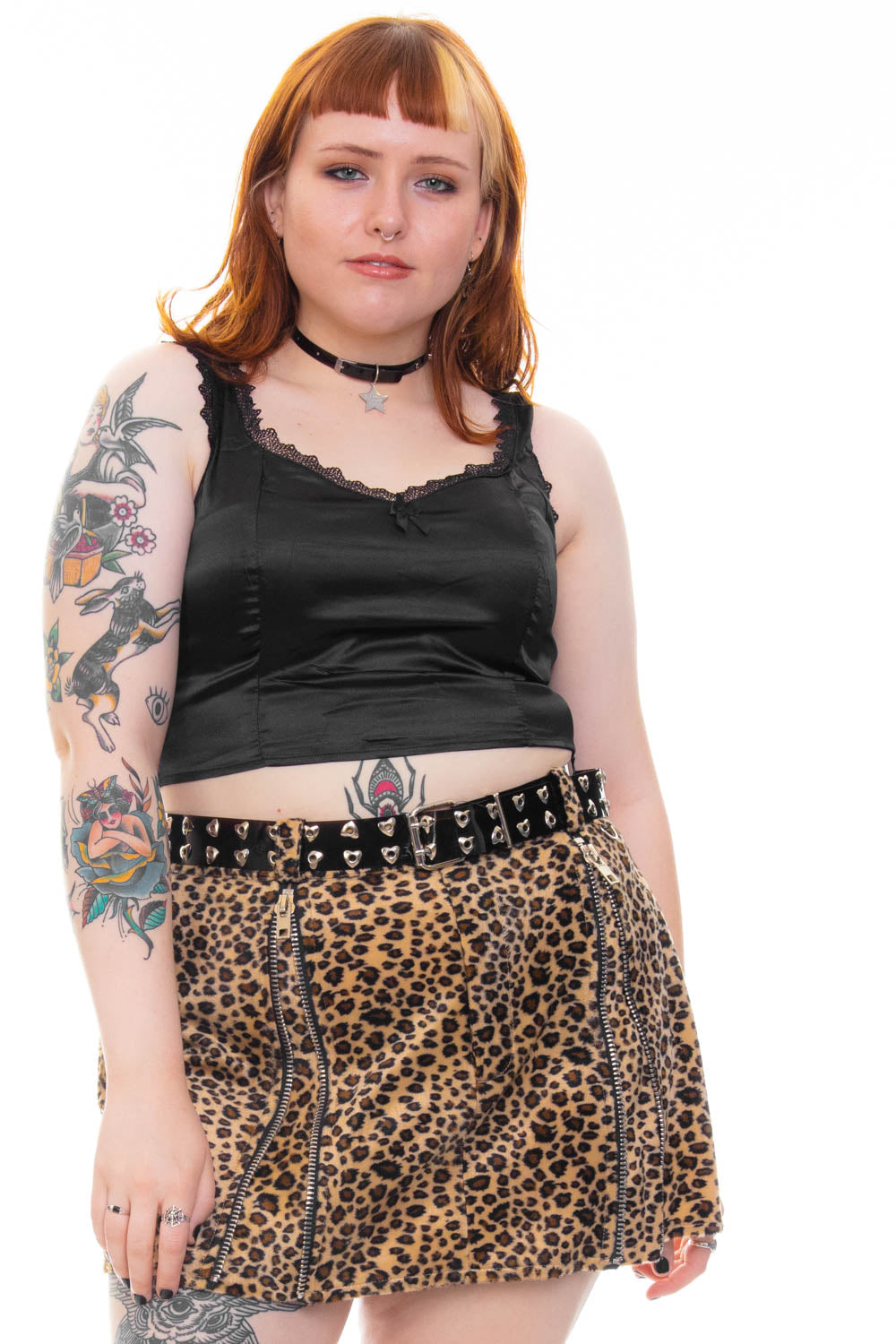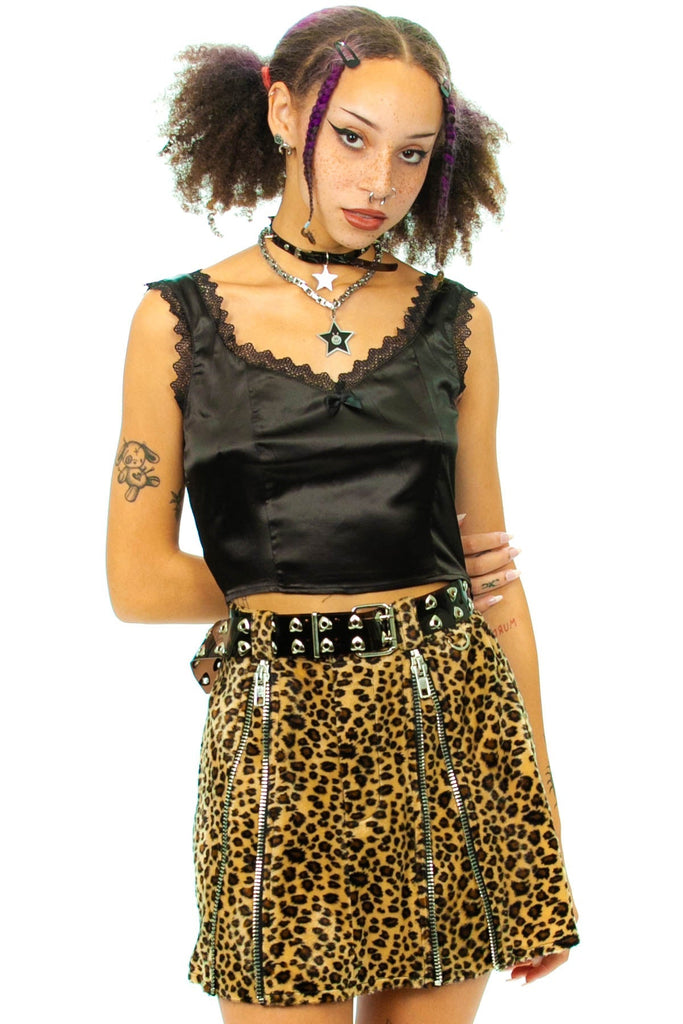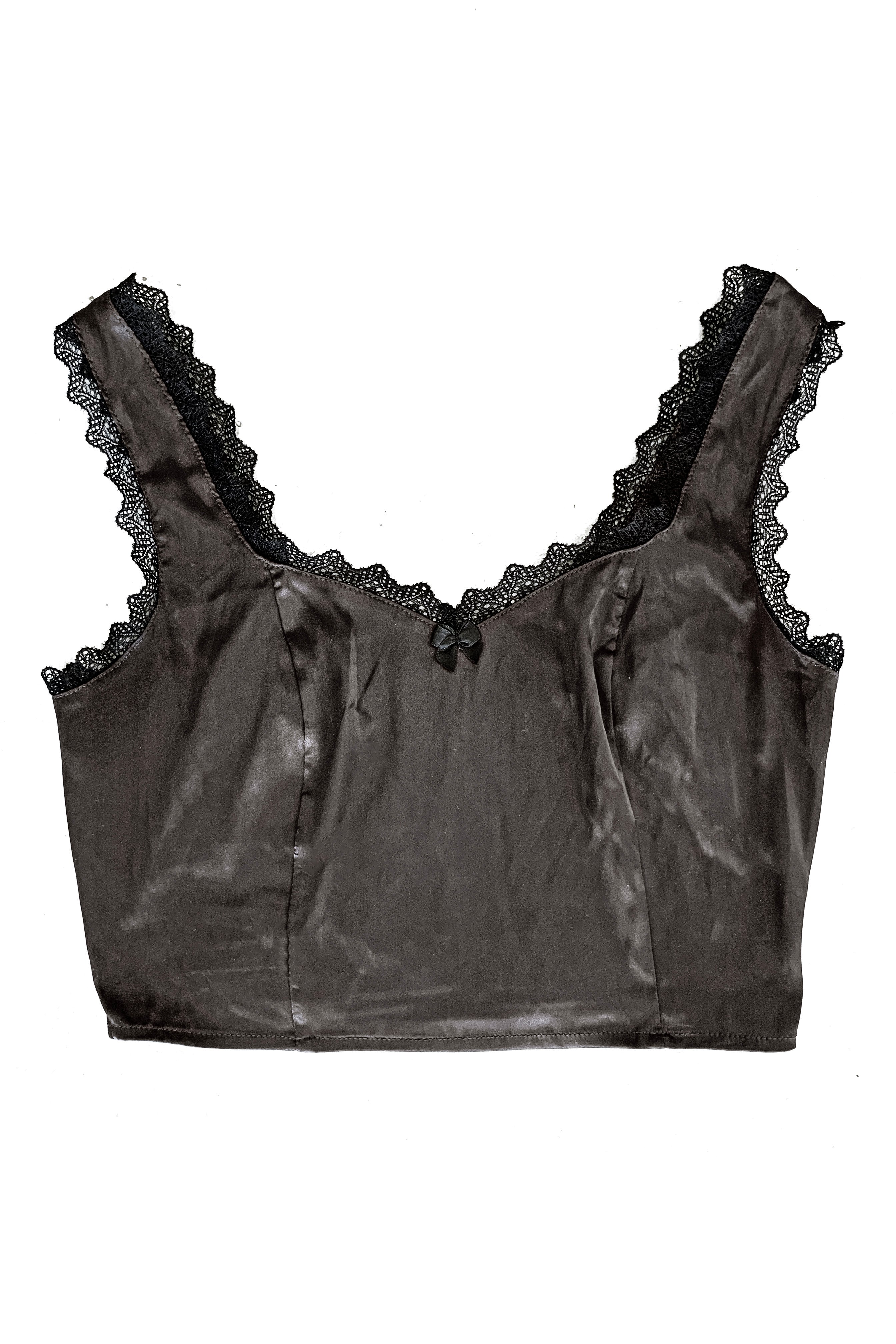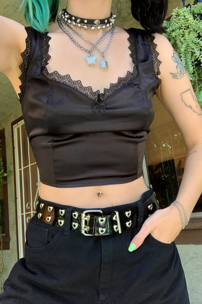 Lingerie-look crop top with zipper closure at side and lace trim! Bow applique at center front.