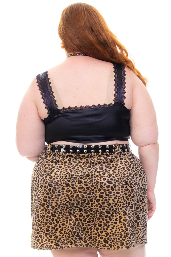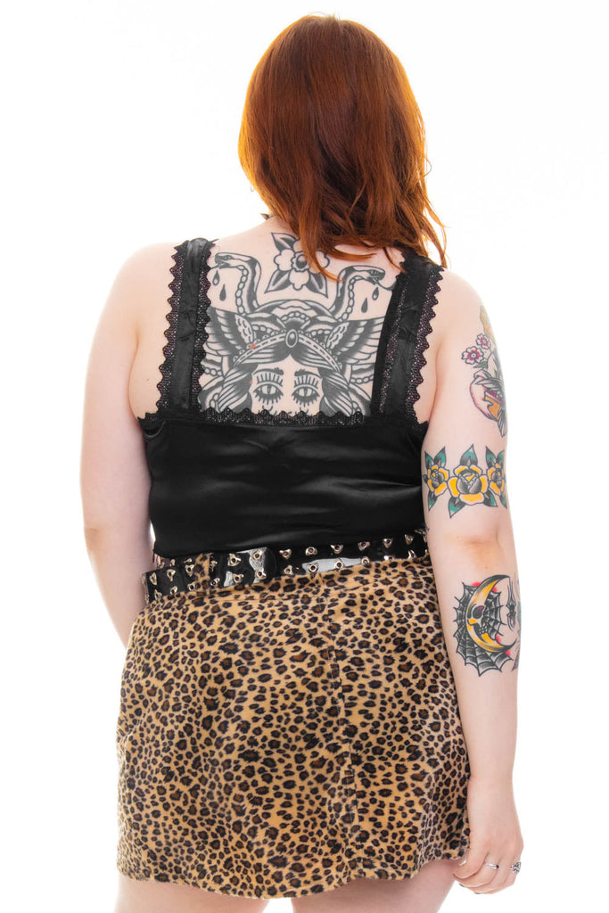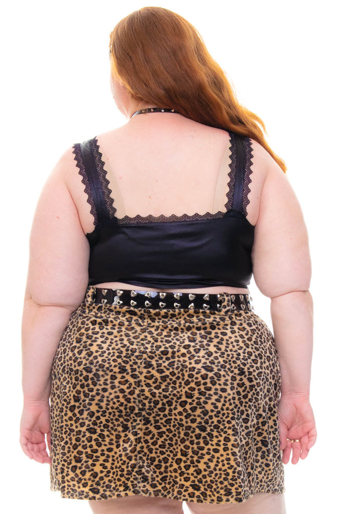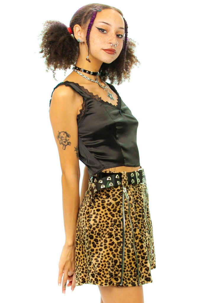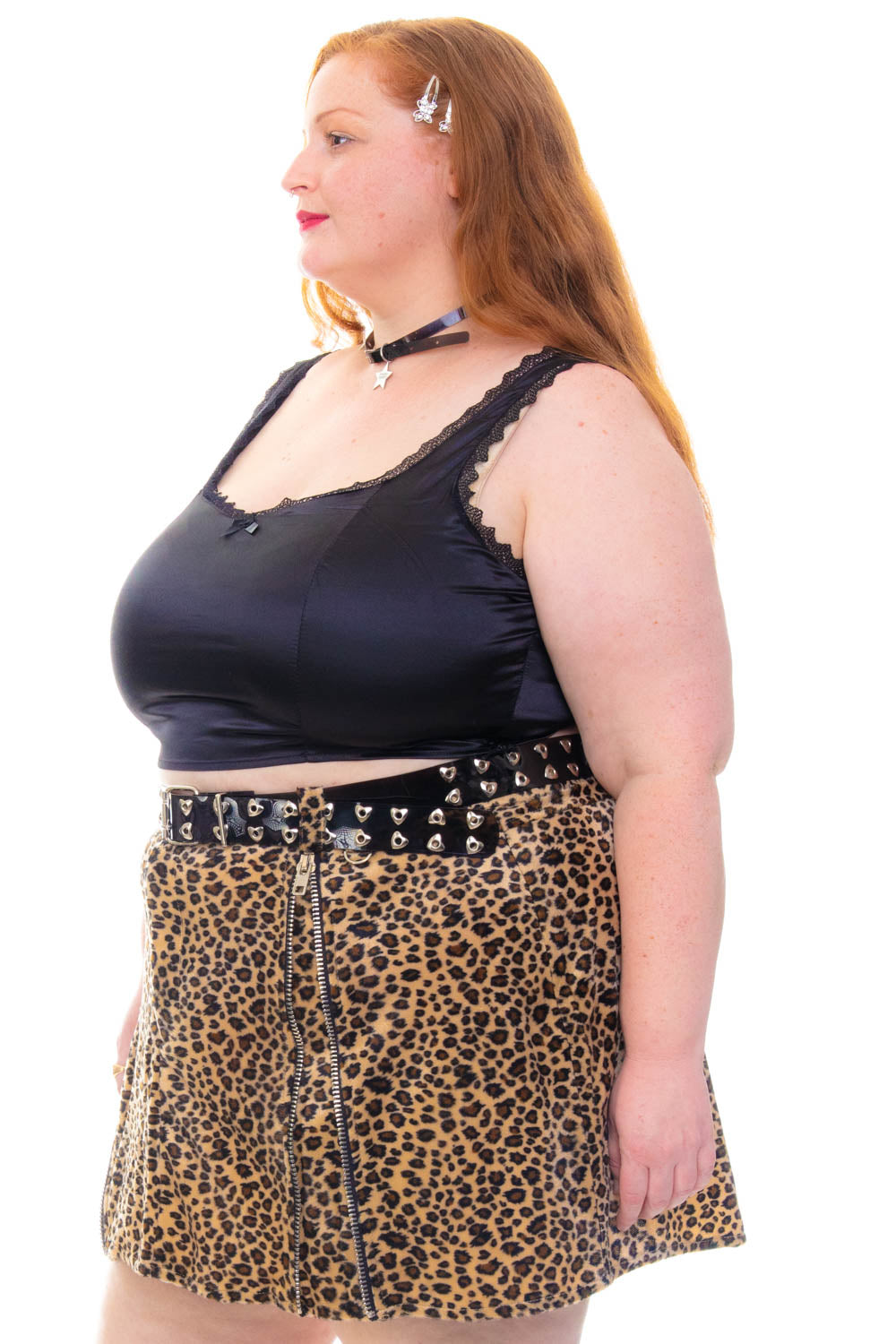 Lingerie-look crop top with zipper closure at side and lace trim! Bow applique at center front.