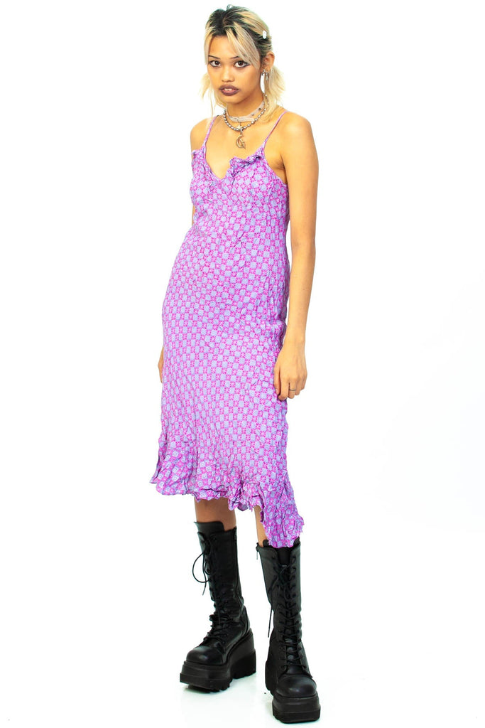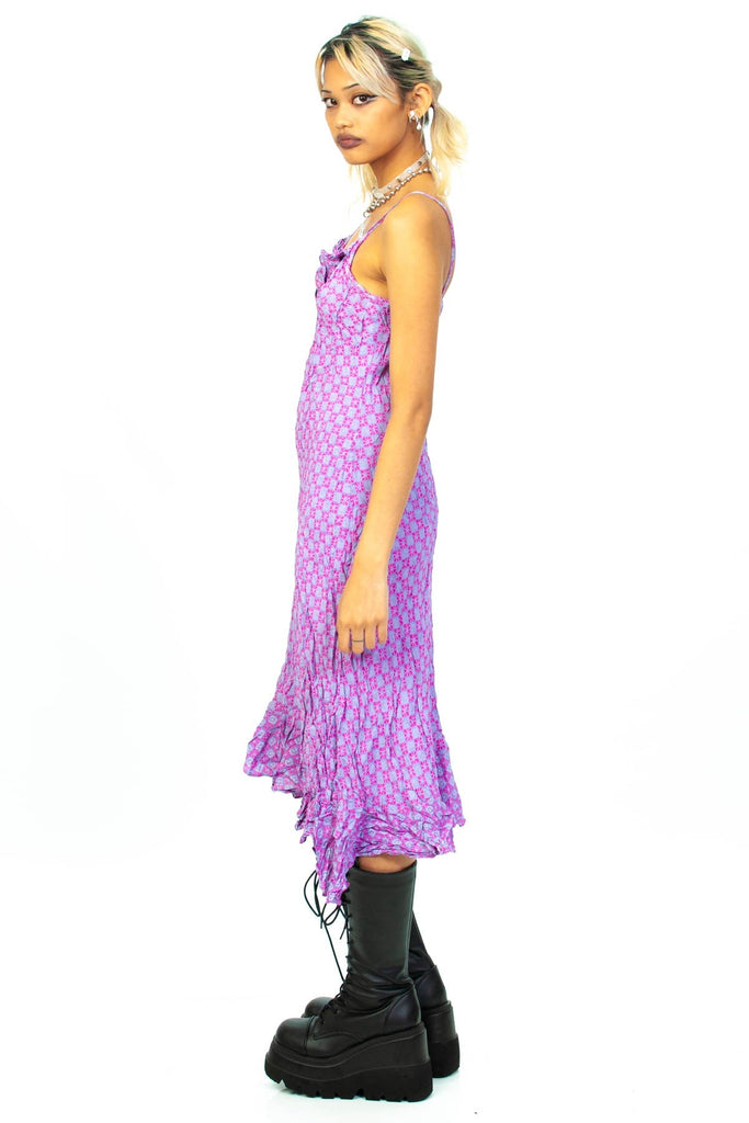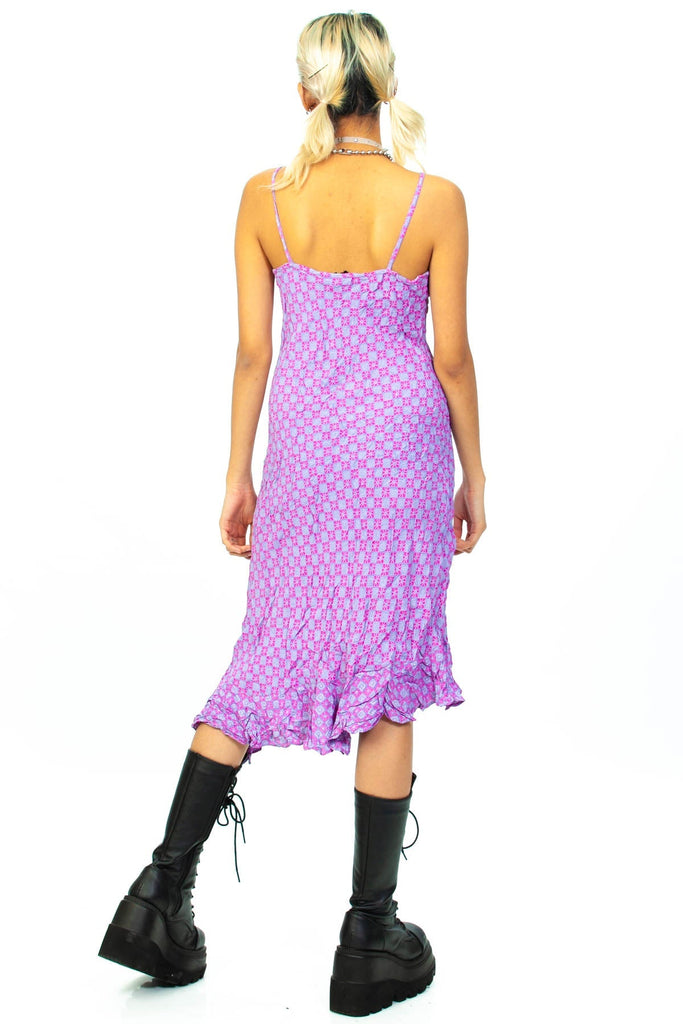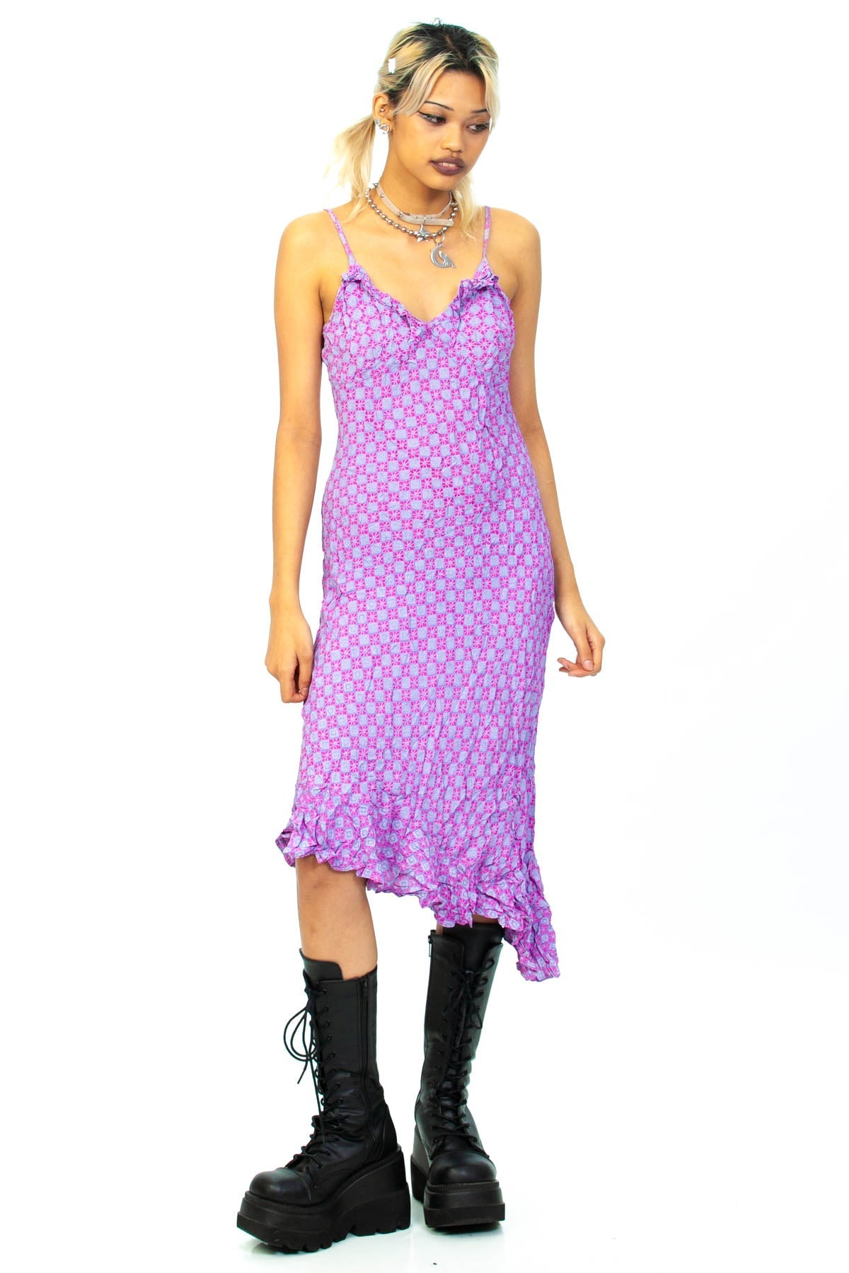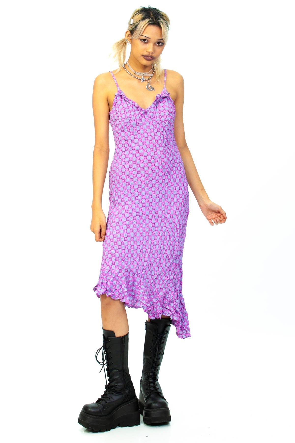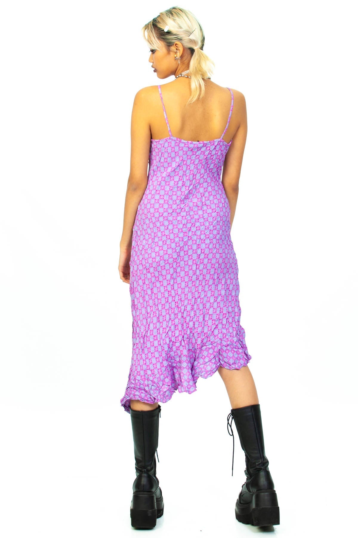 Cute asymmetric hem dress with spaghetti straps and little boxy lavender pattern throughout!
