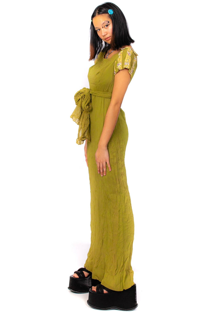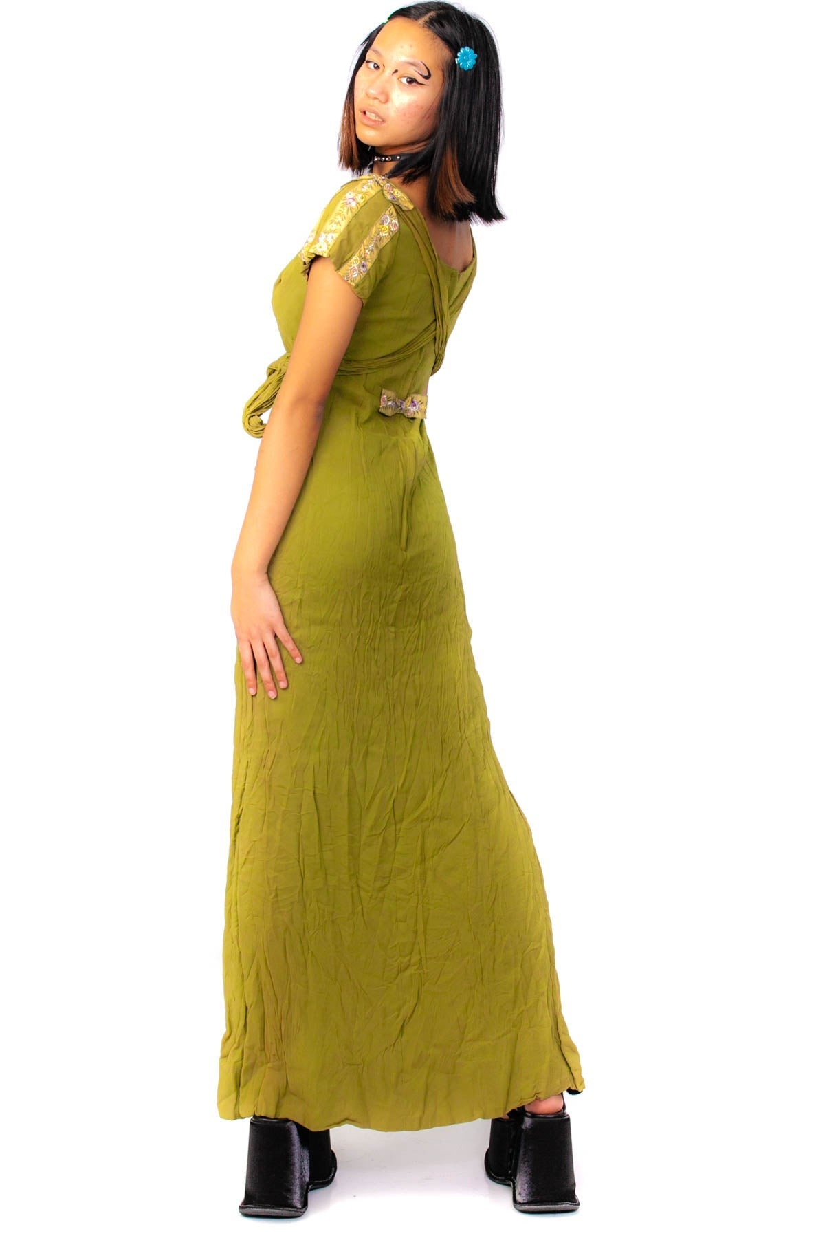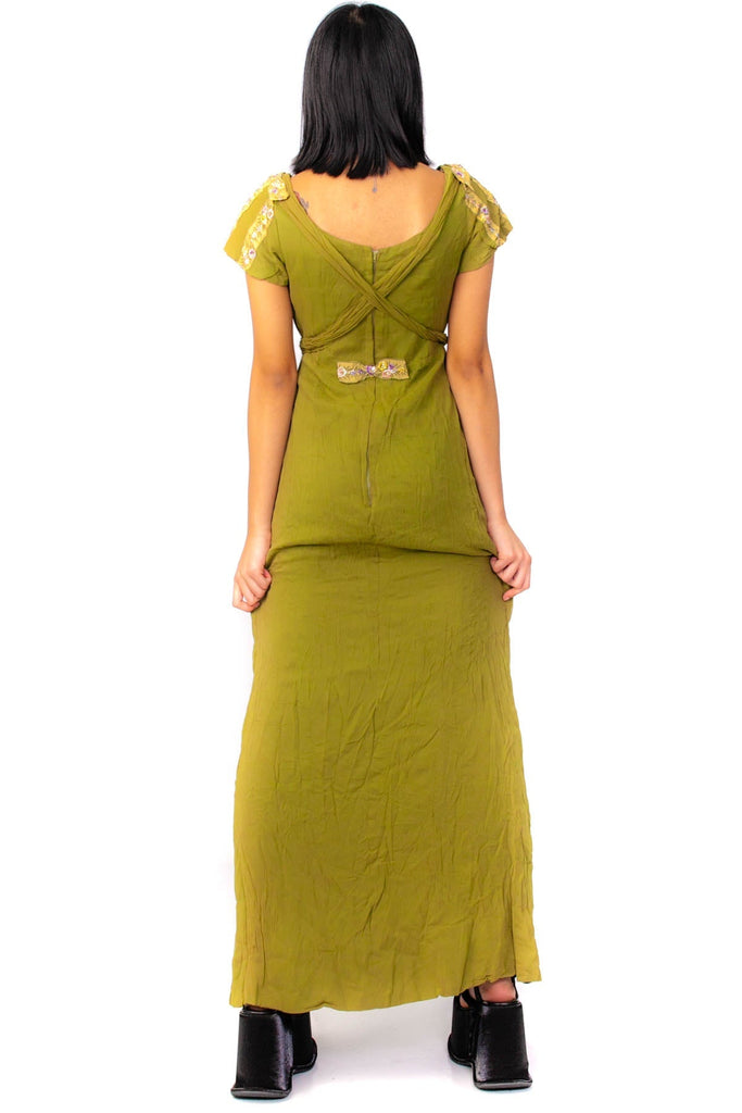 Avocado green maxi dress with back zipper closure! Floral embroidered ribbon trim.