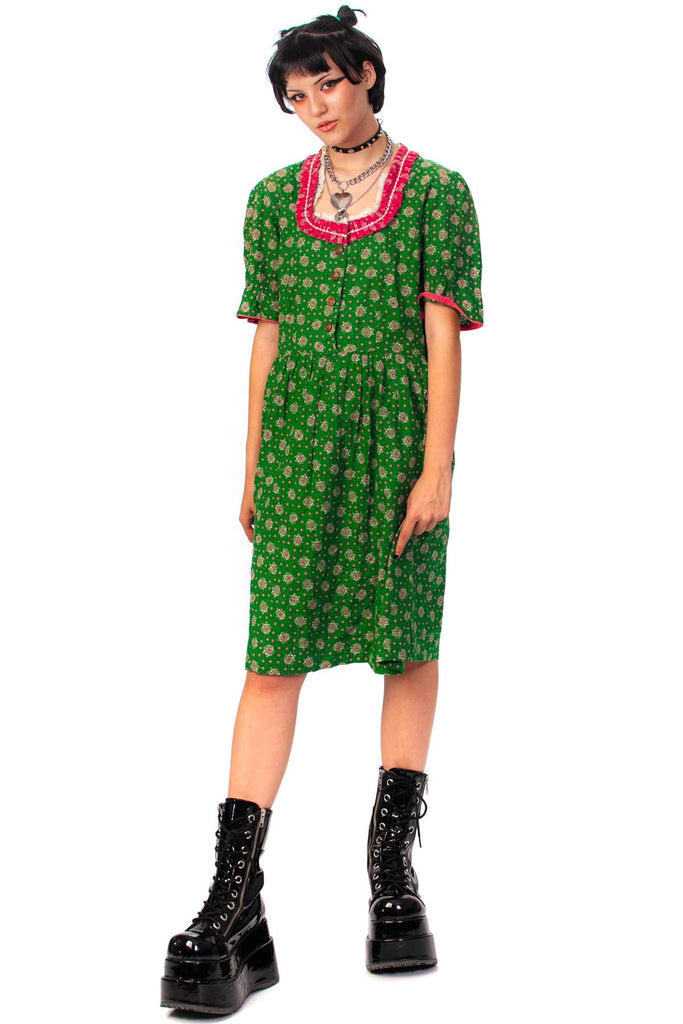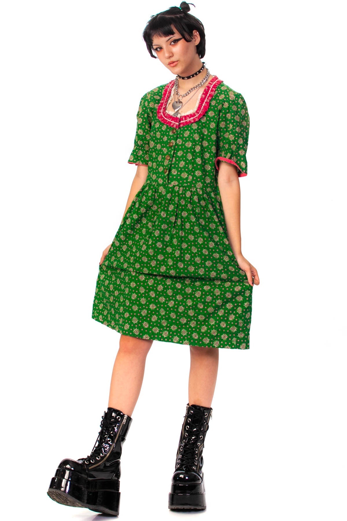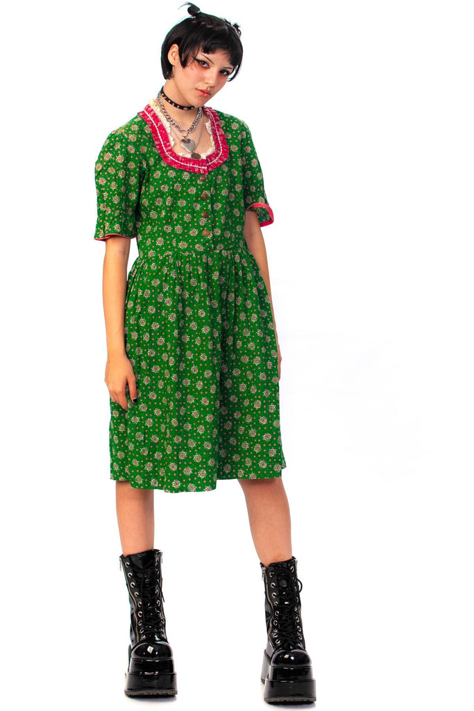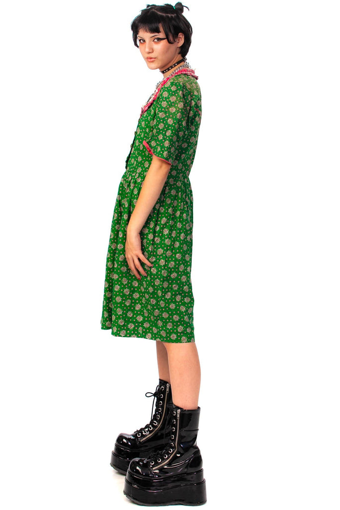 Green knee-length dress with pink and white heart print allover! Button closure at chest, plus pink ruffle trim.