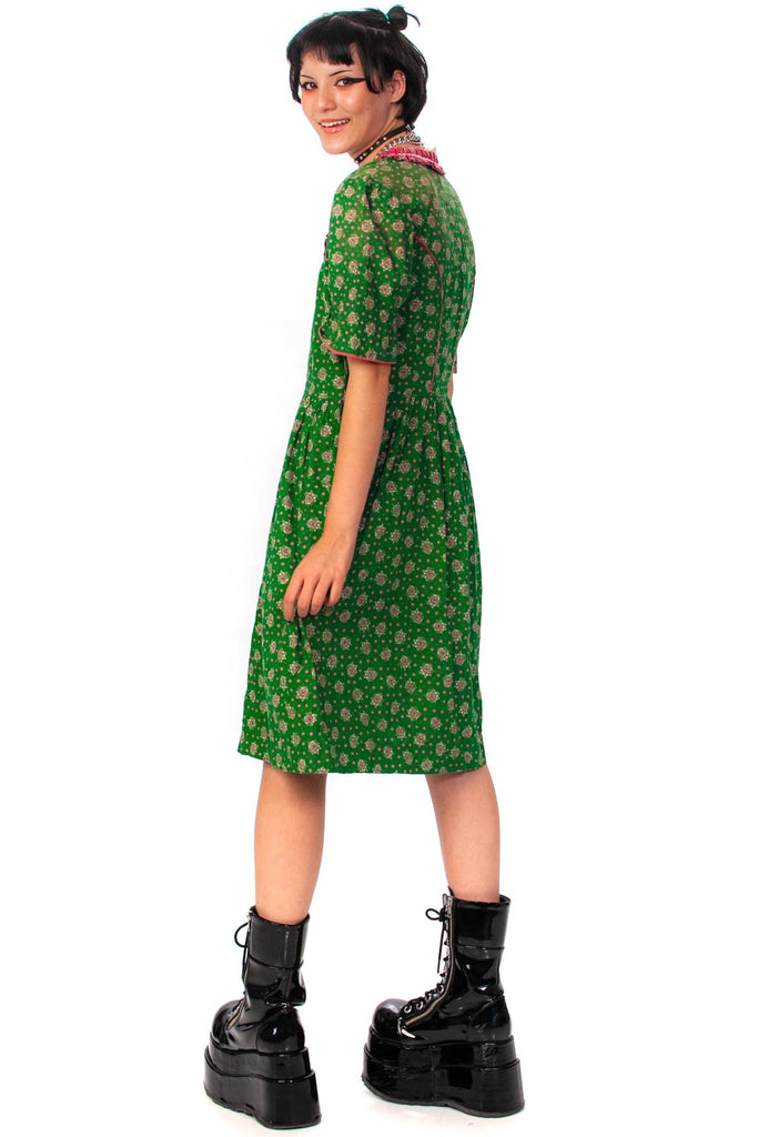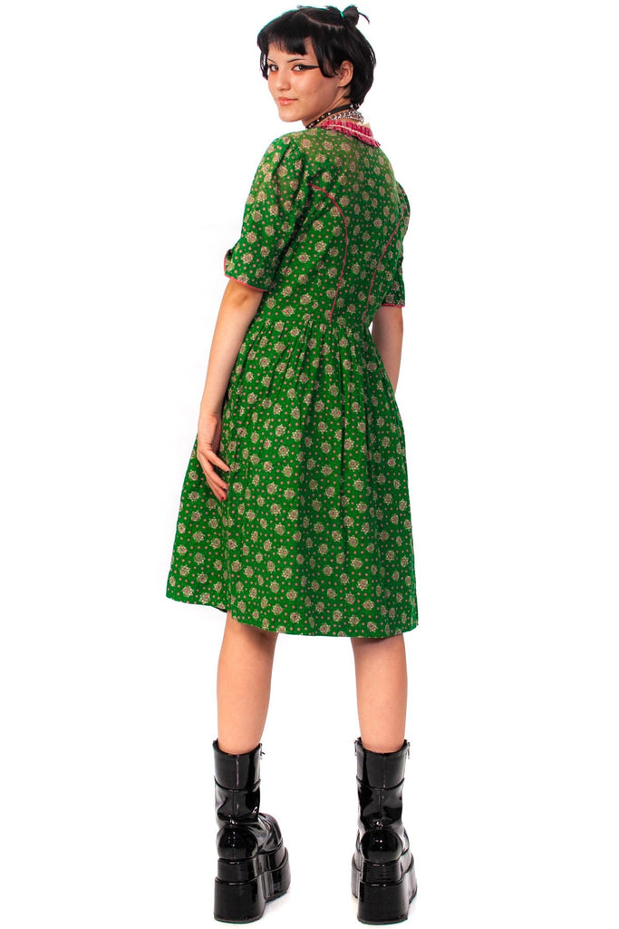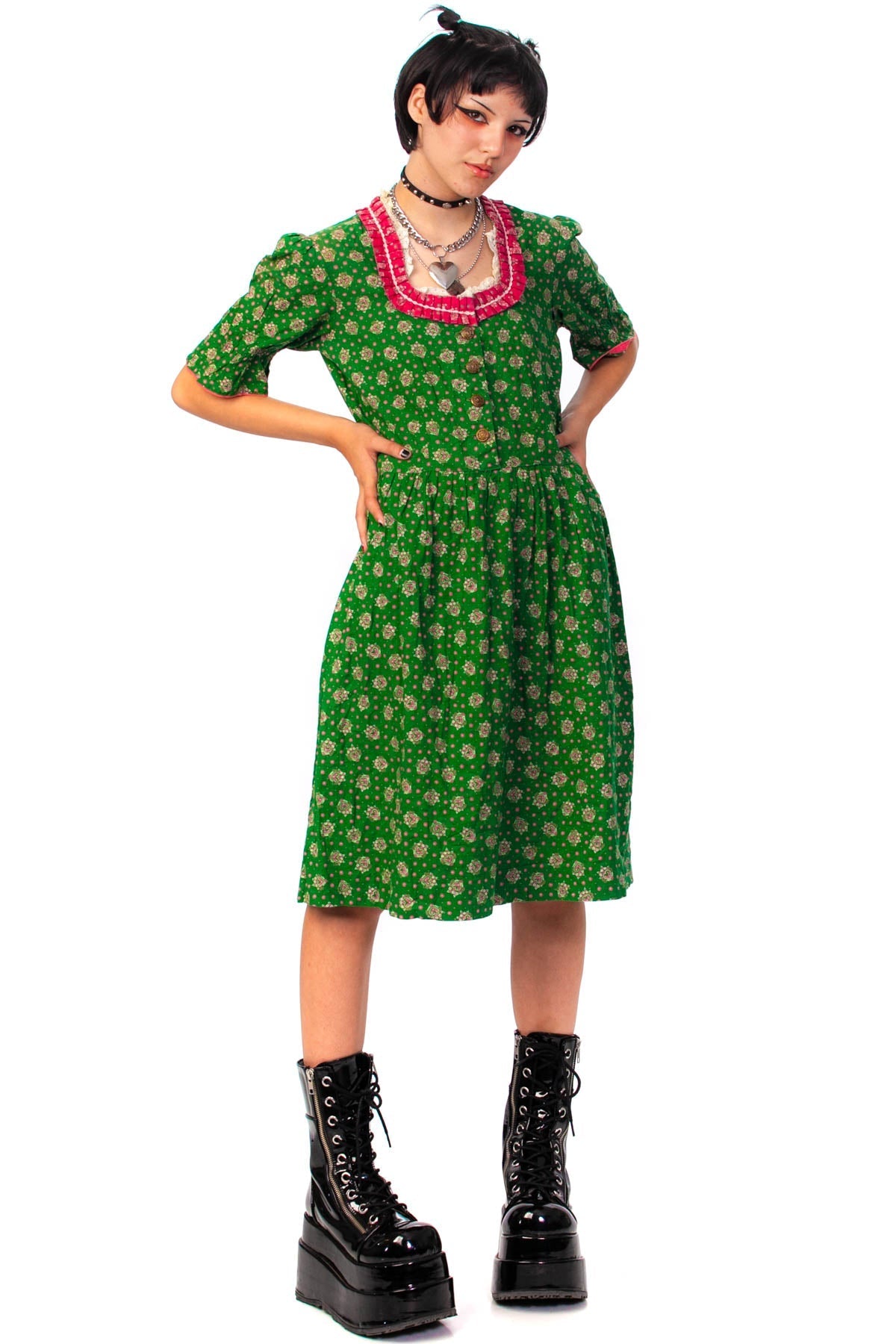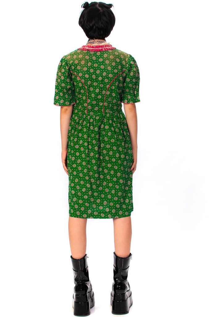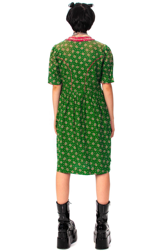 Green knee-length dress with pink and white heart print allover! Button closure at chest, plus pink ruffle trim.
