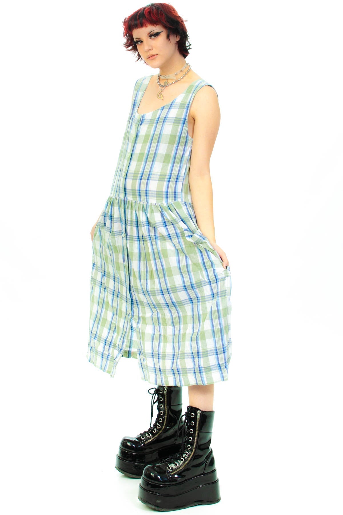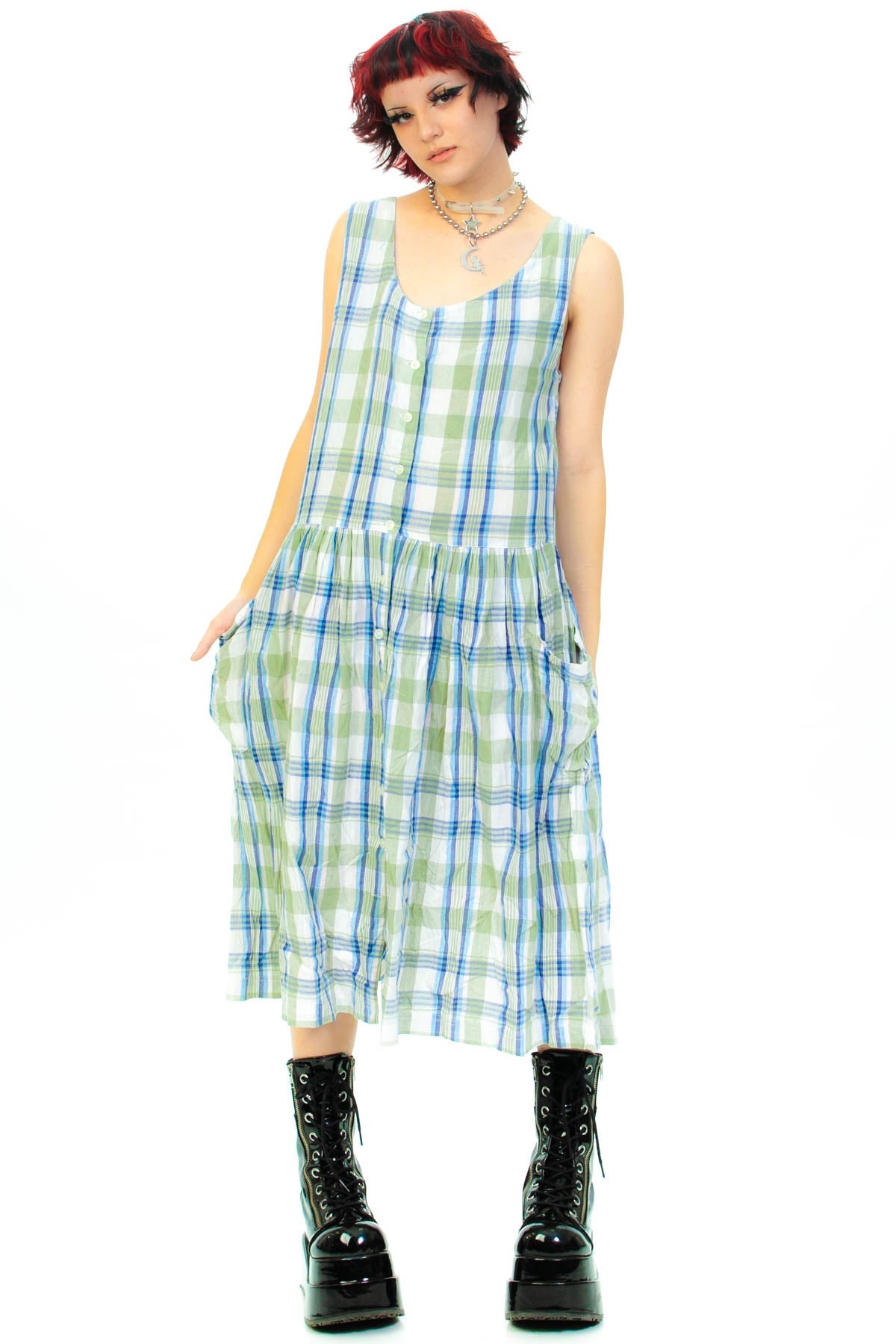 Classic cute 90's jumper dress with pale green, blue and white plaid. Button up closure with front pockets!