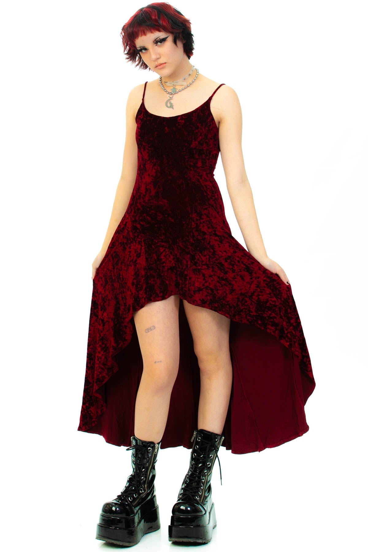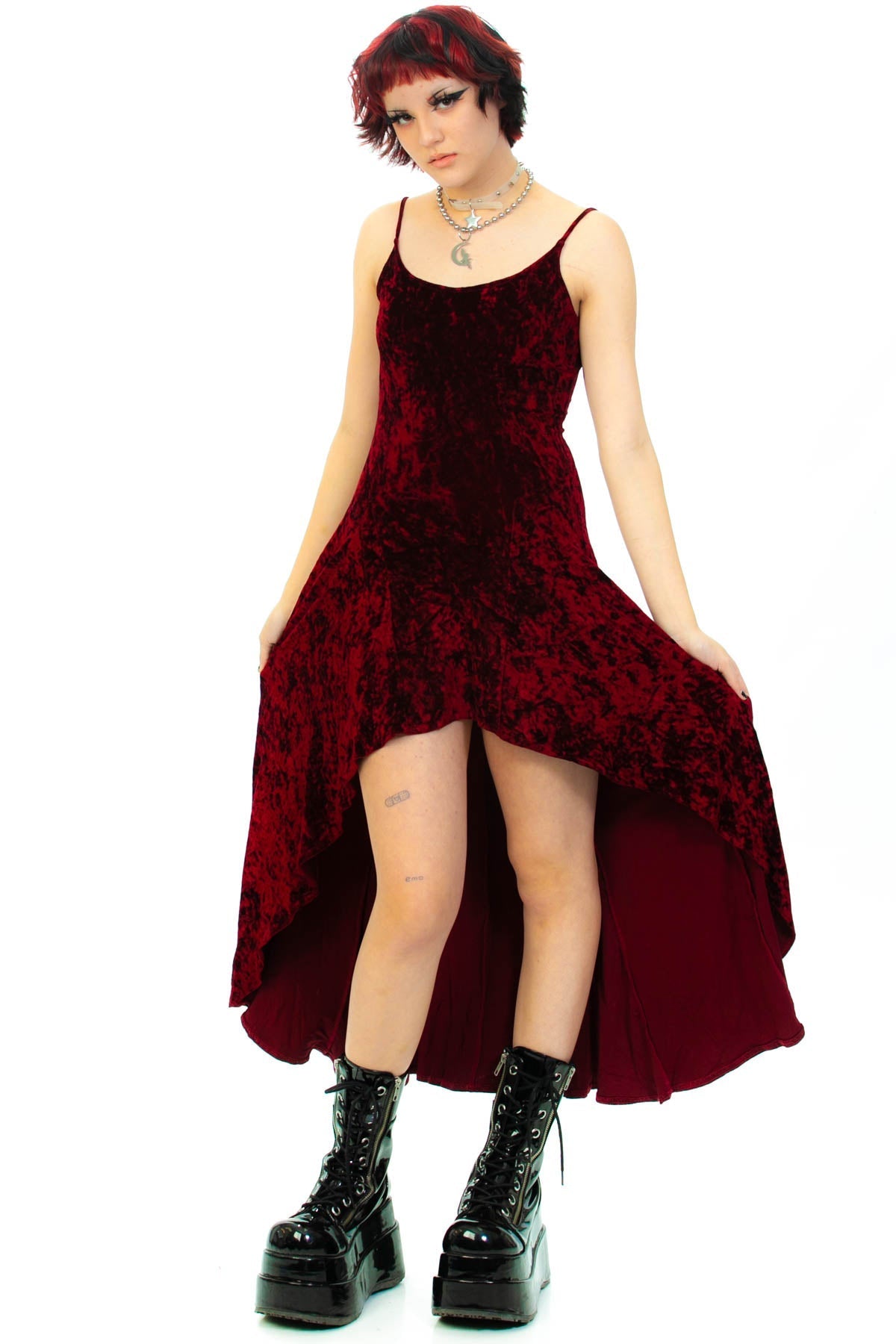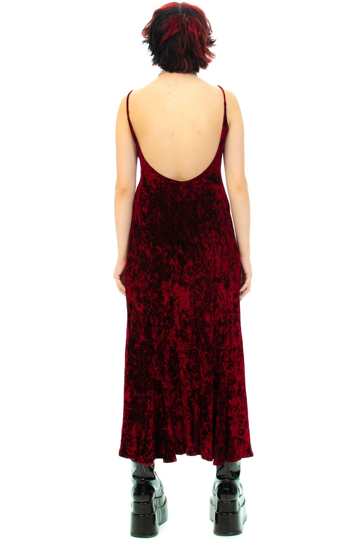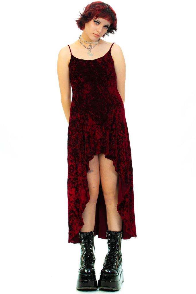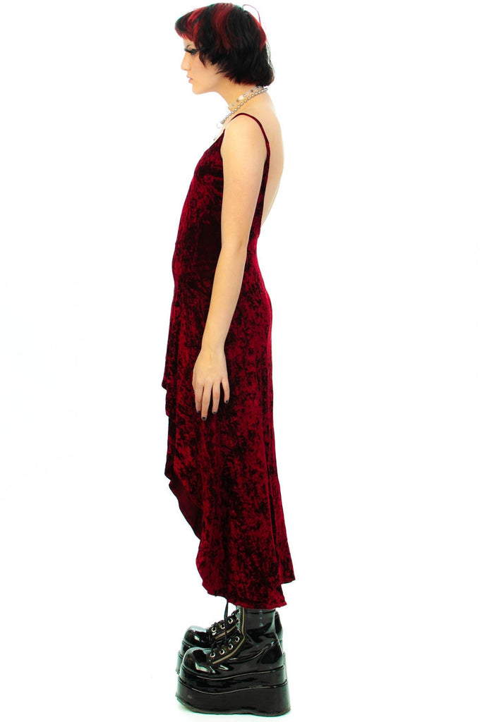90's burgundy crushed velvet spaghetti strap dress with a scooped bottom hem that rises in the center and scoop back!
