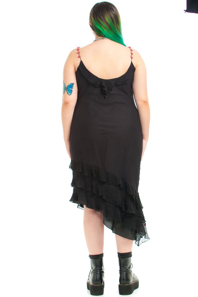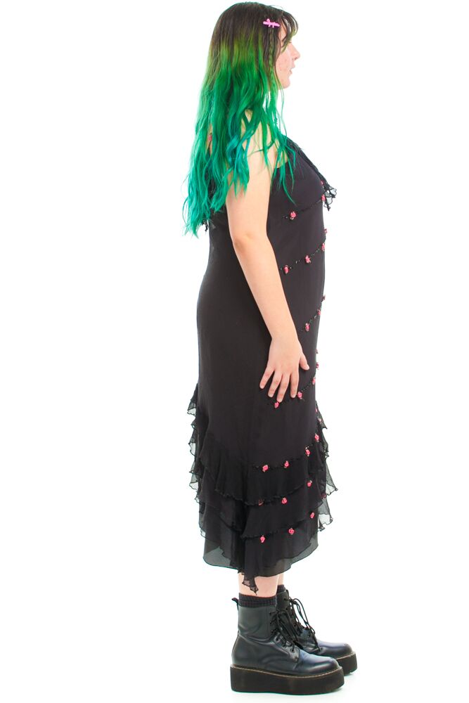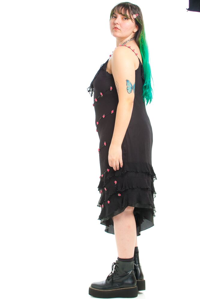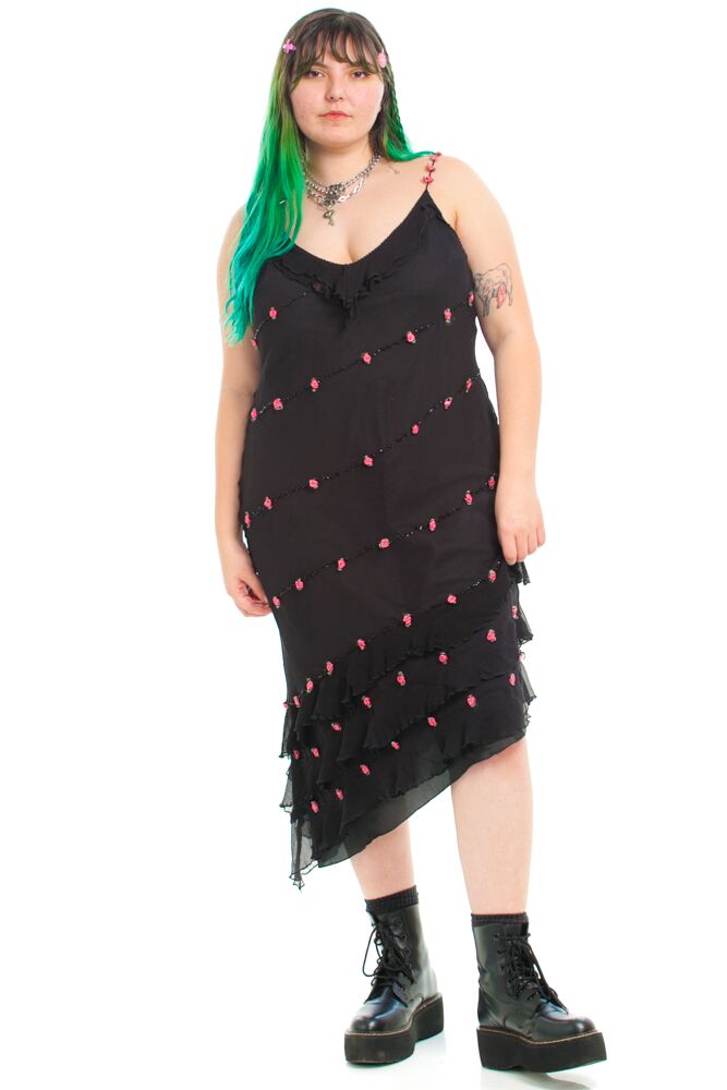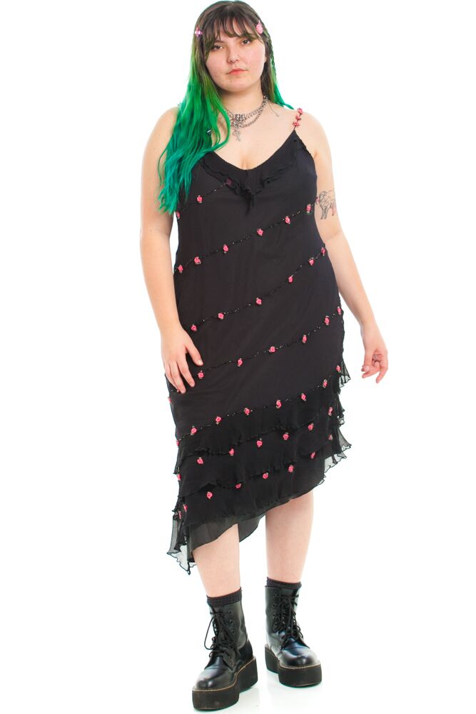 Black stretch slip-style asymetrical midi dress with pink rose and black embriodery detail all along the dress! Pink rose lining straps.