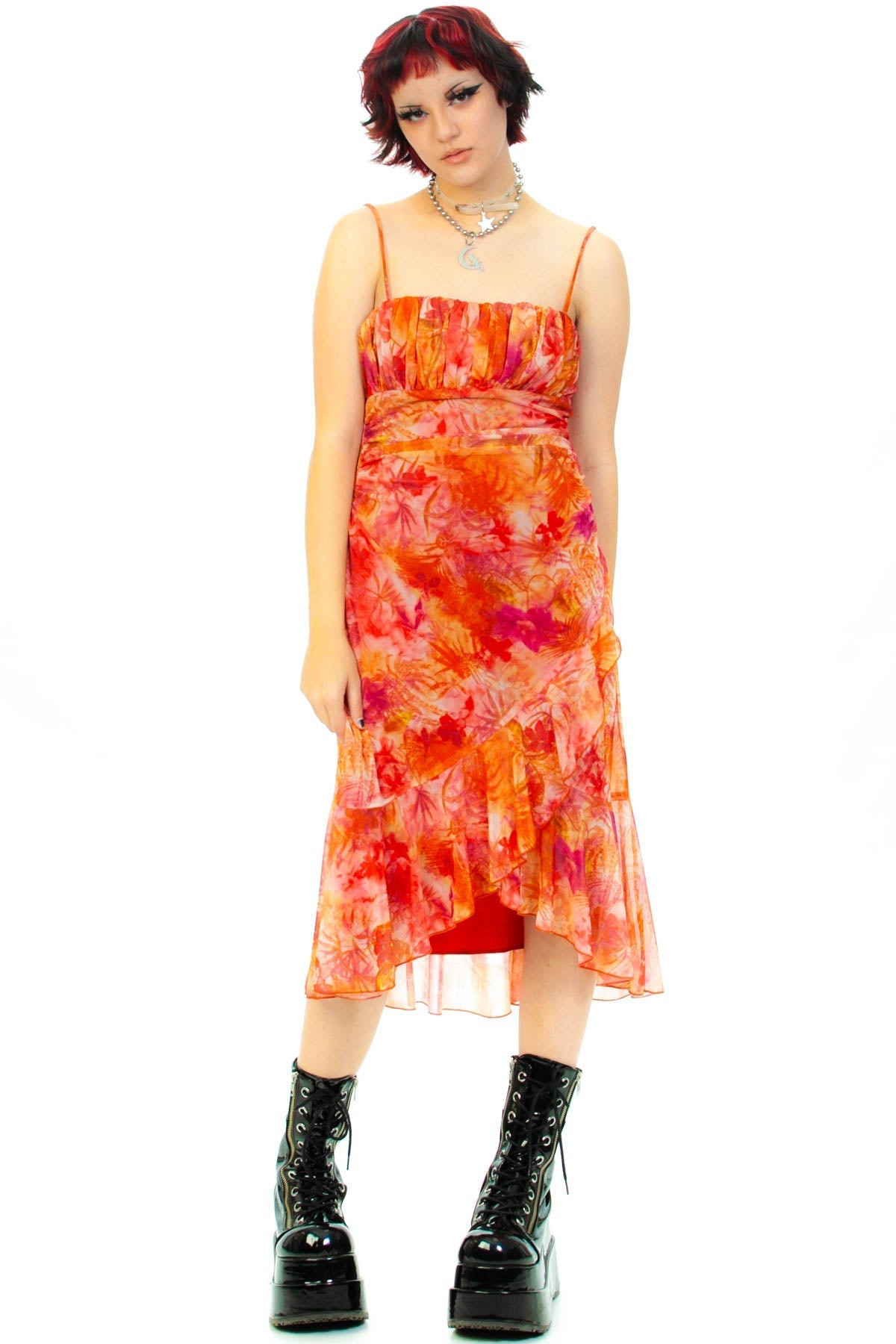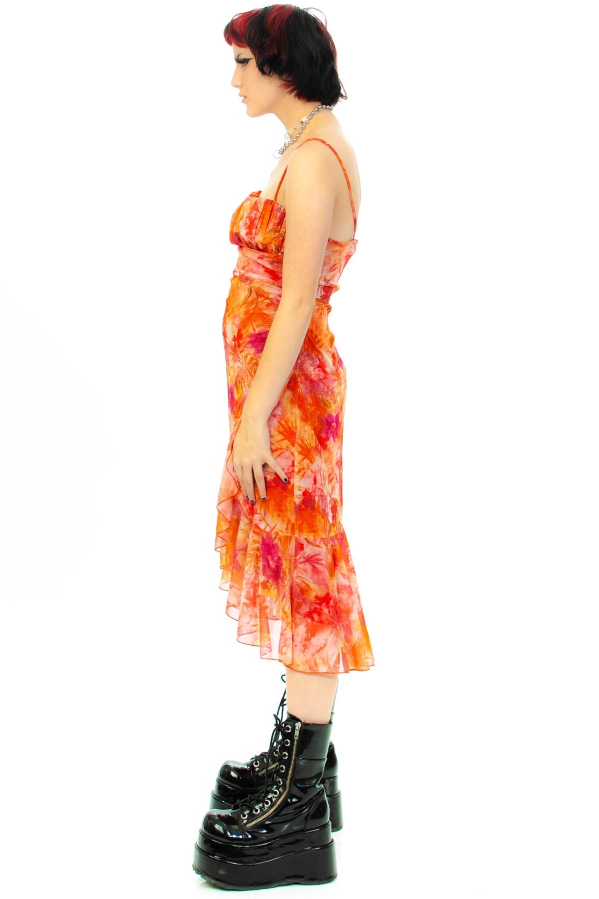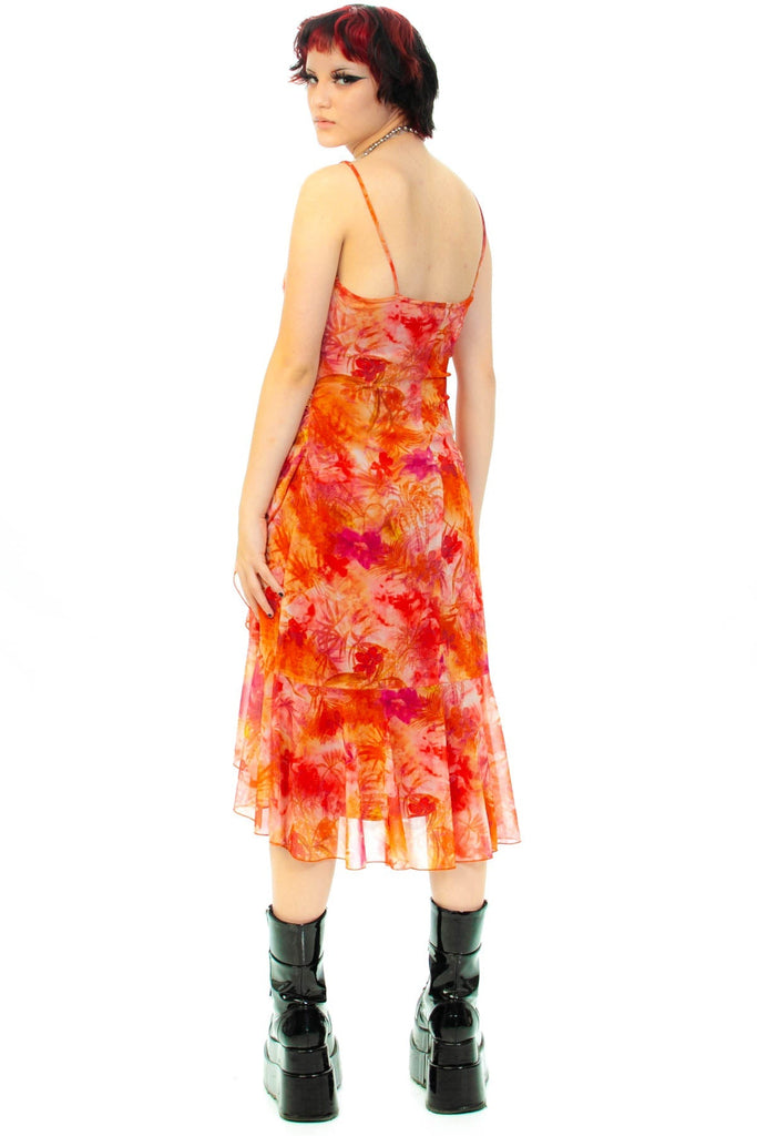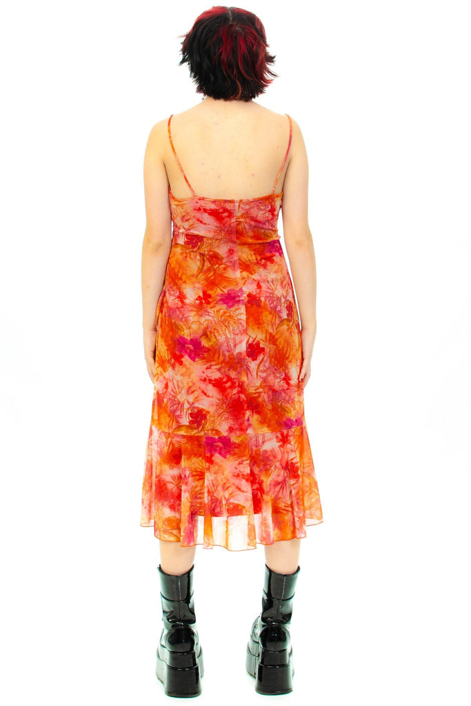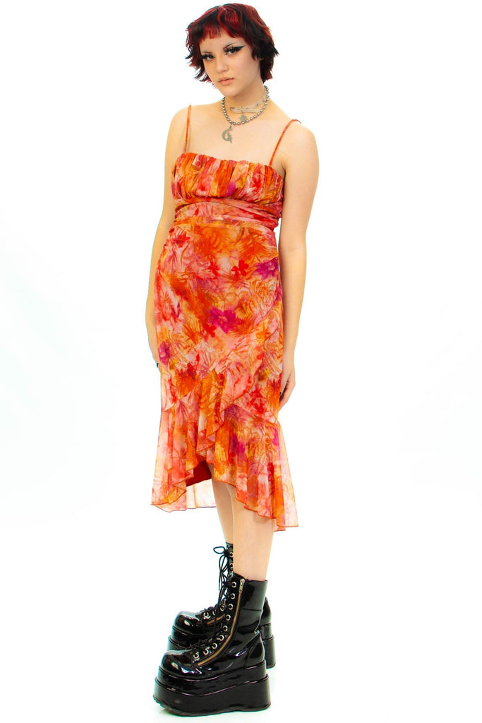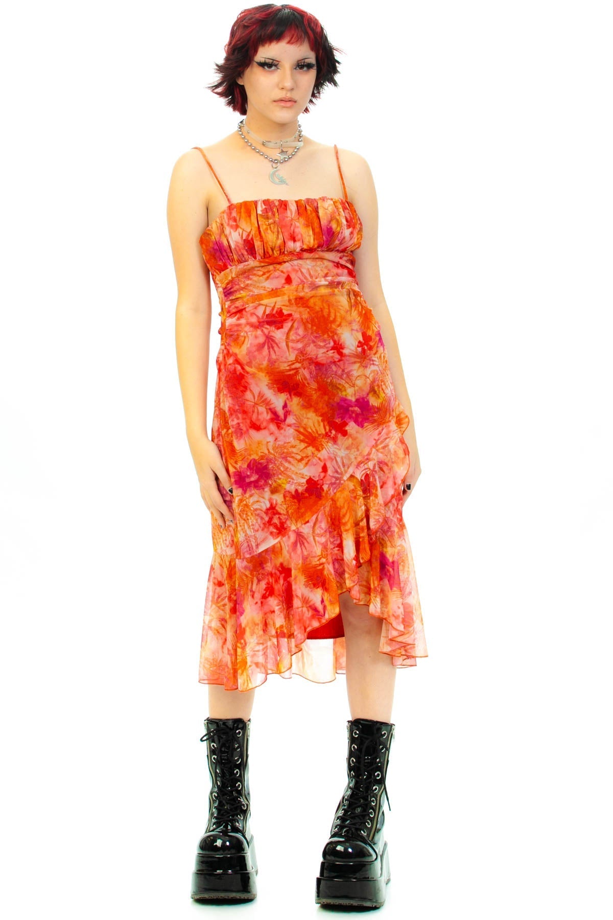 Tropical print mesh overlay dress with asymmetrical ruffle trim and ruched bust!
