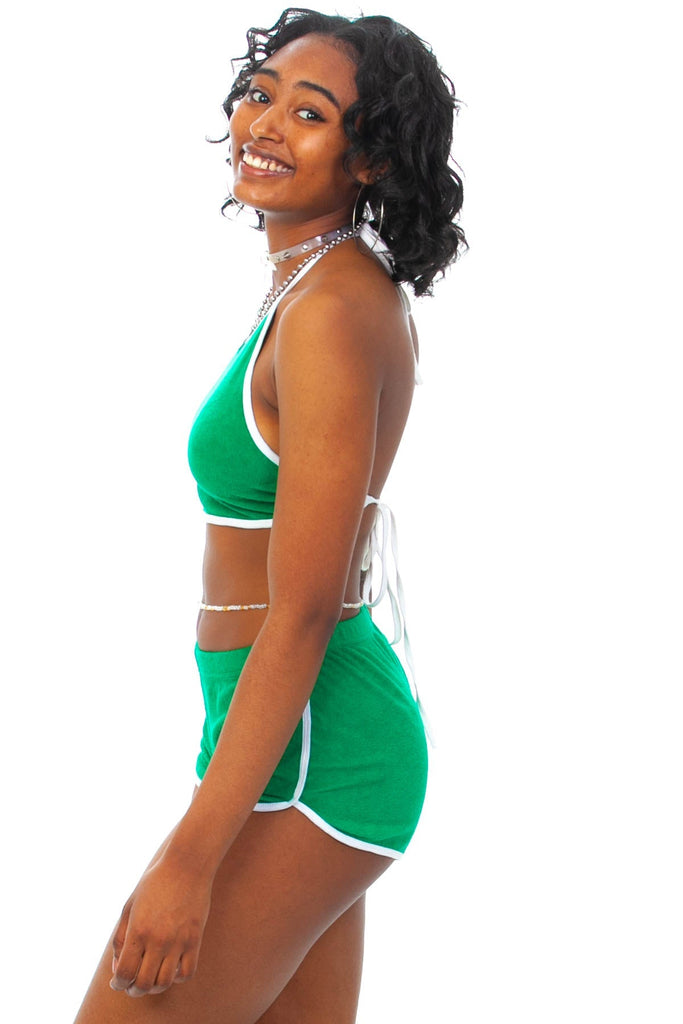 Very cute 70's style not quite vintage AA green terry cloth halter top and short set!