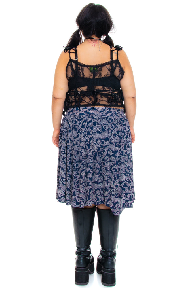 Vintage 90's skirt at knee length in blue with white paisley print allover!