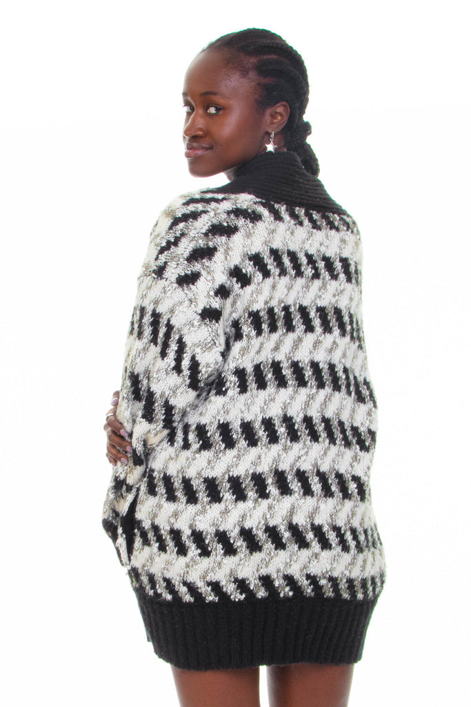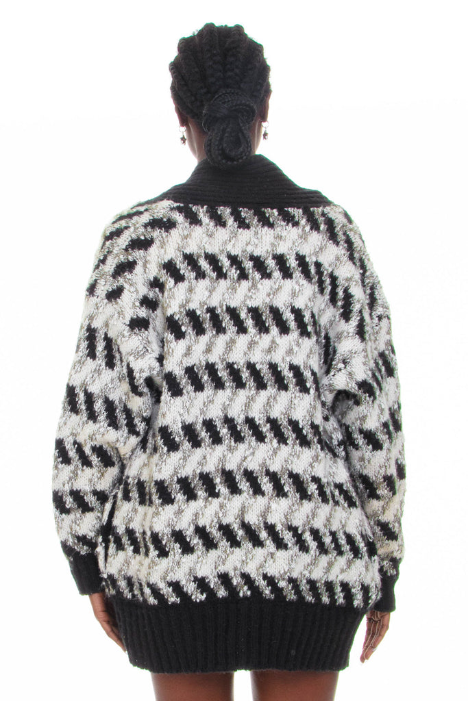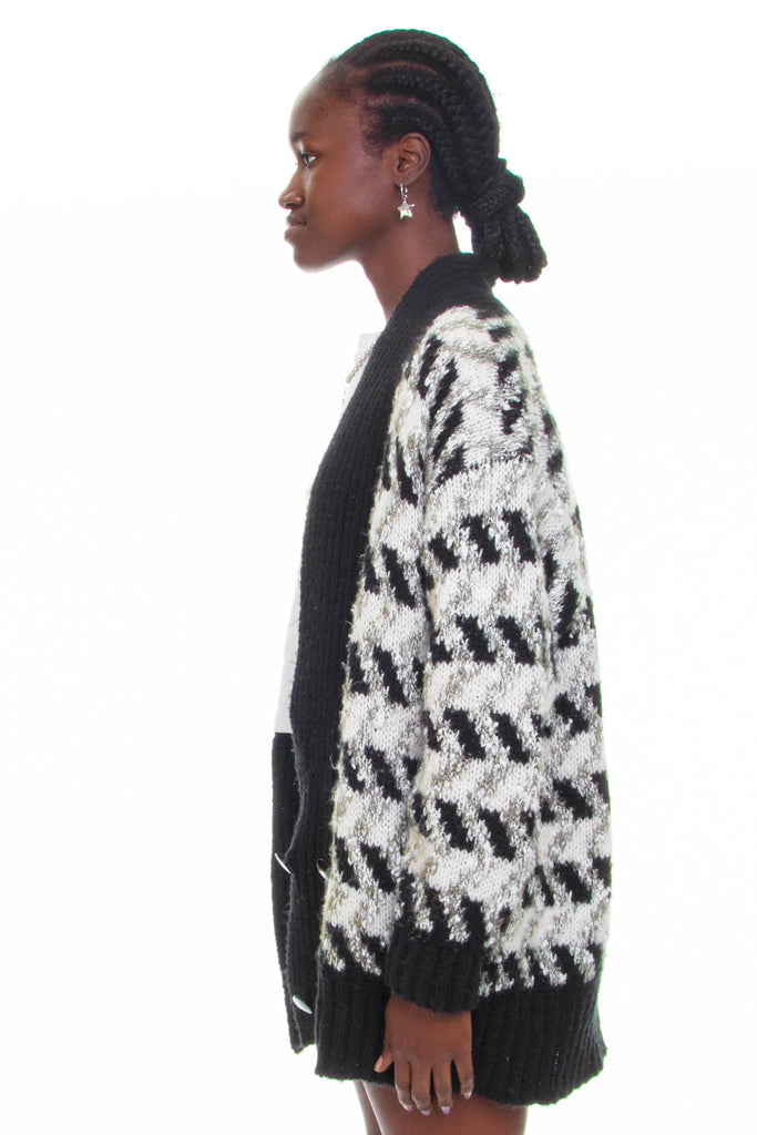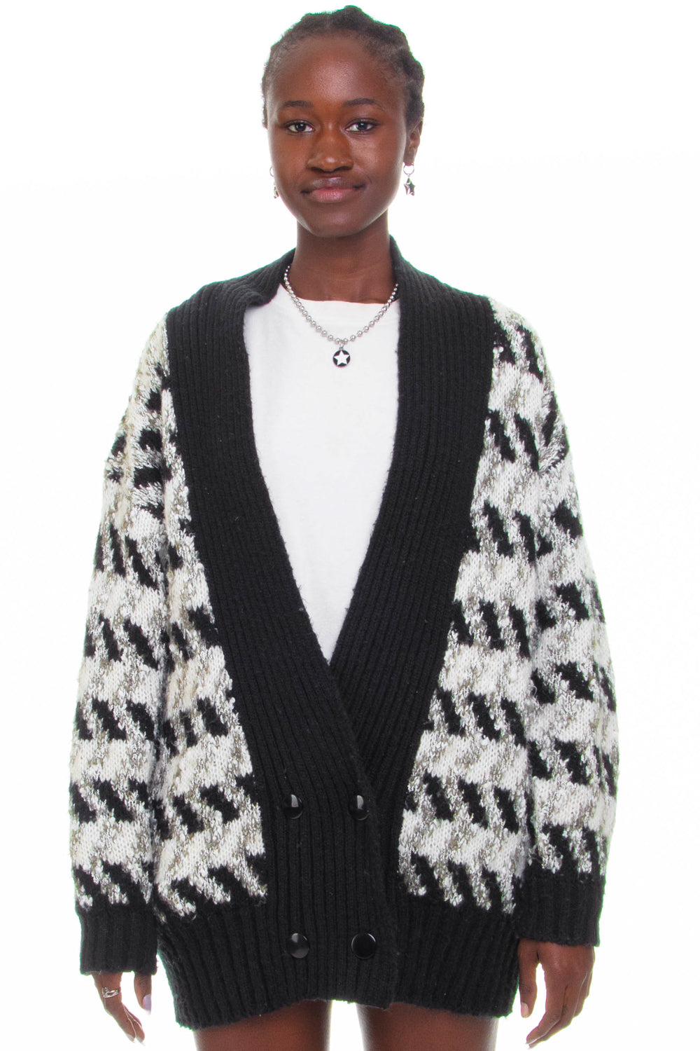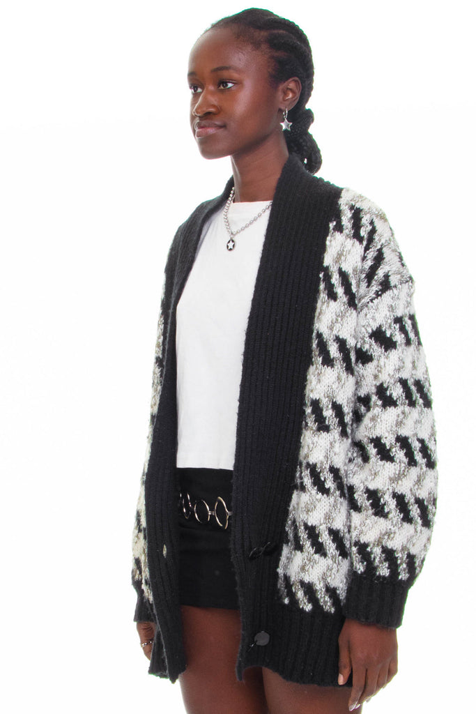 Vintage Y2K long knit cardigan in black and white with open front button closure and loose silhouette!