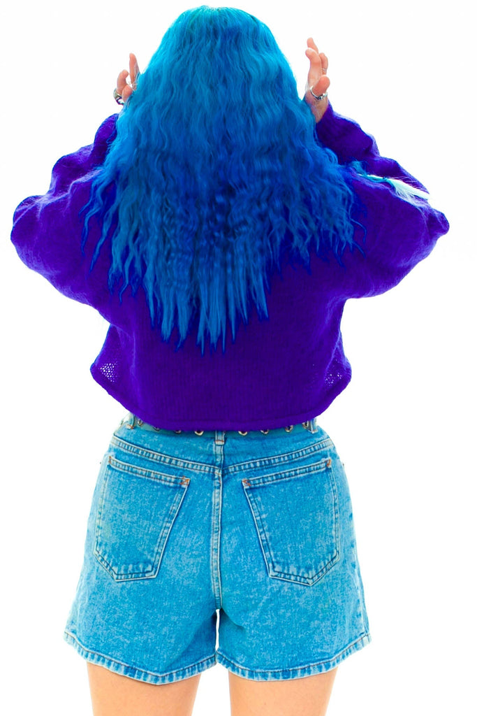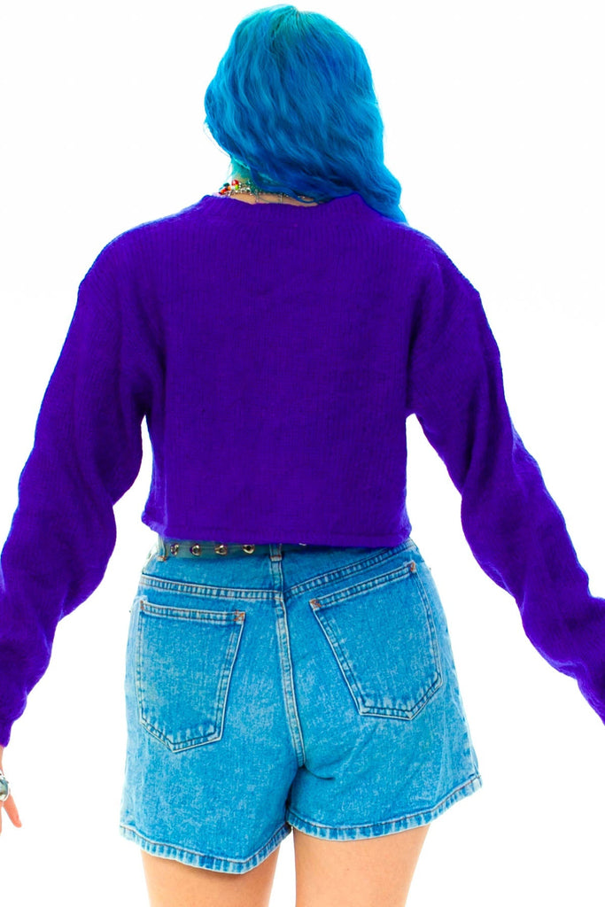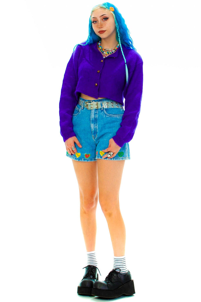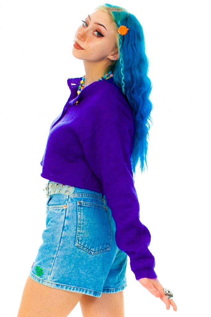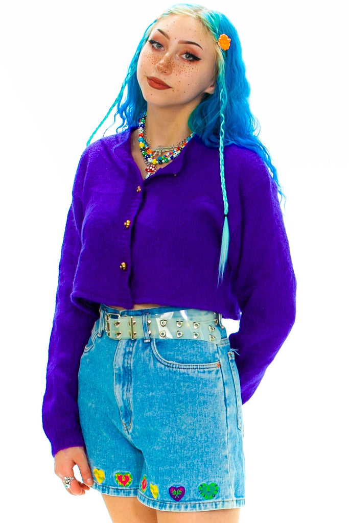 Super cute fuzzy knit mohair cardigan sweater in purple with a front button closure!