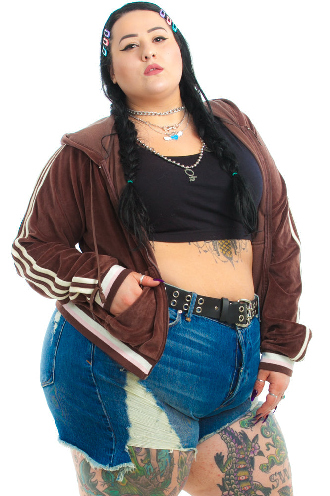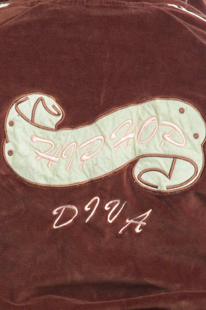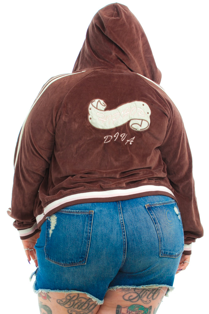 Brown cozy velour hoodie with pink and white stripes down sides of sleeves! Chest and back print reading "Hip Hop Diva". <3