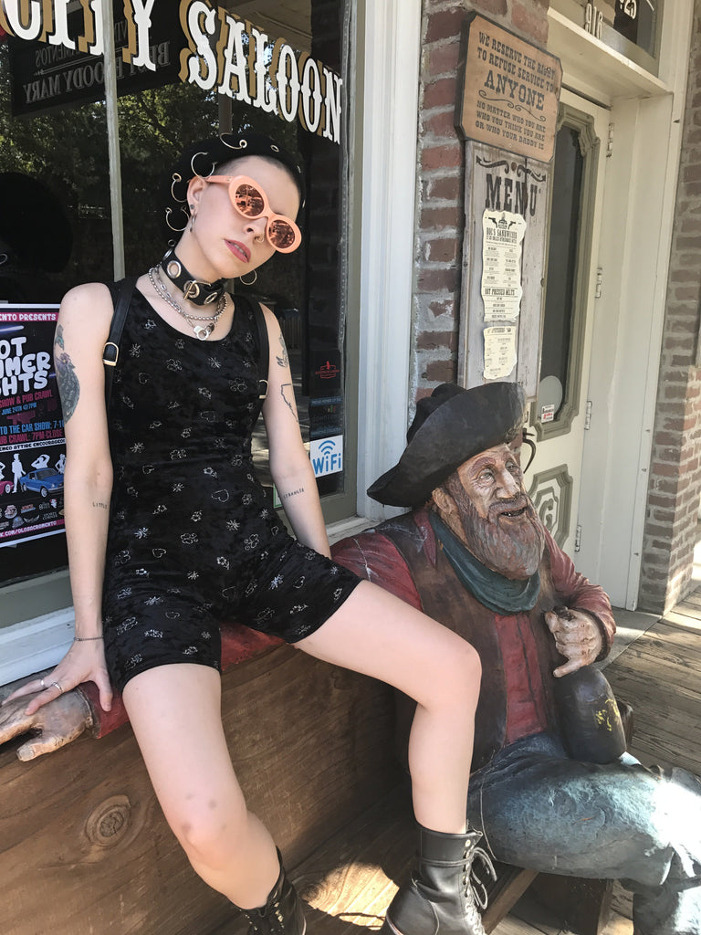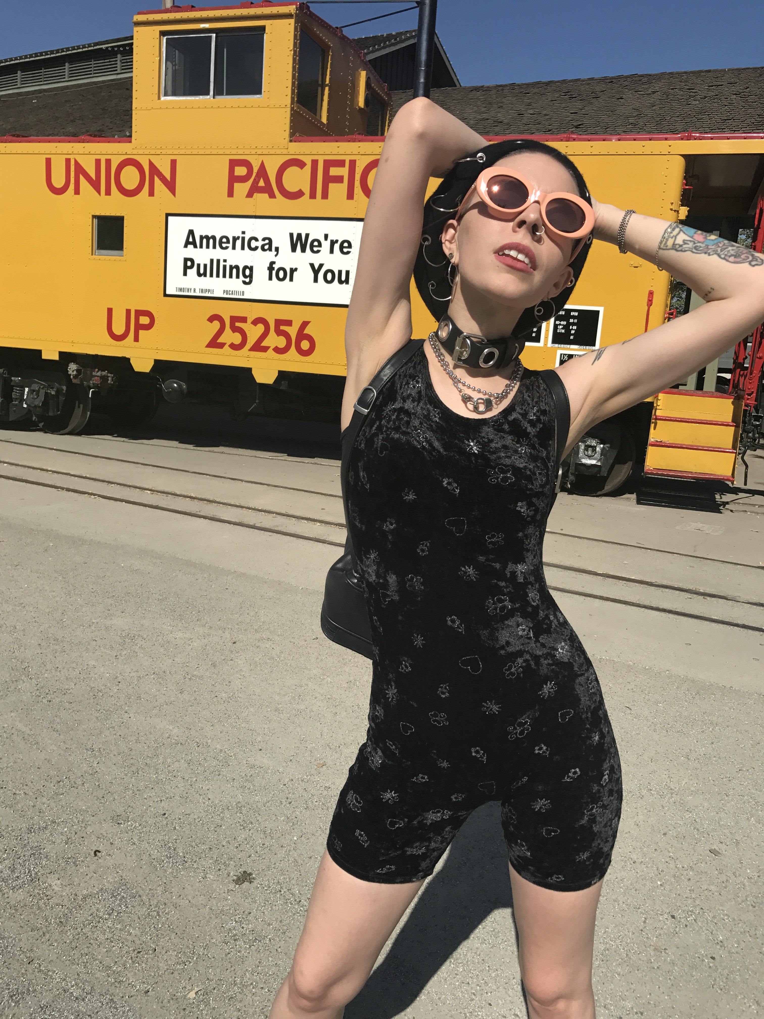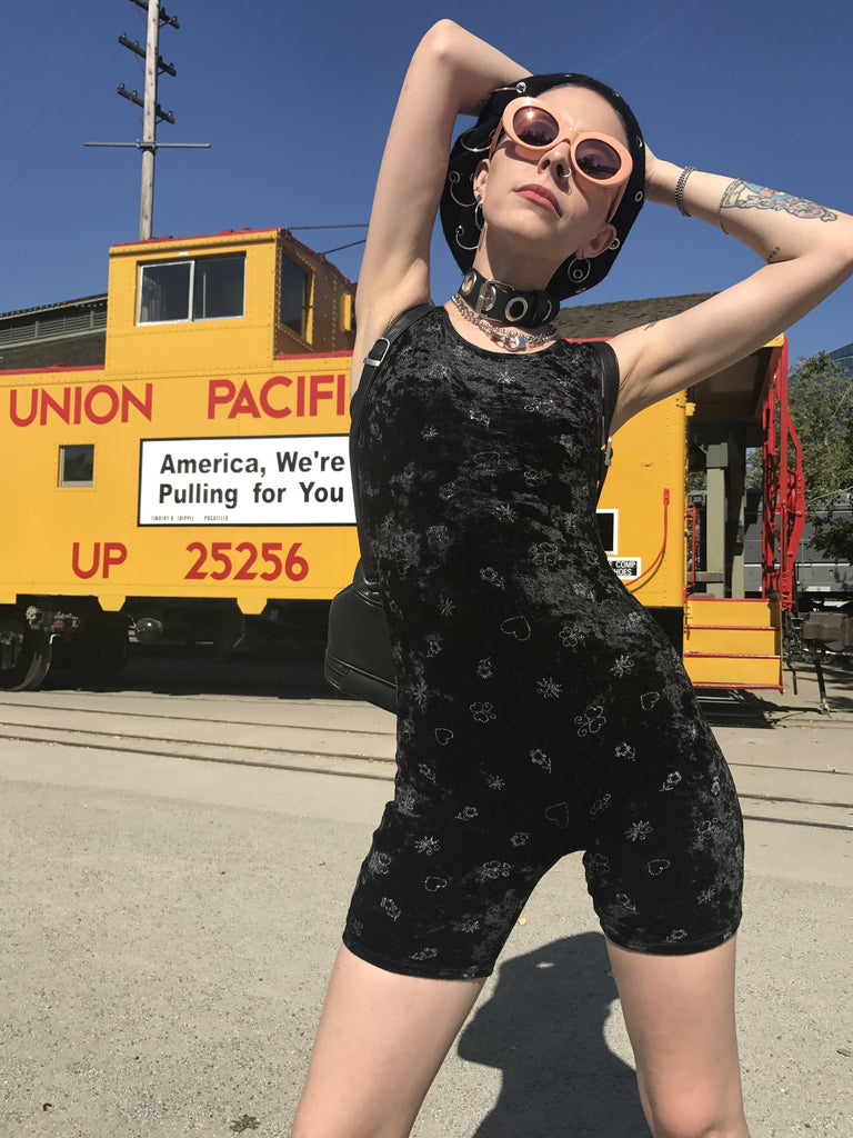 Black velvet romper with silver glitter print all over of butterflies, hearts, and flowers! The cutest little piece ever!