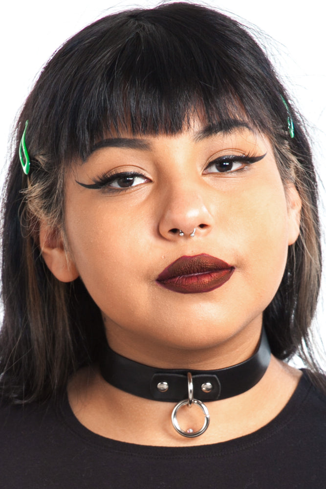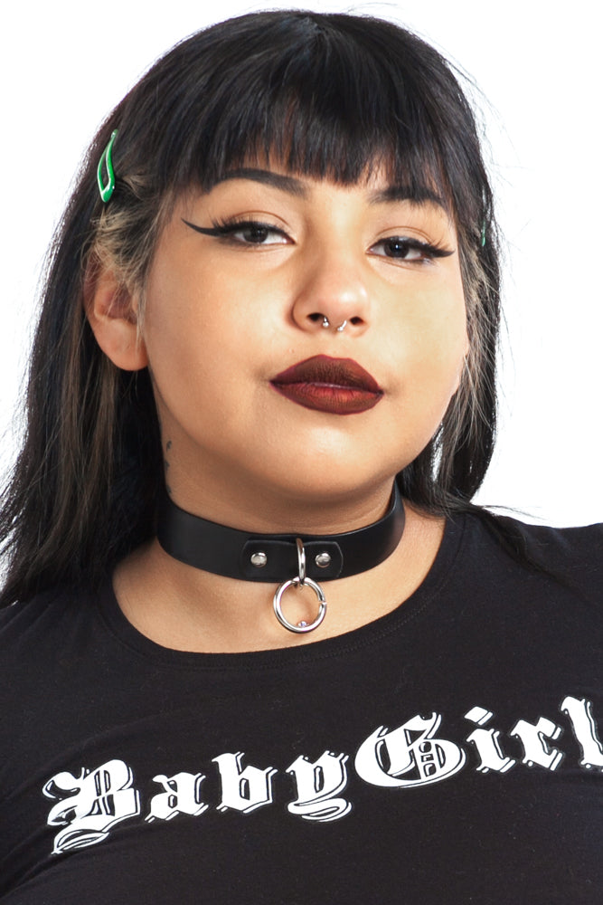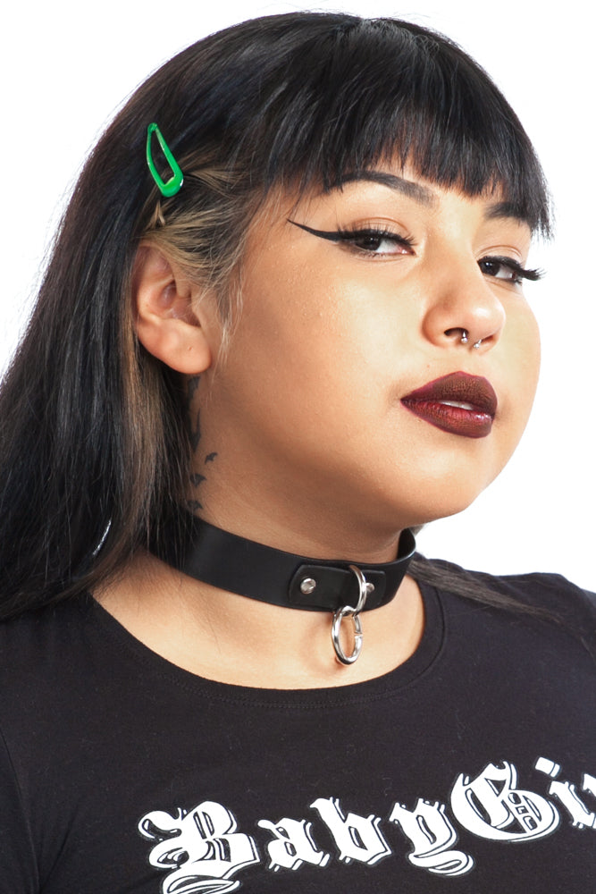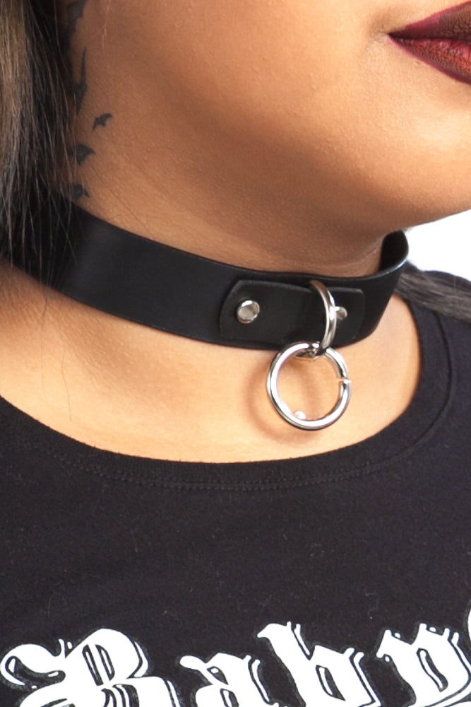 Black vegan faux leather choker with bondage O-ring at front and buckle back!