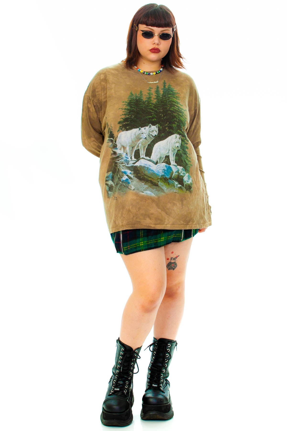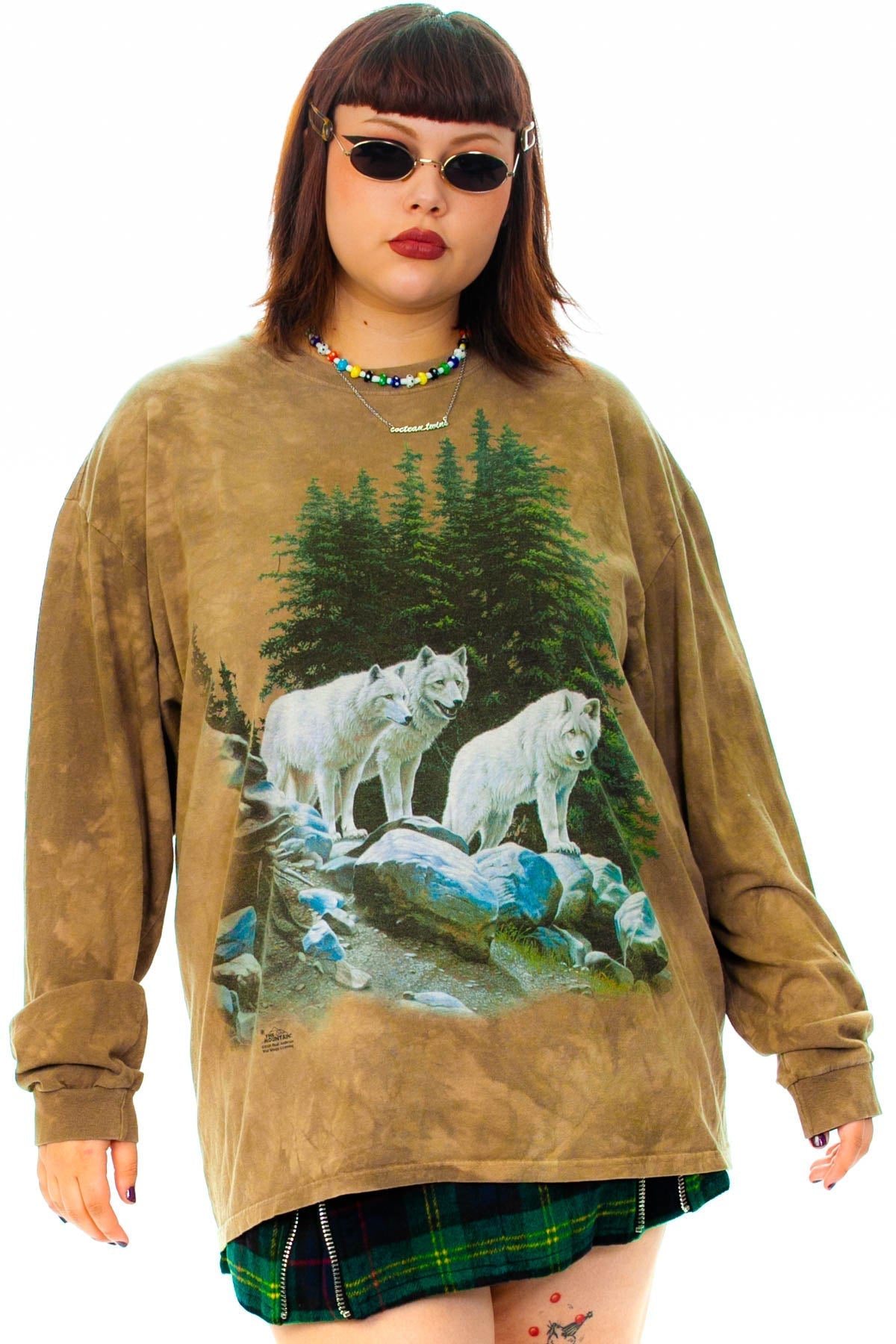 Vintage worn in and bleach dyed long sleeve t-shirt with white wolves in a forest graphic!