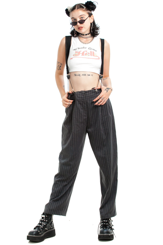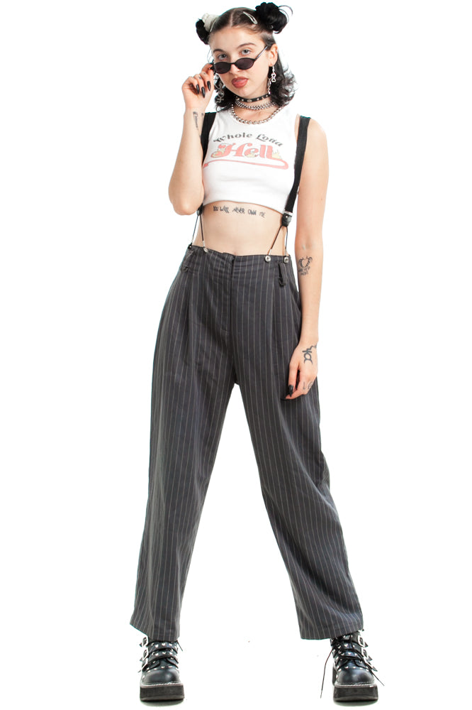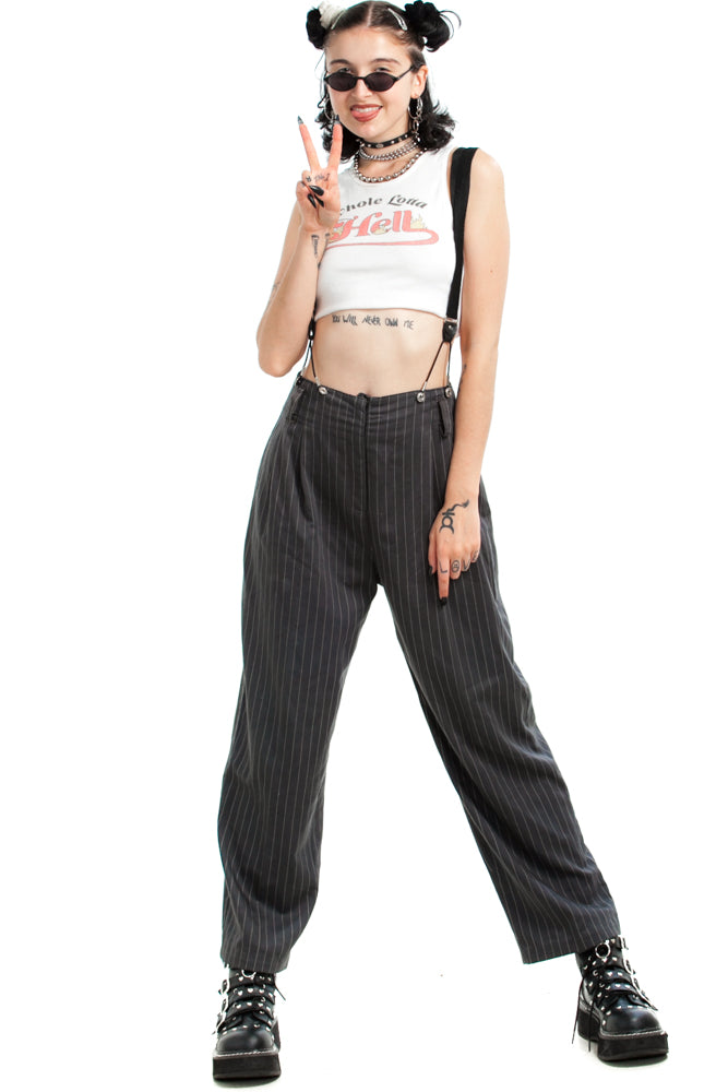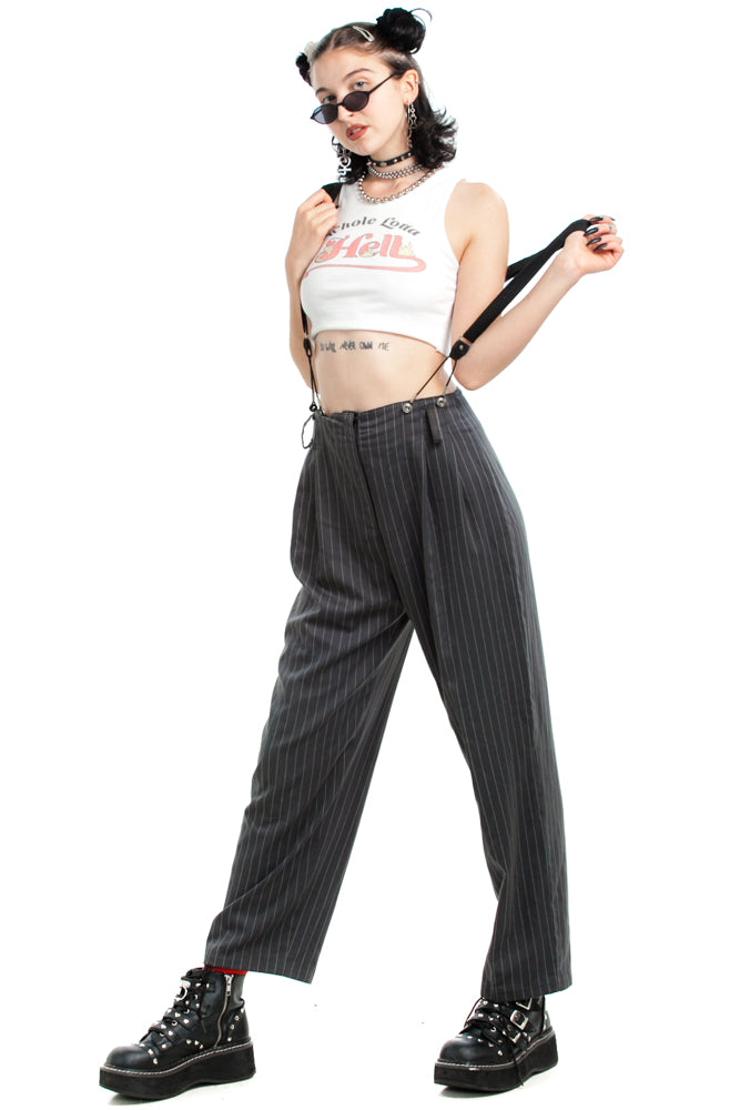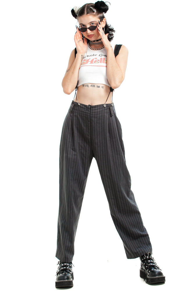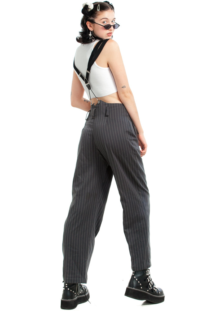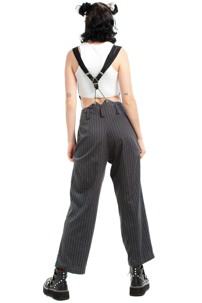 Pinstriped trousers with detachable suspenders! Pleats at front.