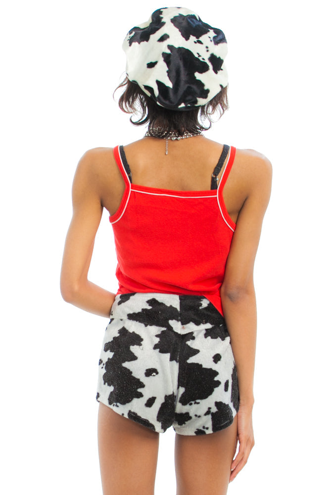 Red jersey tank top with white piped trim! White decorative buttons up front.