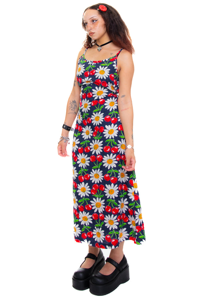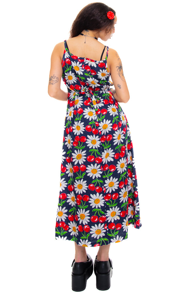 Navy blue maxi dress with allover daisy and cherry print! Tie back waist.