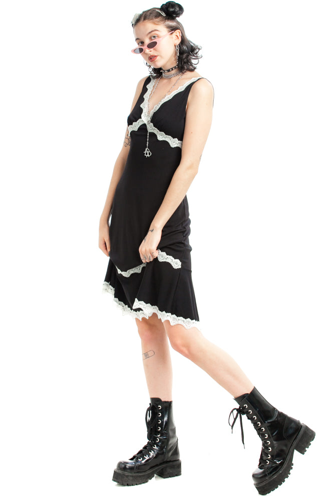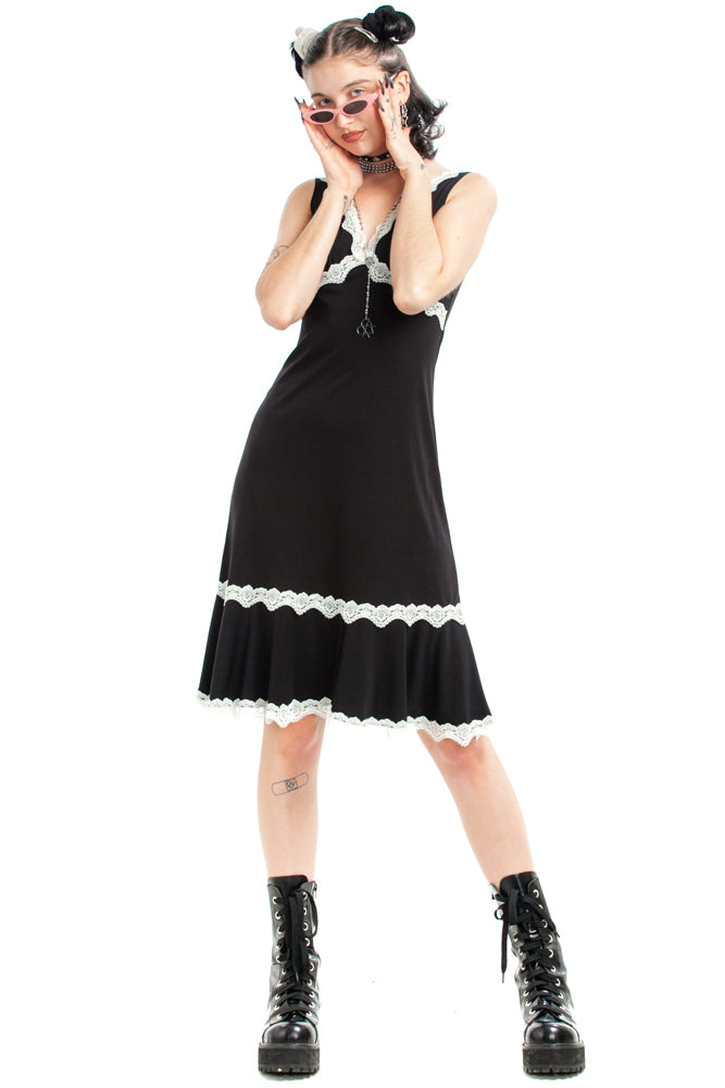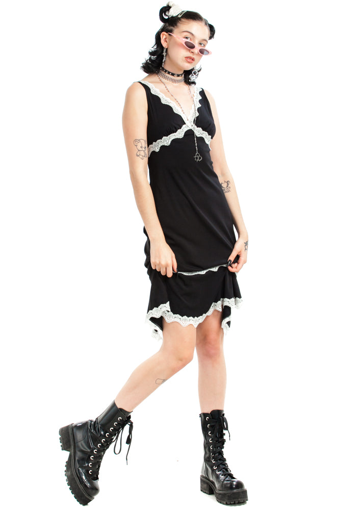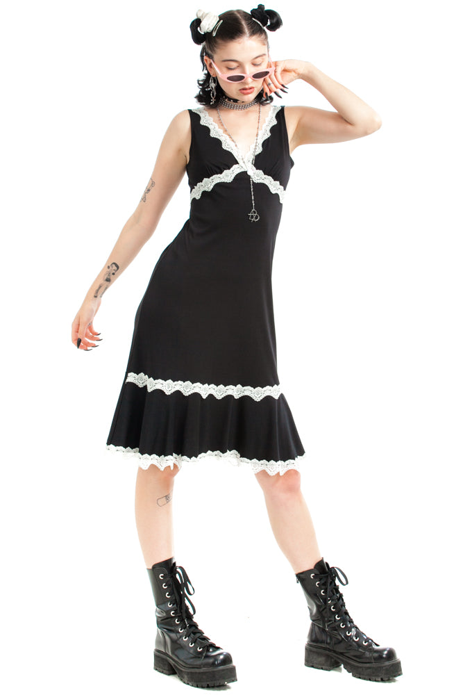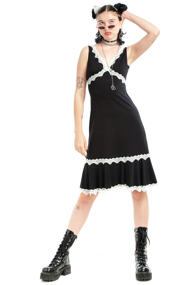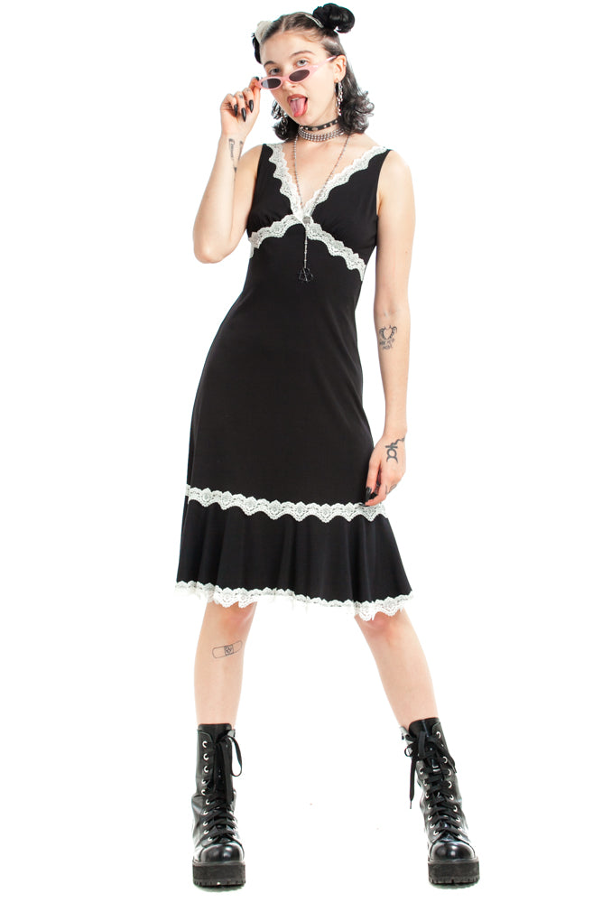 Black stretch grunge princess midi dress with white contrast lace trim.