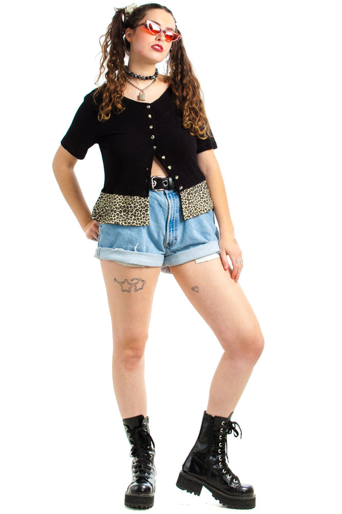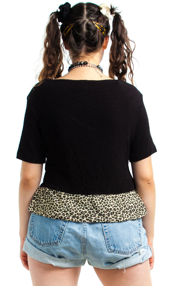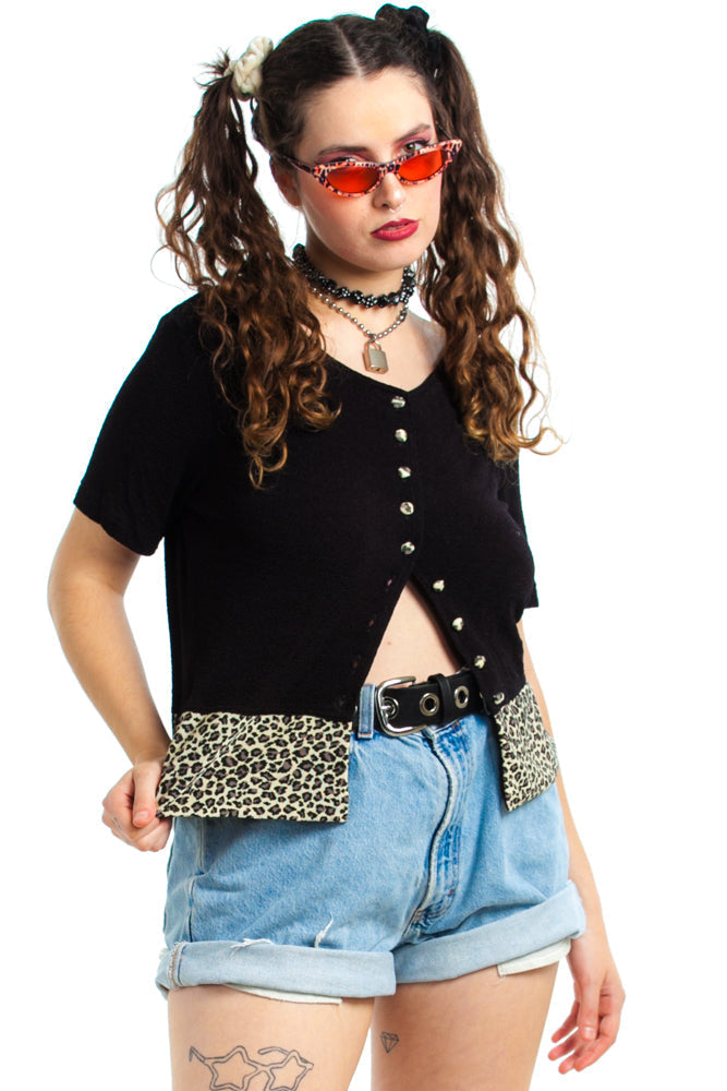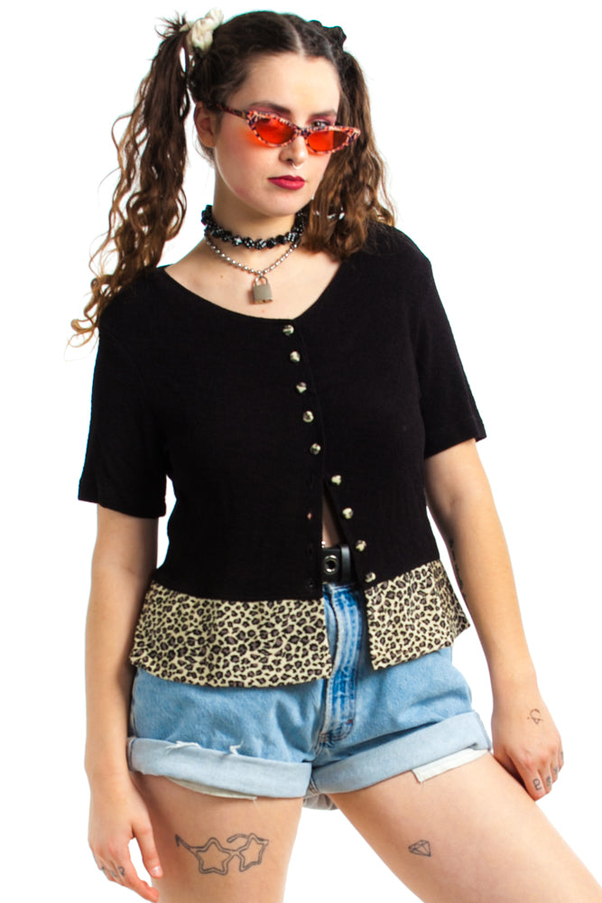 Black stretch top with leopard print hem and buttons!