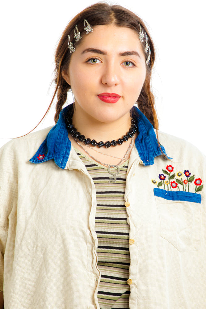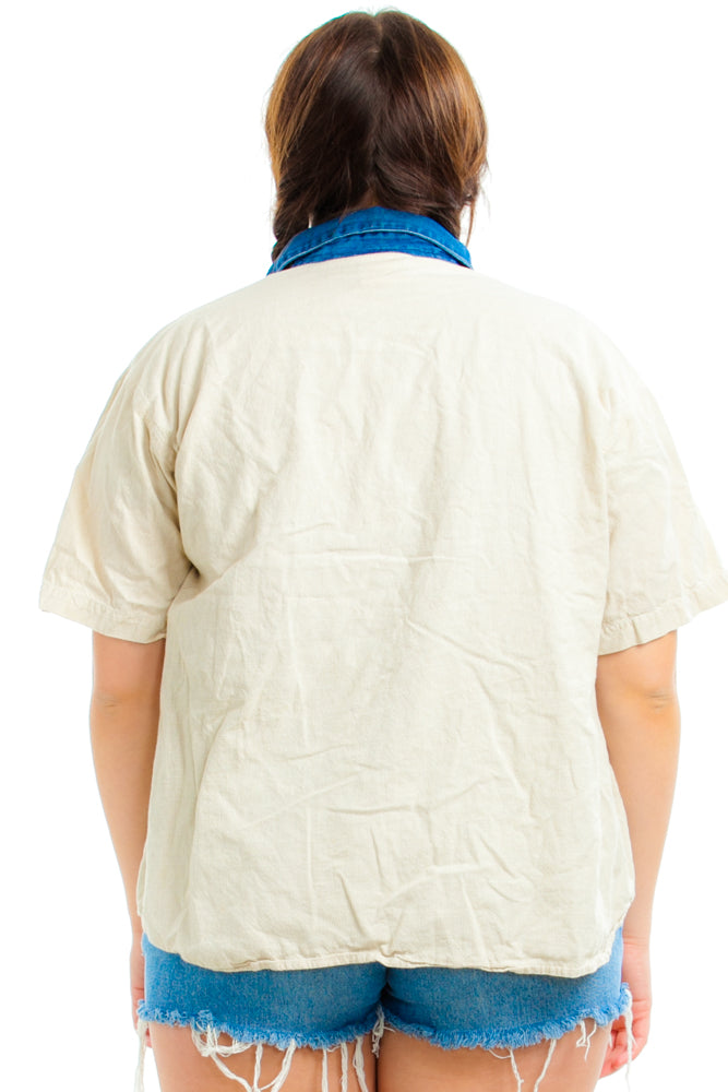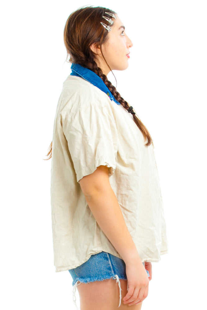 Tan and white woven shirt with button-up closure at front! Blue denim mix at collar and pocket, plus floral embroidery accents.