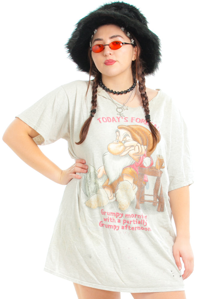 Heather grey tee with raw cut neck! Front print reading "Today's Forecast: Grump" with Grumpy Elf from Snow White!