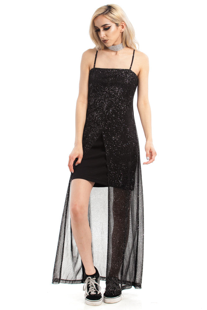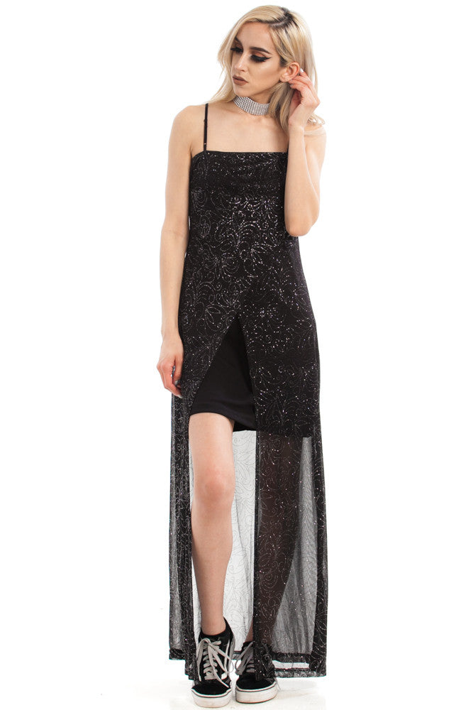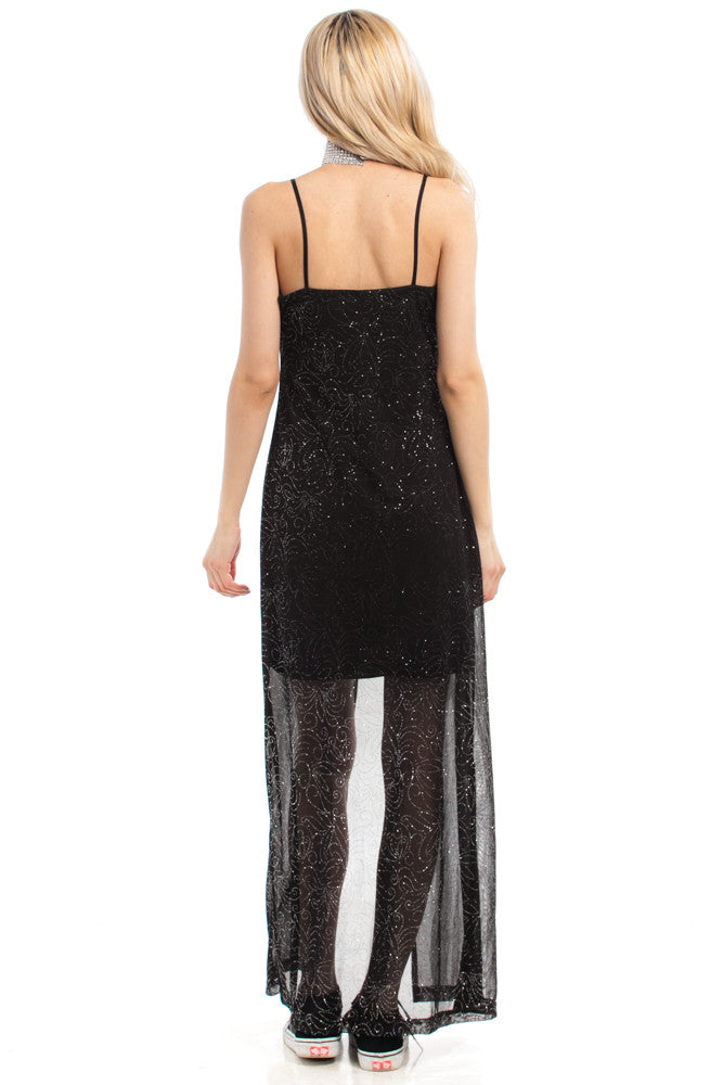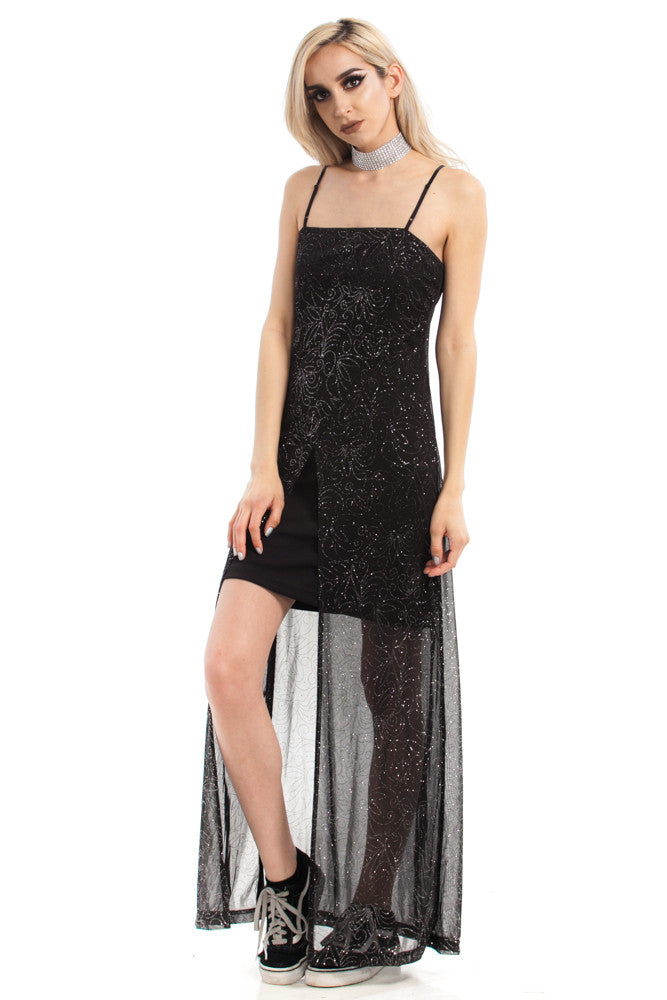 The ideal high-low dress. Inside layer is a simple stretchy black mini with adjustable straps. Outer layer is black mesh with glittery whimsical designs all over!