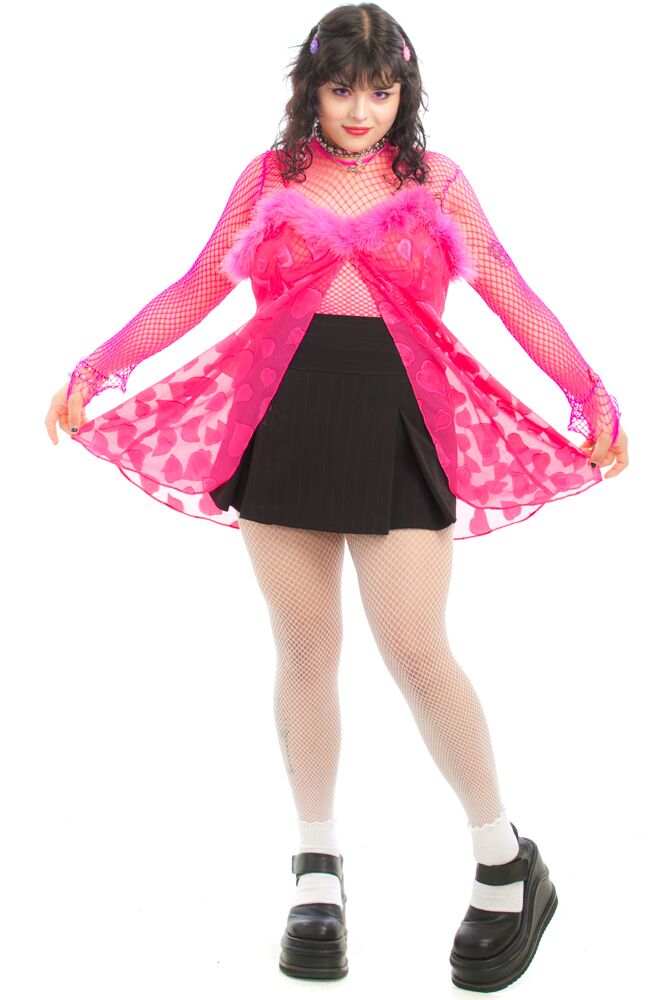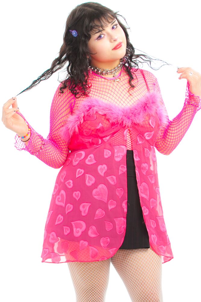 Hot pink adjustable spaghetti strap babydoll top. Sheer fabric with a shiny heart pattern all over. Maribou detail at the bust.