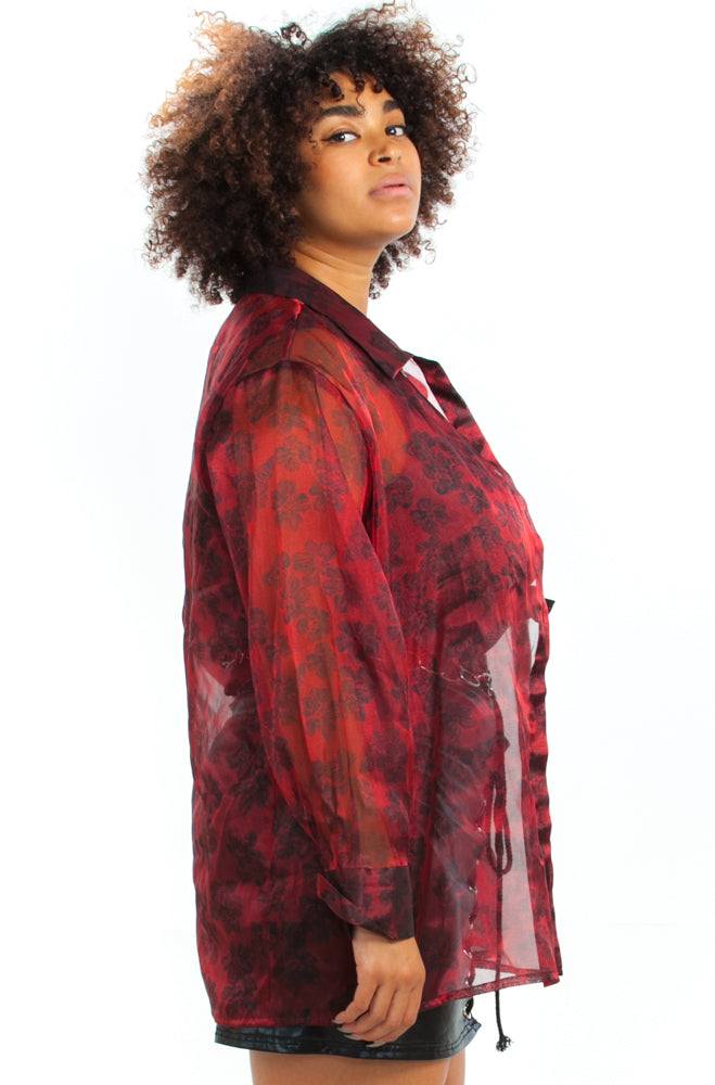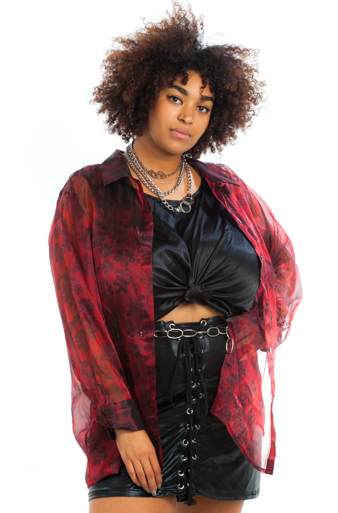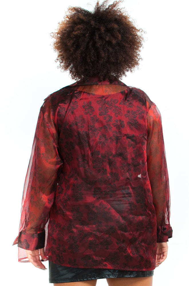 Layer-look shirt with black sleeveless underlayer and attached metallic red sheer button-up overlayer! Black floral design.