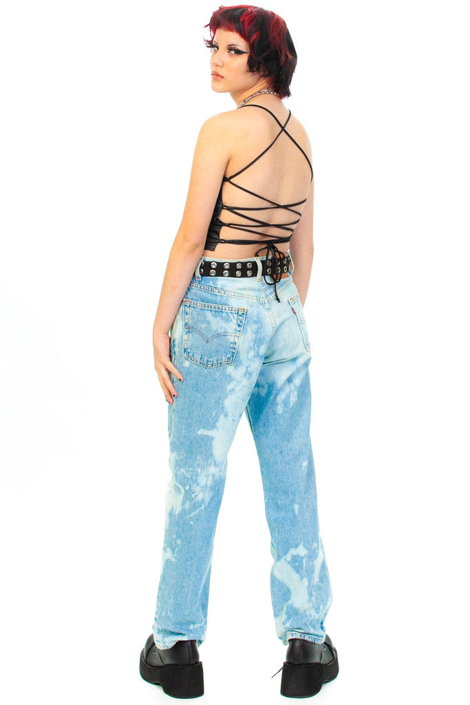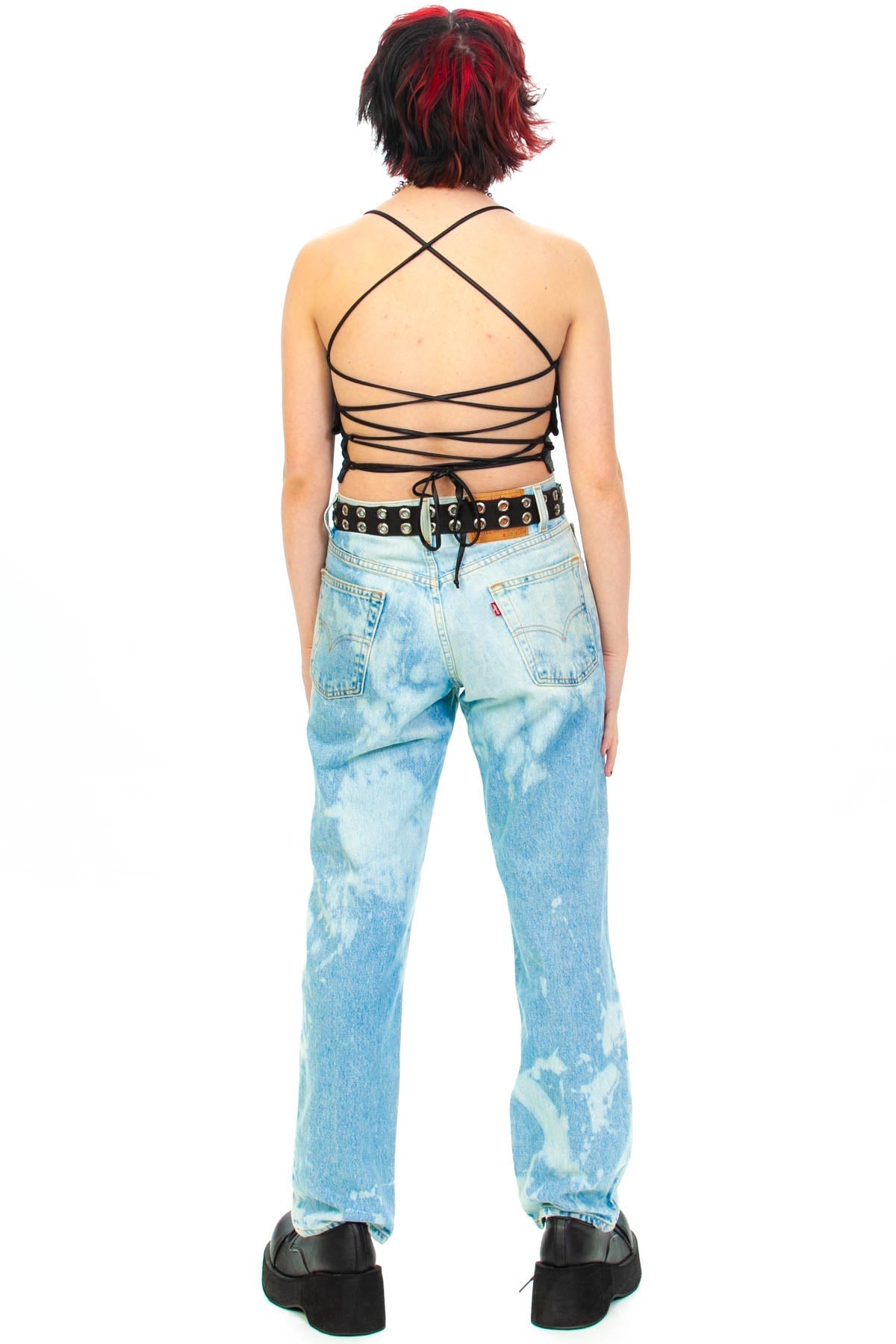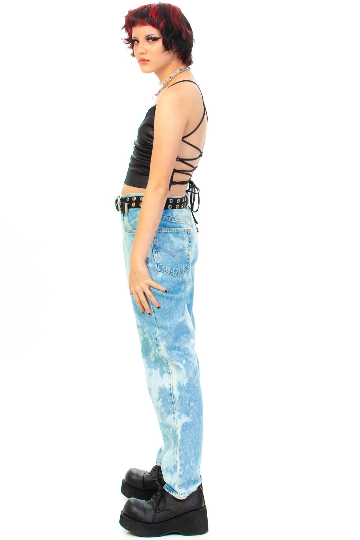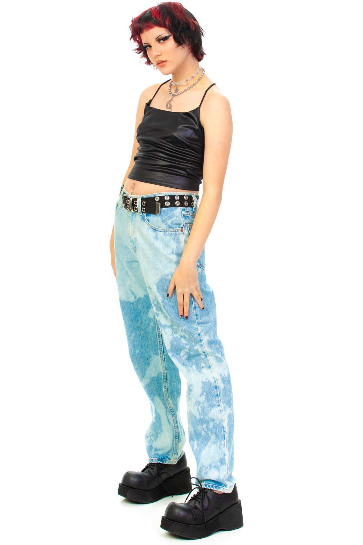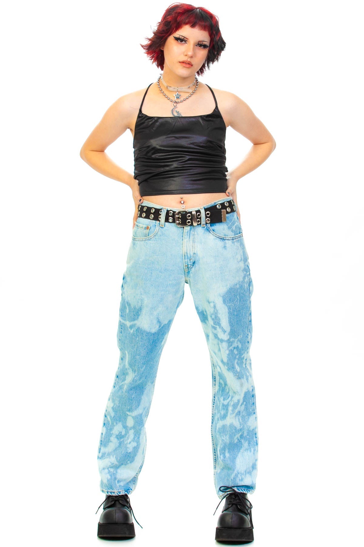 Light blue denim Levi's 550 jeans with faint bleach dye detail!