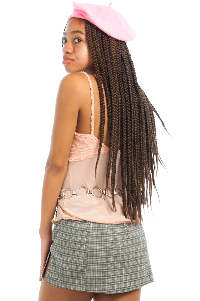 Peach silk crepe blend camisole with textured trim! Bow tie at front.