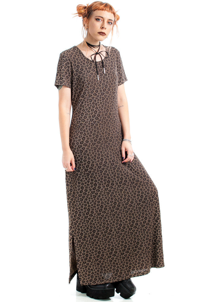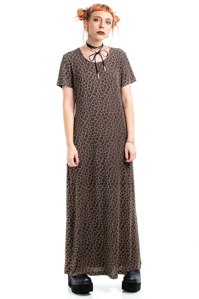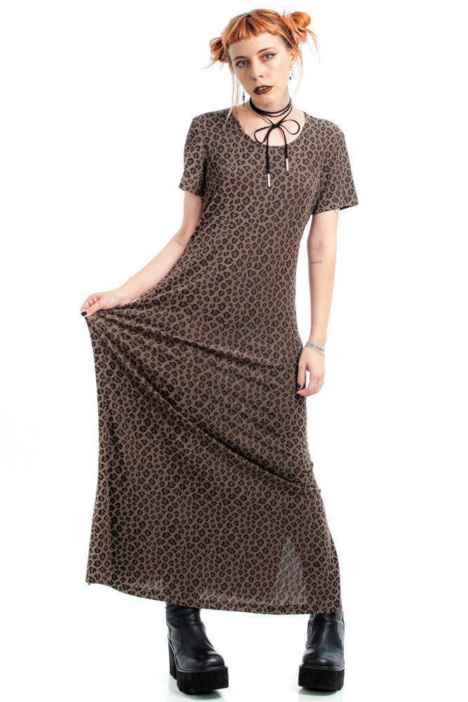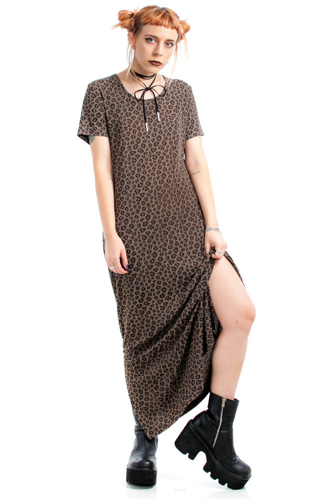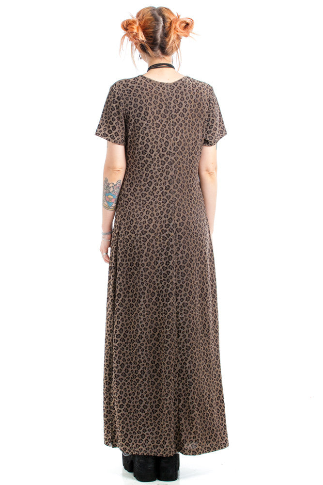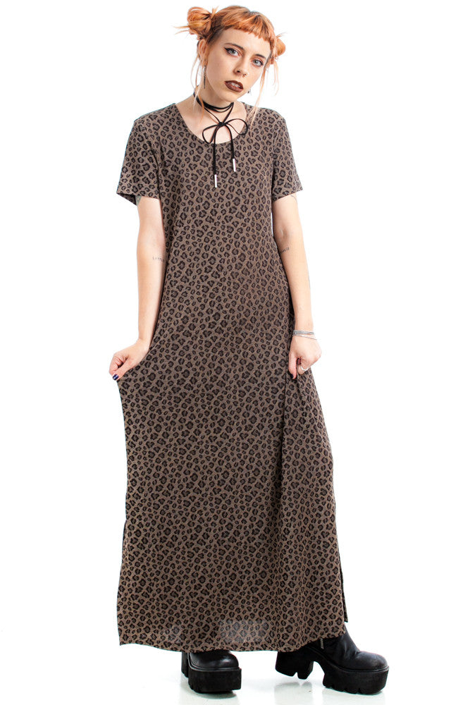 Maxi-length stretch leopard-print dress with short sleeves! Super slinky and comfy -- you'll want to wear it every day!