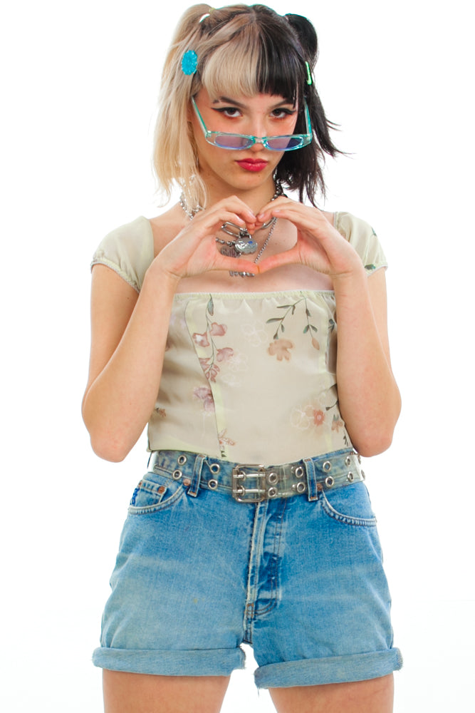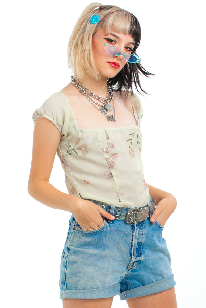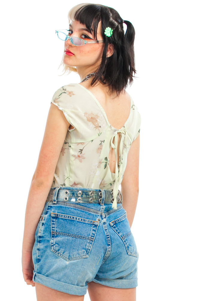 Sage green woven top with blossom floral print allover! Tie closure at back.