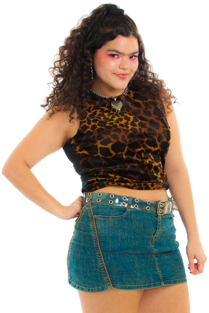 Faux fur sleeveless top with giraffe-like print on front! Stretch panel in black at back.