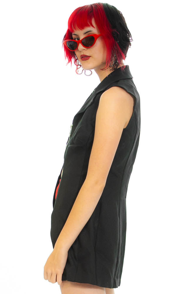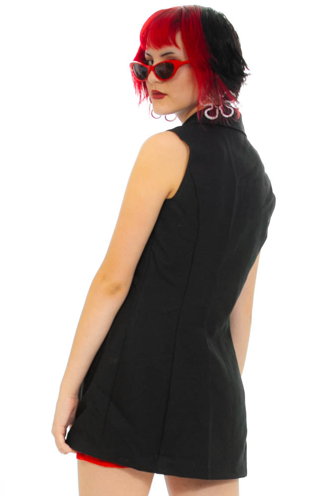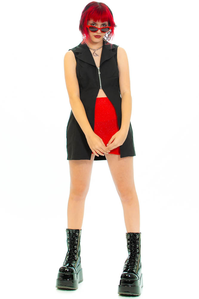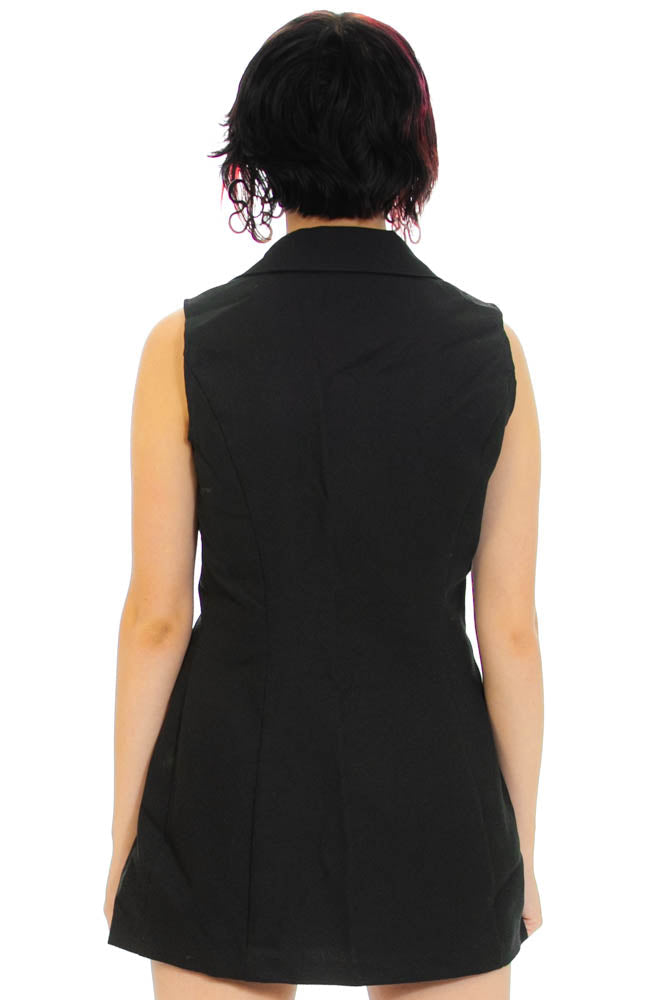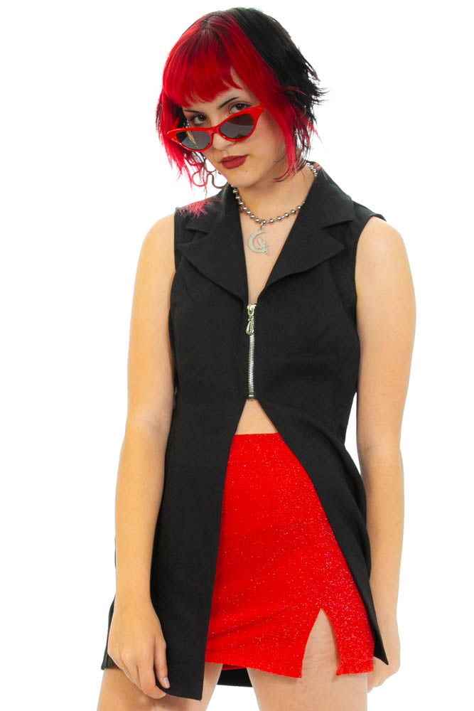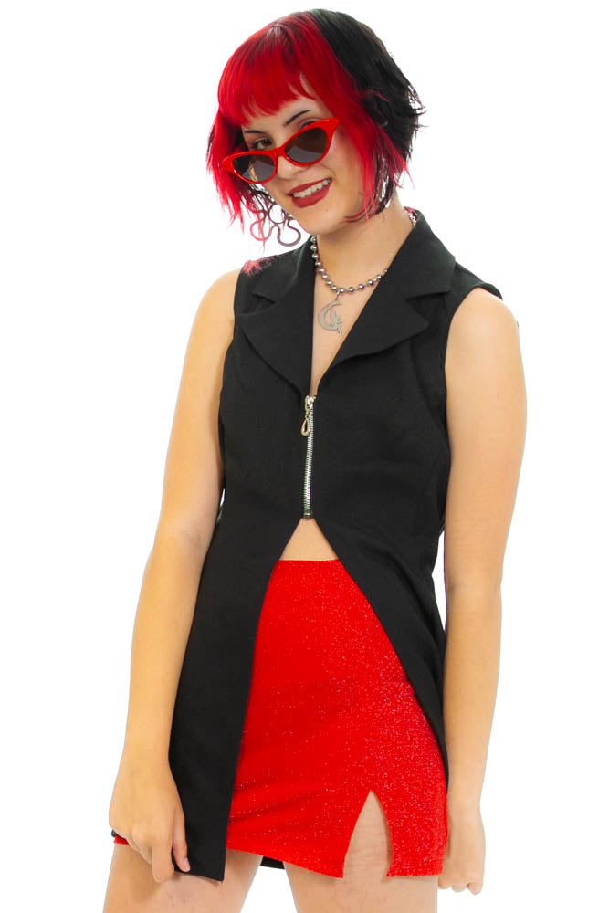 Black zip-front breakaway top with collar and lapel! Goth business chic, obviously.