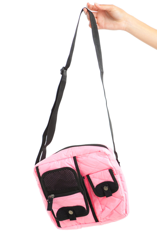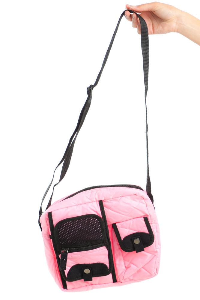 DetailsPink nylon messenger bag with adjustable strap and quilted accents! Black trim and lots of pockets in cyber styling!