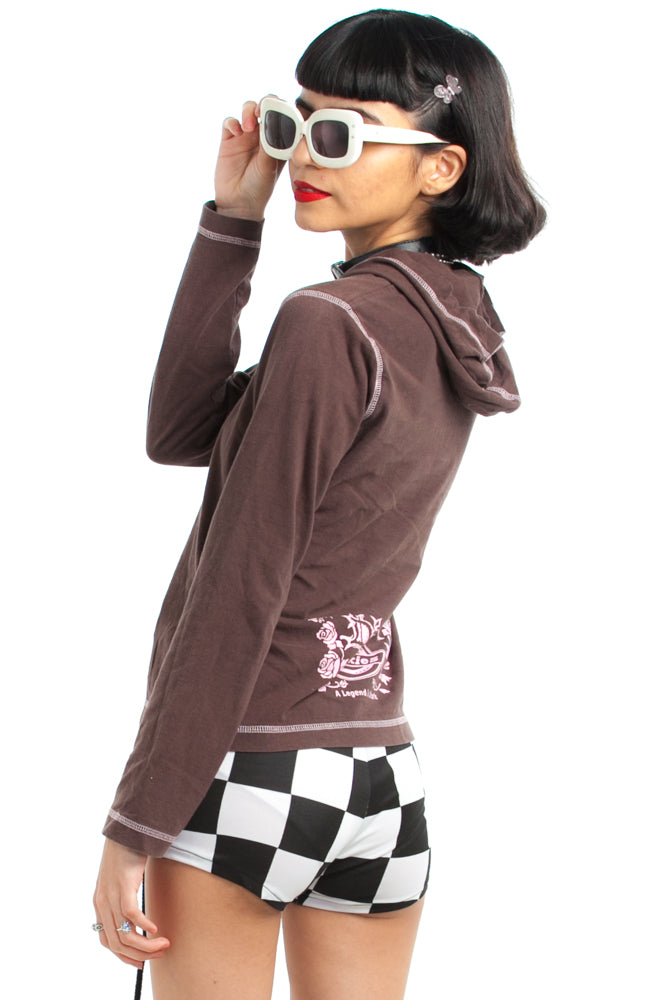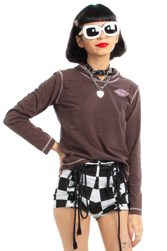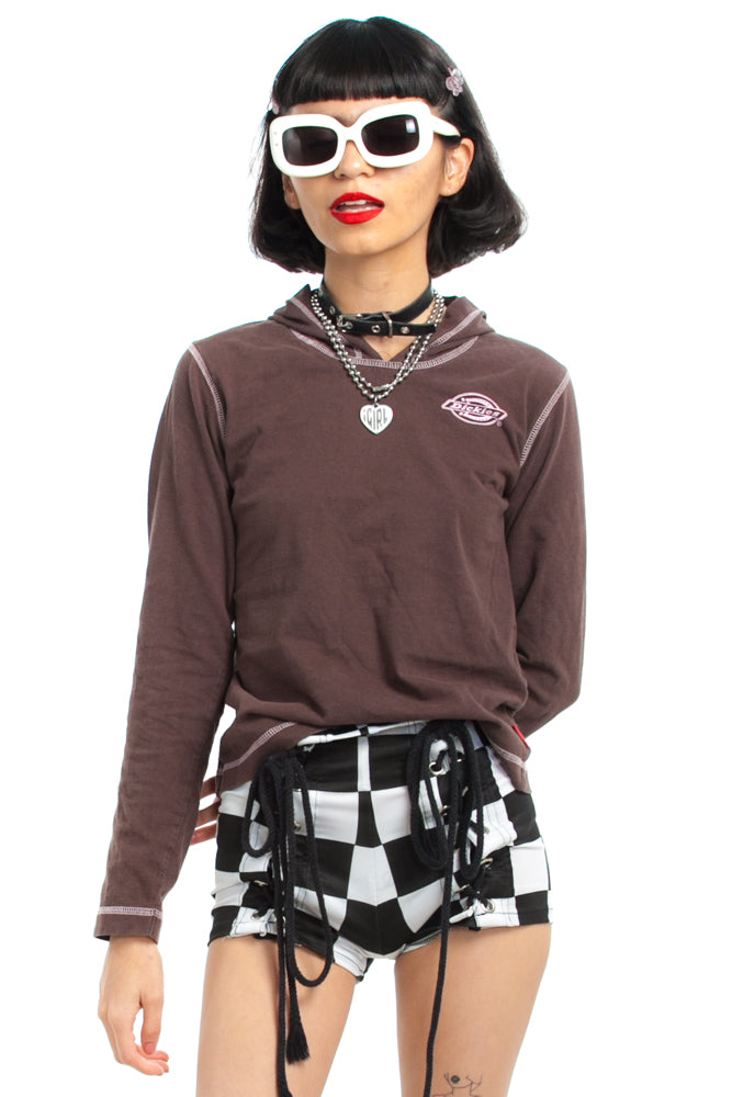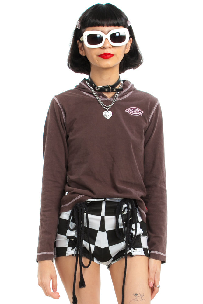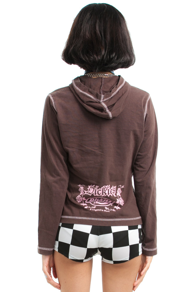 Brown hoodie with baby pink stitching! Dickies logo print on chest and at lower back with rose trim!