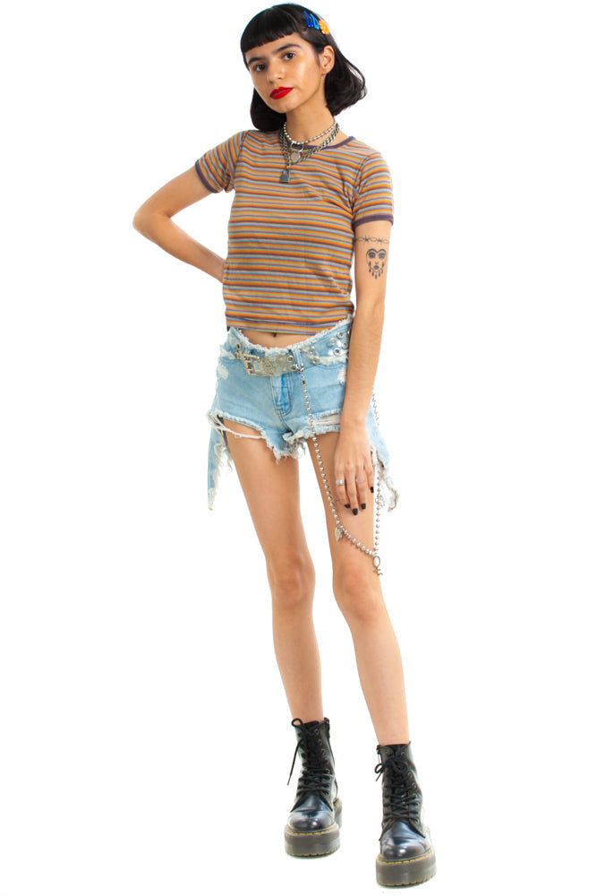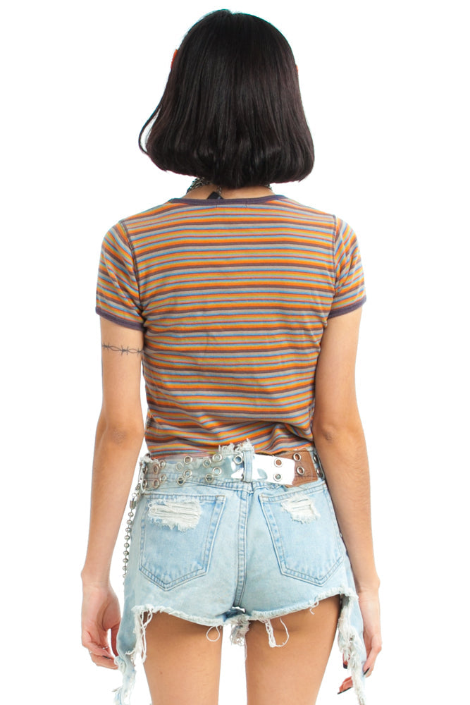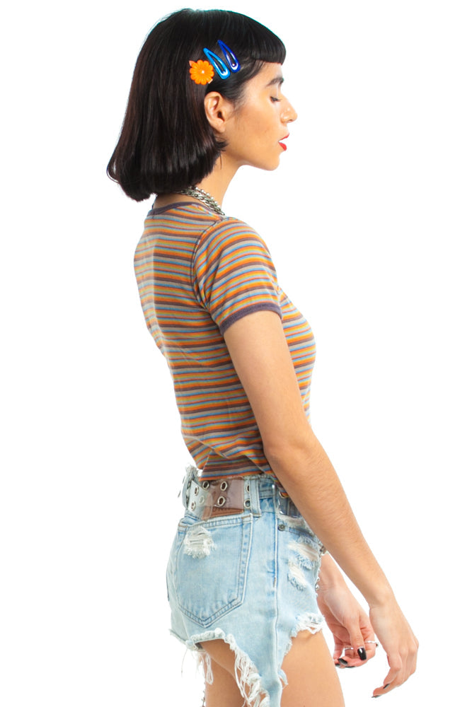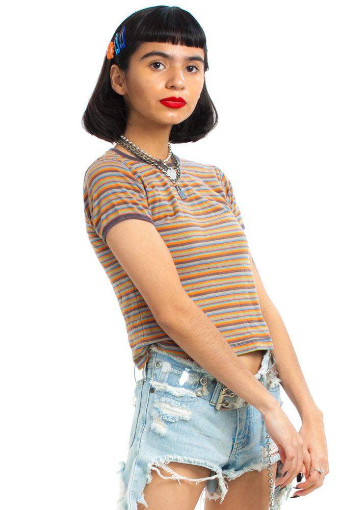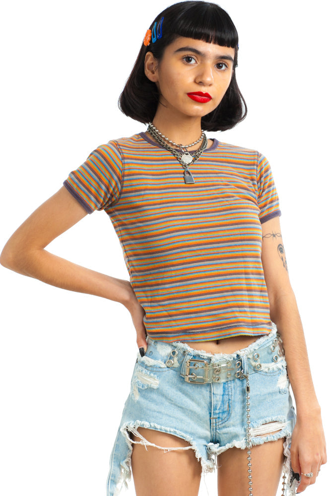 Striped baby tee in blue, grey, orange, and green! Contrast grey trim.