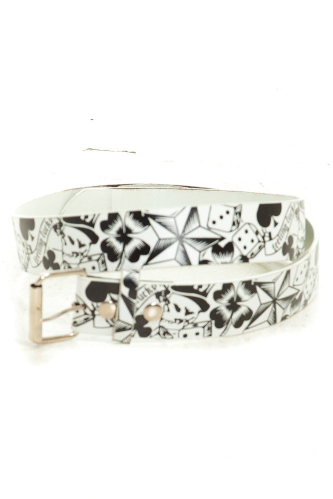White leather belt with black print all around of dice, spades, clovers, a smoking skull, and a tattoo banner reading "feeling lucky" -- a dream belt!