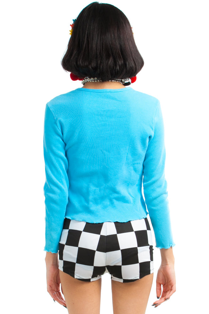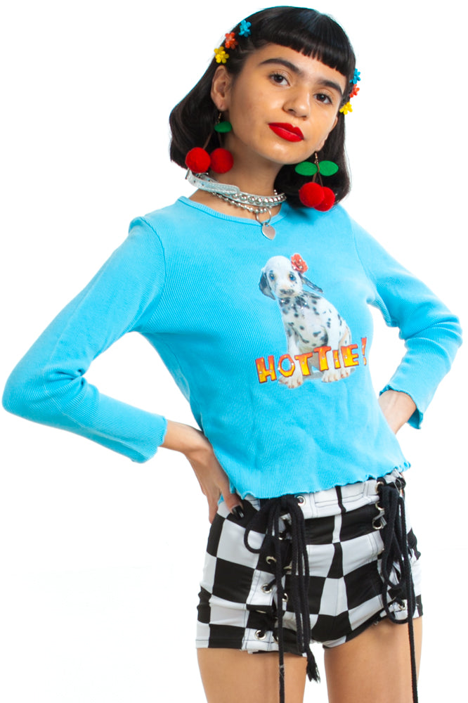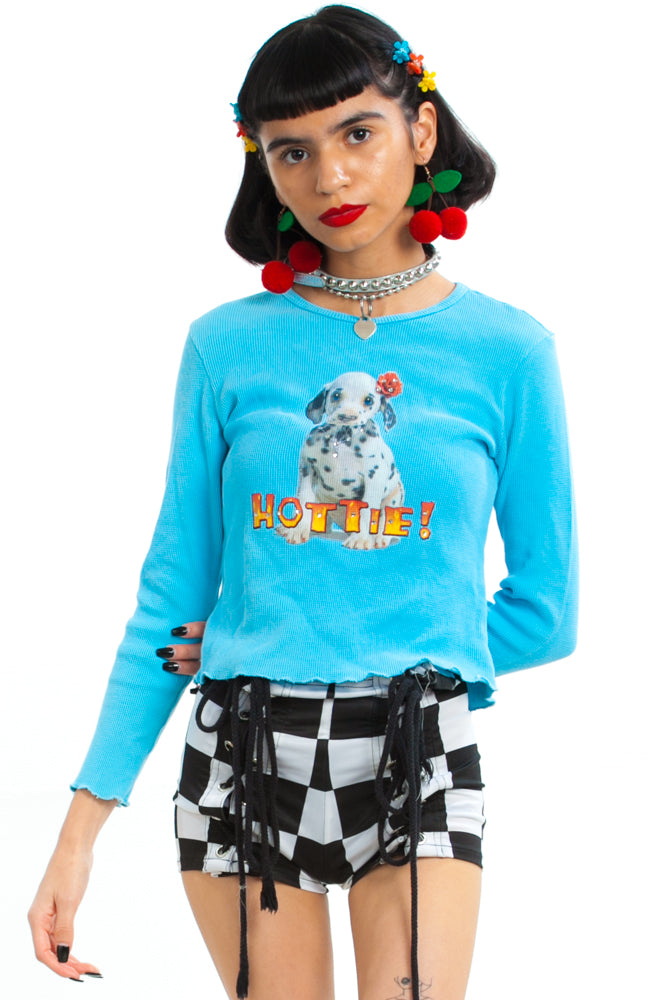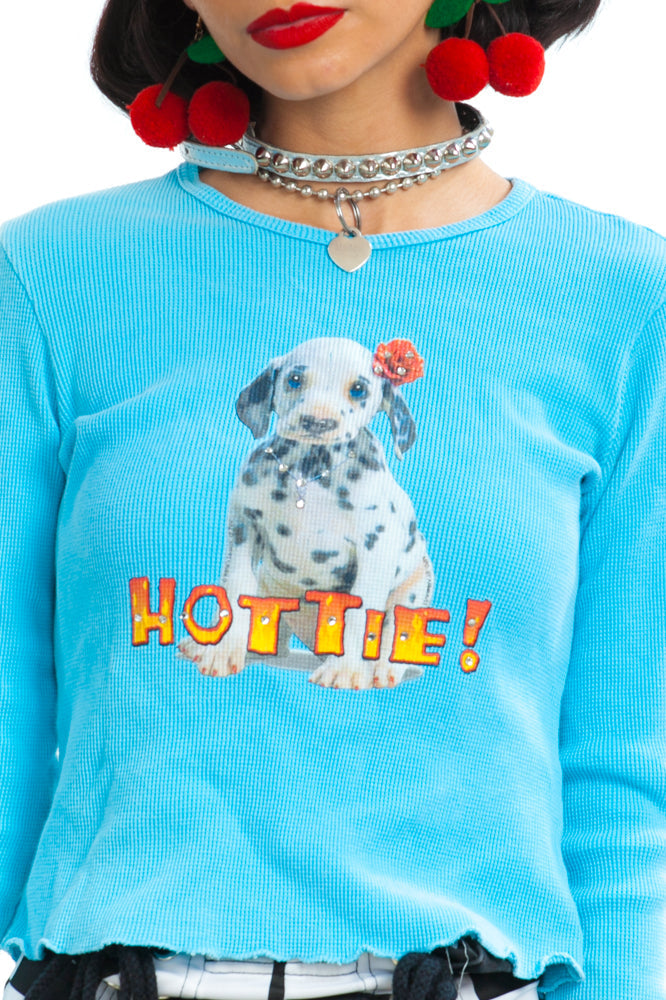 Blue thermal long-sleeve top with print on front of a dog with rhinestone appliques and flame text reading "Hottie!"