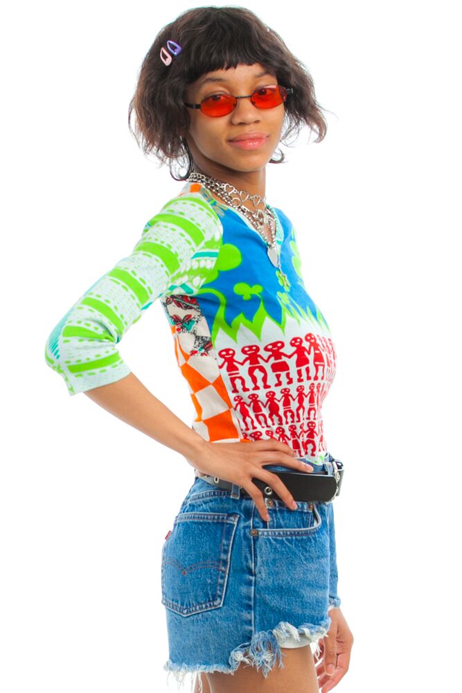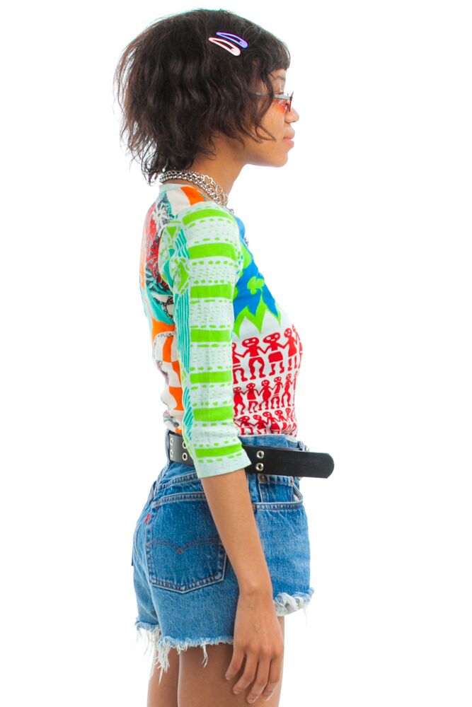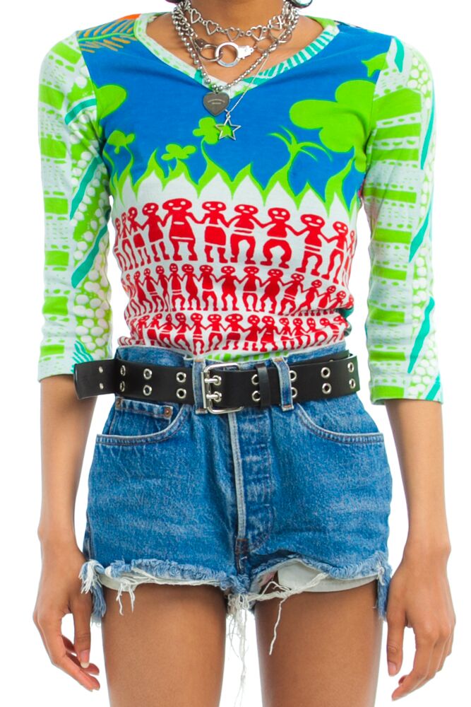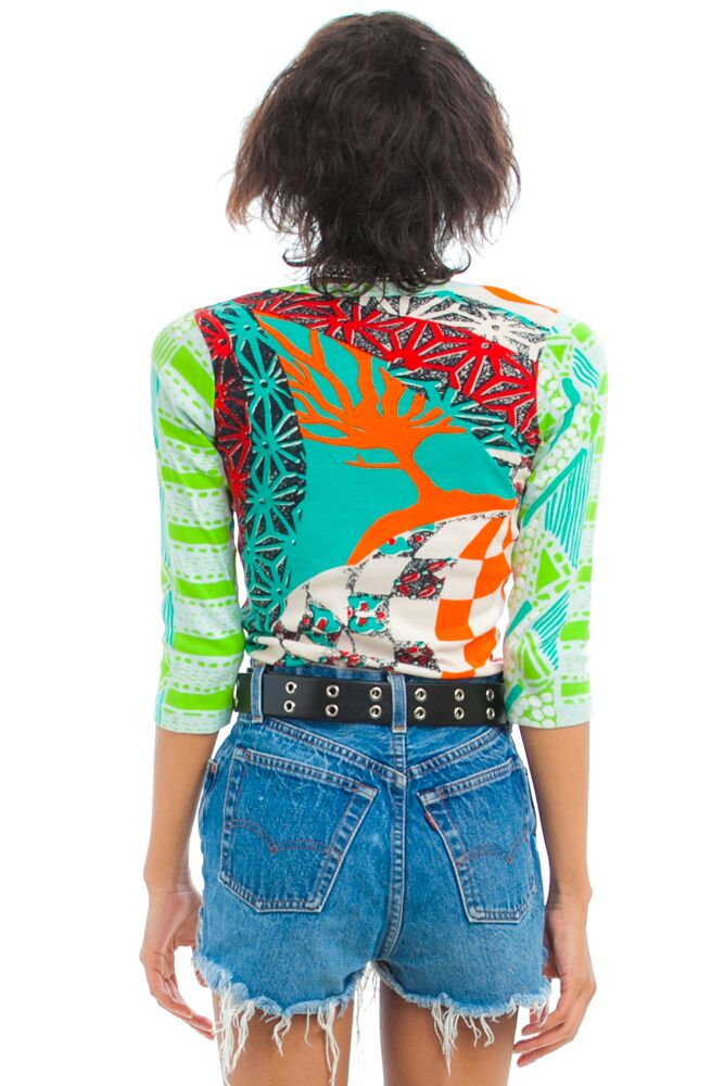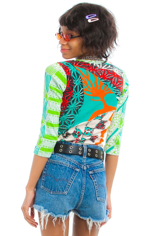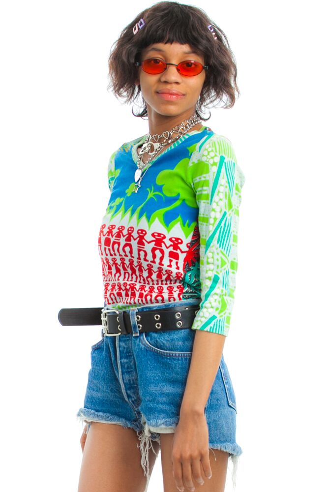 Half sleeved V-neck. Awesome artwork all over of people, plants, the sky and elements.