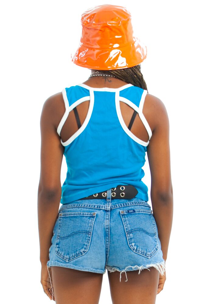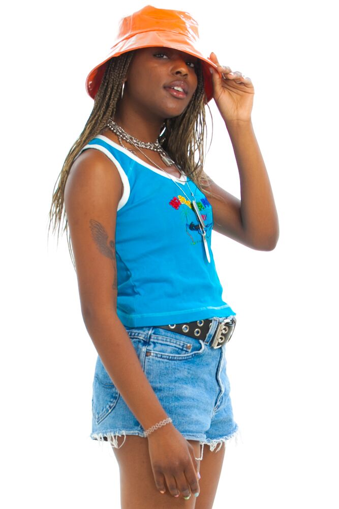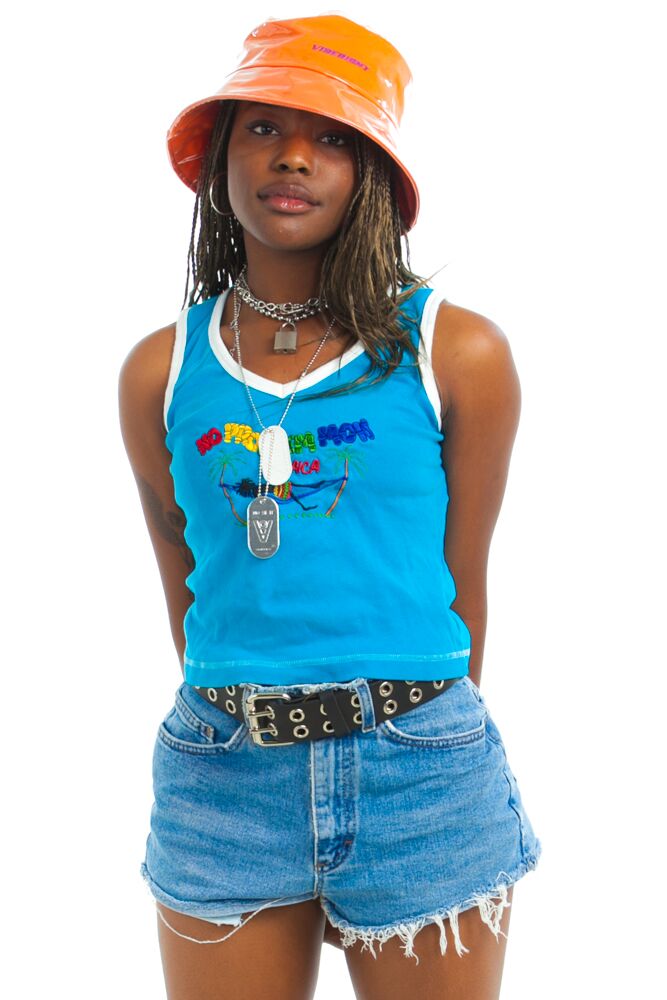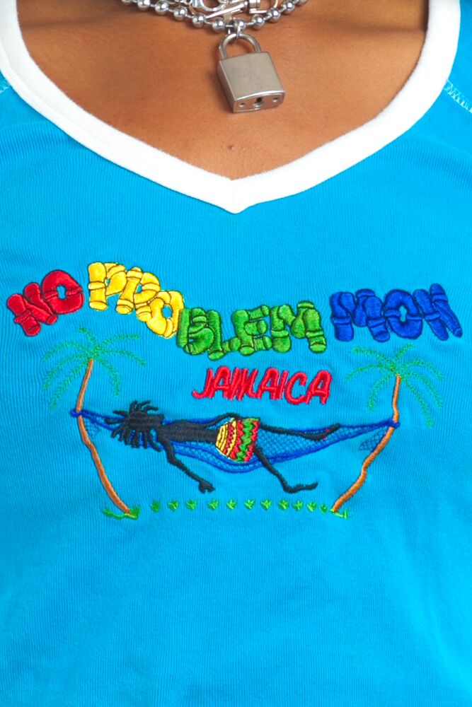 Bright blue tank top cool cutout design in the back! Embroidered in the front is a person relaxing in a hammock between two trees and it says in rainbow lettering " NO PROBLEM MON JAMAICA"