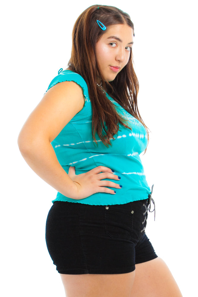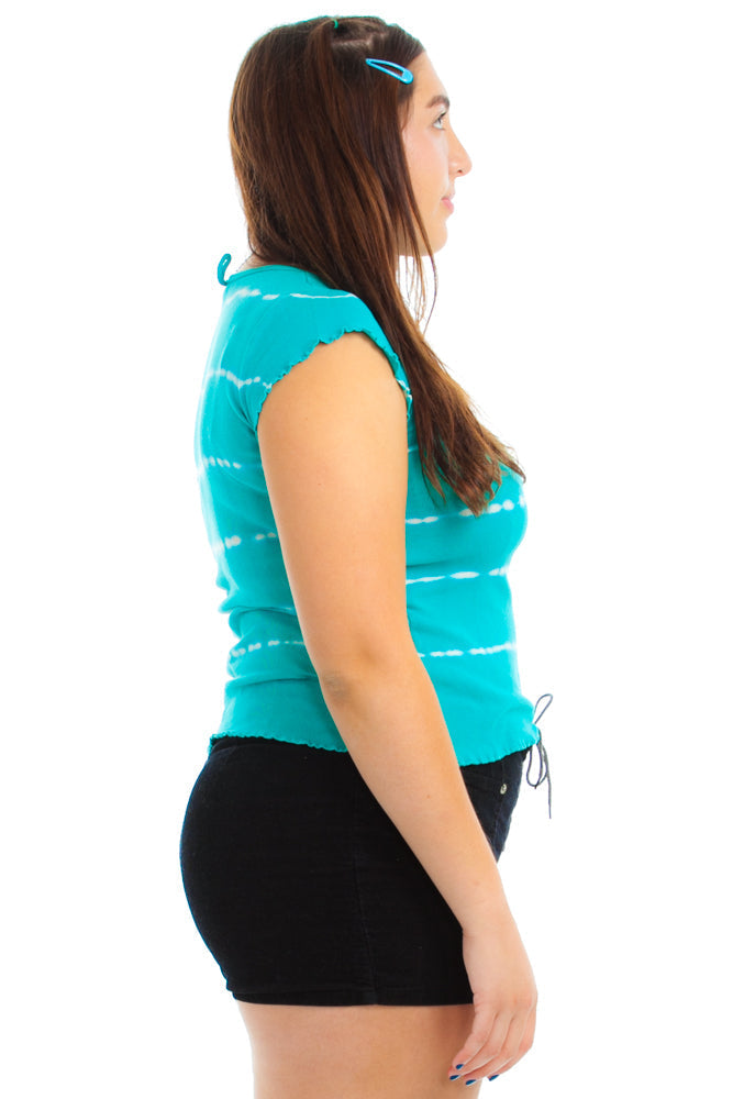 Turquoise and white tie dye baby tee with lettuce edge! Rhinestone studded peace sign on front.