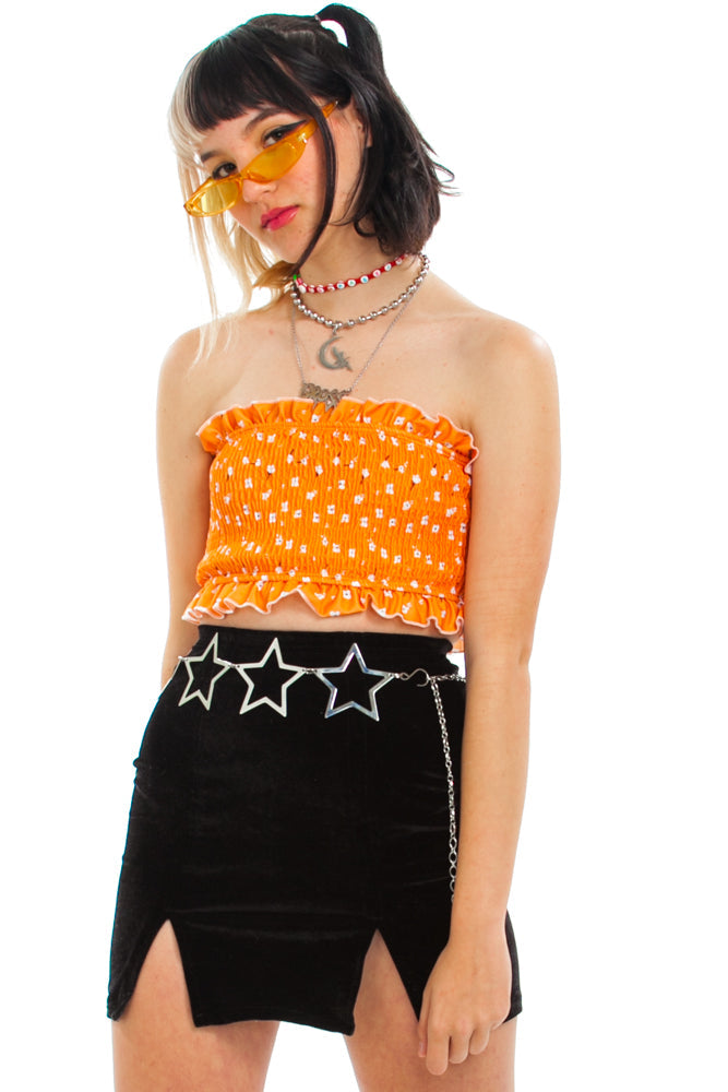 Tangerine orange ruched tube top with ruffle trim! Allover floral print.